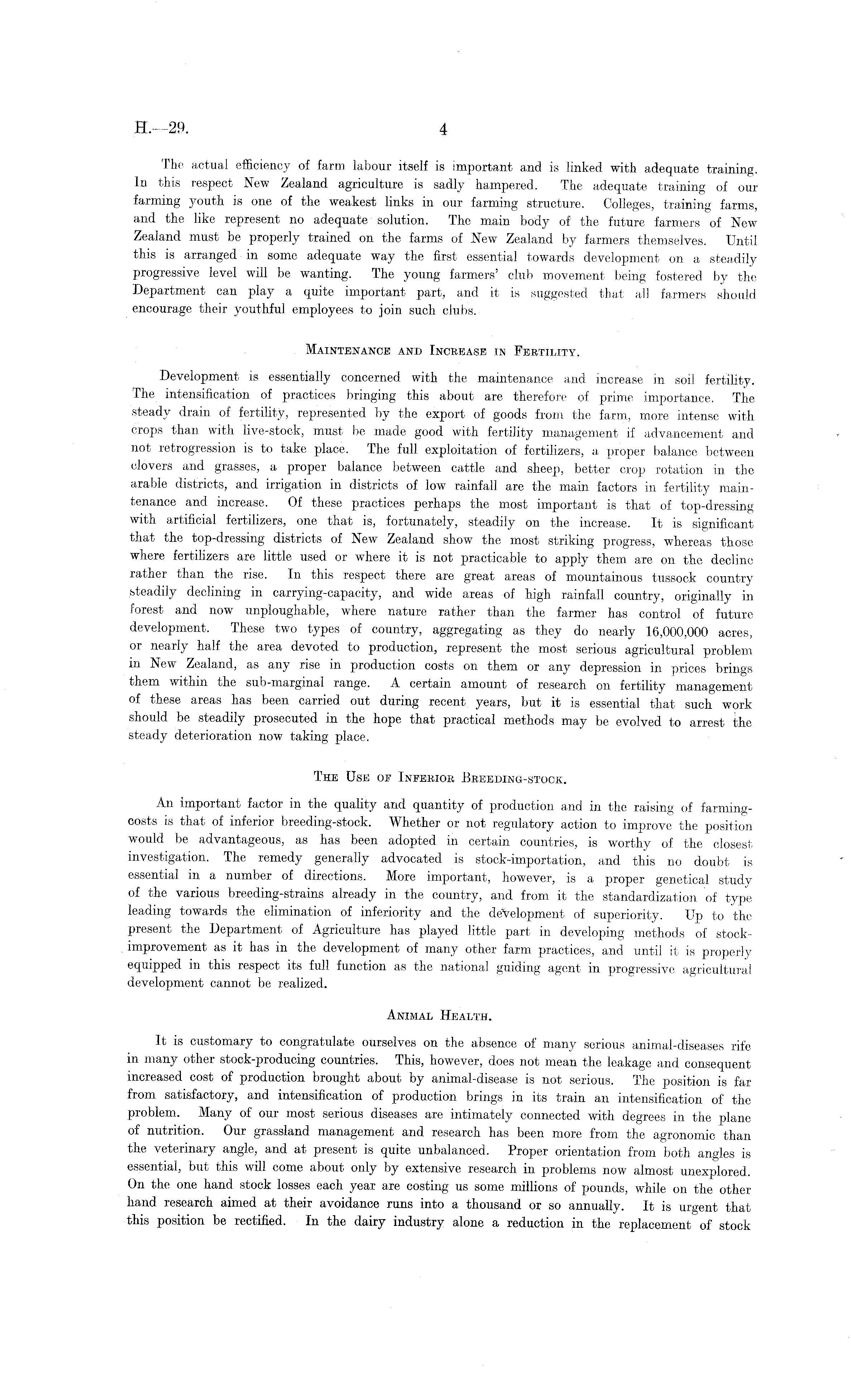 The actual efficiency of farm labour itself is important and is linked with adequate training. In this respect New Zealand agriculture is sadly hampered. The adequate training of our farming youth is one of the weakest links in our farming structure. Colleges, training farms, and the like represent no adequate solution. The main body of the future farmers of New Zealand must be properly trained on the farms of New Zealand by farmers themselves. Until this is arranged in some adequate way the first essential towards development on a steadily progressive level will be wanting. The young farmers' club movement being fostered by the Department can play a quite important part, and it is suggested that all farmers should encourage their youthful employees to join such clubs. Maintenance and Increase in Fertility. Development is essentially concerned with the maintenance and increase in soil fertility. The intensification of practices bringing this about are therefore of prime importance. The Steady drain of fertility, represented by the export of goods from the farm, more intense with crops than with live-stock, must be made good with fertility management if advancement and not retrogression is to take place. The full exploitation of fertilizers, a proper balance between clovers and grasses, a proper balance between cattle and sheep, better crop rotation in the arable districts, and irrigation in districts of low rainfall are the main factors in fertility maintenance and increase. Of these practices perhaps the most important is that of top-dressing with artificial fertilizers, one that is, fortunately, steadily on the increase. It is significant that the top-dressing districts of New Zealand show the most striking progress, whereas those where fertilizers are little used or where it is not practicable to apply them are on the decline rather than the rise. In this respect there are great areas of mountainous tussock country steadily declining in carrying-capacity, and wide areas of high rainfall country, originally in forest and now unploughable, where nature rather than the farmer has control of future development. These two types of country, aggregating as they do nearly 16,000,000 acres, or nearly half the area devoted to production, represent the most serious agricultural problem in New Zealand, as any rise in production costs on them or any depression in prices brings them within the sub-marginal range. A certain amount of research on fertility management of these areas has been carried out during recent years, but it is essential that such work should be steadily prosecuted in the hope that practical methods may be evolved to arrest the steady deterioration now taking place. The Use or Inferior Breeding-stock. An important factor m the quality and quantity of production and m the raising of farmingcosts is that of inferior breeding-stock. Whether or not regulatory action to improve the position would be advantageous, as has been adopted in certain countries, is worthy of the closest investigation. The remedy generally advocated is stock-importation, and this no doubt is essential in a number of directions. More important, however, is a proper genetical study of the various breeding-strains already in the country, and from it the standardization of type leading towards the elimination of inferiority and the development of superiority. Up to the present the Department of Agriculture has played little part in developing methods of stockimprovement as it has in the development of many other farm practices, and until it is properly equipped in this respect its full function as the national guiding agent in progressive agricultural development cannot be realized. Animal Health. It is customary to congratulate ourselves on the absence of many serious animal-diseases rife in many other stock-producing countries. This, however, does not mean the leakage and consequent increased cost of production brought about by animal-disease is not serious. The position is far from satisfactory, and intensification of production brings in its train an intensification of the problem. Many of our most serious diseases are intimately connected with degrees in the plane of nutrition. Our grassland management and research has been more from the agronomic than the veterinary angle, and at present is quite unbalanced. Proper orientation from both angles is essential, but this will come about only by extensive research in problems now almost unexplored. On the one hand stock losses each year are costing us some millions of pounds, while on the other hand research aimed at their avoidance runs into a thousand or so annually. It is urgent that this position be rectified. In the dairy industry alone a reduction in the replacement of stock