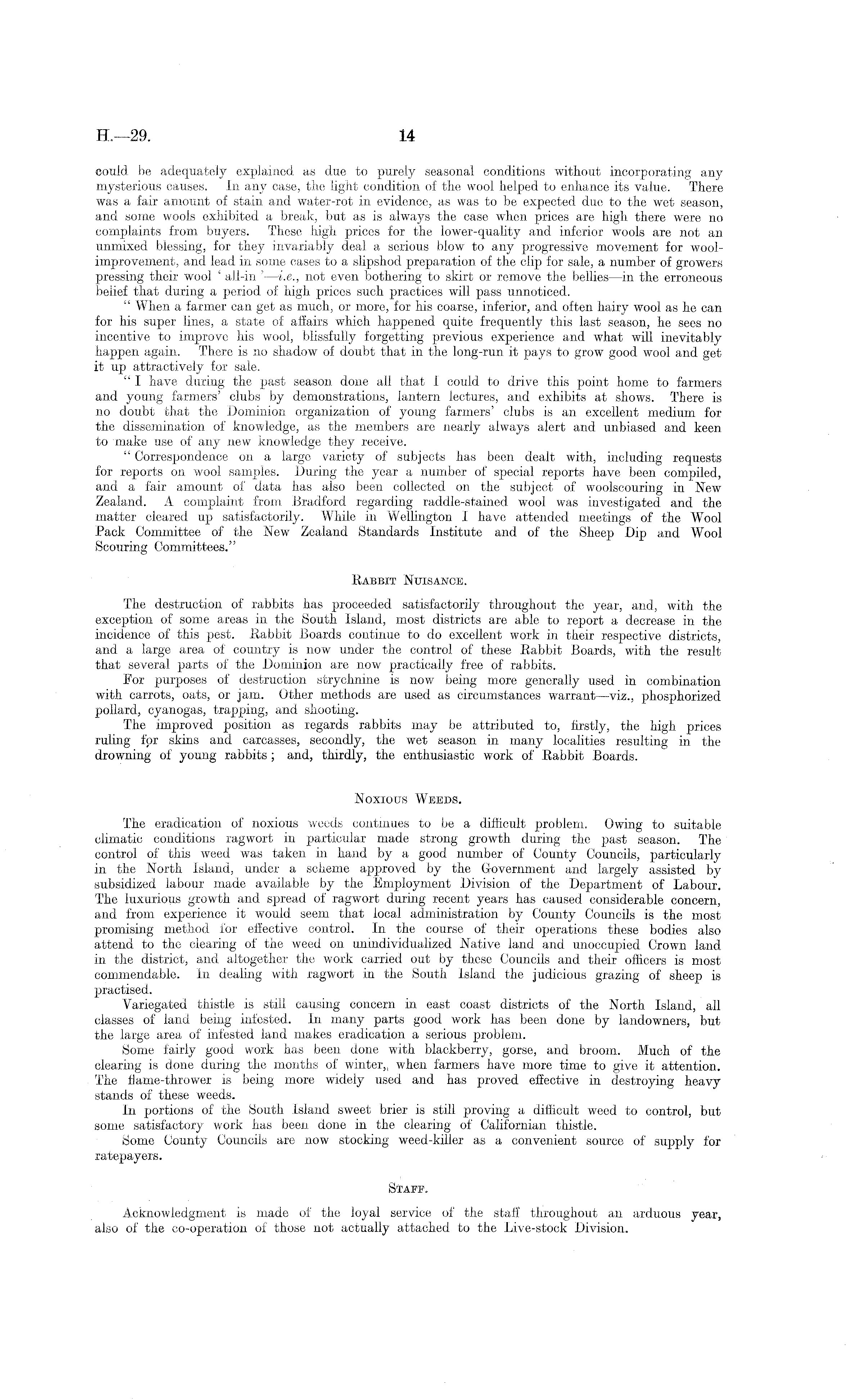 could be adequately explained as due to purely seasonal conditions without incorporating any mysterious causes. In any case, the light condition of the wool helped to enhance its value. There was a fair amount of stain and water-rot in evidence, as was to be expected due to the wet season, and some wools exhibited a break, but as is always the case when prices are high there were no complaints from buyers. These high prices for the lower-quality and inferior wools are not an unmixed blessing, for they invariably deal a serious blow to any progressive movement for woolimprovement, and lead in some cases to a slipshod preparation of the clip for sale, a number of growers pressing their wool ' all-in ' —i.e., not even bothering to skirt or remove the bellies —in the erroneous belief that during a period of high prices such practices will pass unnoticed. " When a farmer can get as much, or more, for his coarse, inferior, and often hairy wool as he can for his super lines, a state of affairs which happened quite frequently this last season, he sees no incentive to improve his wool, blissfully forgetting previous experience and what will inevitably happen again. There is no shadow of doubt that in the long-run it pays to grow good wool and get it up attractively for sale. " I have during the past season done all that 1 could to drive this point home to farmers and young farmers' clubs by demonstrations, lantern lectures, and exhibits at shows. There is no doubt that the Dominion organization of young farmers' clubs is an excellent medium for the dissemination of knowledge, as the members are nearly always alert and unbiased and keen to make use of any new knowledge they receive. " Correspondence on a large variety of subjects has been dealt with, including requests for reports on wool samples. During the year a number of special reports have been compiled, and a fair amount of data has also been collected on the subject of woolscouring in New Zealand. A complaint from Bradford regarding raddle-stained wool was investigated and the matter cleared up satisfactorily. While in Wellington I have attended meetings of the Wool Pack Committee of the New Zealand Standards Institute and of the Sheep Dip and Wool Scouring Committees." Rabbit Nuisance. The destruction of rabbits has proceeded satisfactorily throughout the year, and, with the exception of some areas in the South Island, most districts are able to report a decrease in the incidence of this pest. Rabbit Boards continue to do excellent work in their respective districts, and a large area of country is now under the control of these Rabbit Boards, with the result that several parts of the Dominion are now practically free of rabbits. For purposes of destruction strychnine is now being more generally used in combination with carrots, oats, or jam. Other methods are used as circumstances warrant —viz., phosphorized pollard, cyanogas, trapping, and shooting. The improved position as regards rabbits may be attributed to, firstly, the high prices ruling for skins and carcasses, secondly, the wet season in many localities resulting in the drowning of young rabbits ; and, thirdly, the enthusiastic work of Rabbit Boards. Noxious Weeds. The eradication of noxious weeds continues to be a difficult problem. Owing to suitable climatic conditions ragwort in particular made strong growth during the past season. The control of this weed was taken in hand by a good number of County Councils, particularly in the North Island, under a scheme approved by the Government and largely assisted by subsidized labour made available by the Employment Division of the Department of Labour. The luxurious growth and spread of ragwort during recent years has caused considerable concern, and from experience it would seem that local administration by County Councils is the most promising method for effective control. In the course of their operations these bodies also attend to the clearing of the weed on unindividualized Native land and unoccupied Crown land in the district, and altogether the work carried out by these Councils and their officers is most commendable. In dealing with ragwort in the South Island the judicious grazing of sheep is practised. Variegated thistle is still causing concern in east coast districts of the North Island, all classes of land being infested. In many parts good work has been done by landowners, but the large area of infested land makes eradication a serious problem. Some fairly good work has been done with blackberry, gorse, and broom. Much of the clearing is done during the months of winter,, when farmers have more time to give it attention. The flame-thrower is being more widely used and has proved effective in destroying heavy stands of these weeds. In portions of the South Island sweet brier is still proving a difficult weed to control, but some satisfactory work has been done in the clearing of Californian thistle. Some County Councils are now stocking weed-killer as a convenient source of supply for ratepayers. StAPF. Acknowledgment is made of the loyal service of the staff throughout an arduous year, also of the co-operation of those not actually attached to the Live-stock Division.