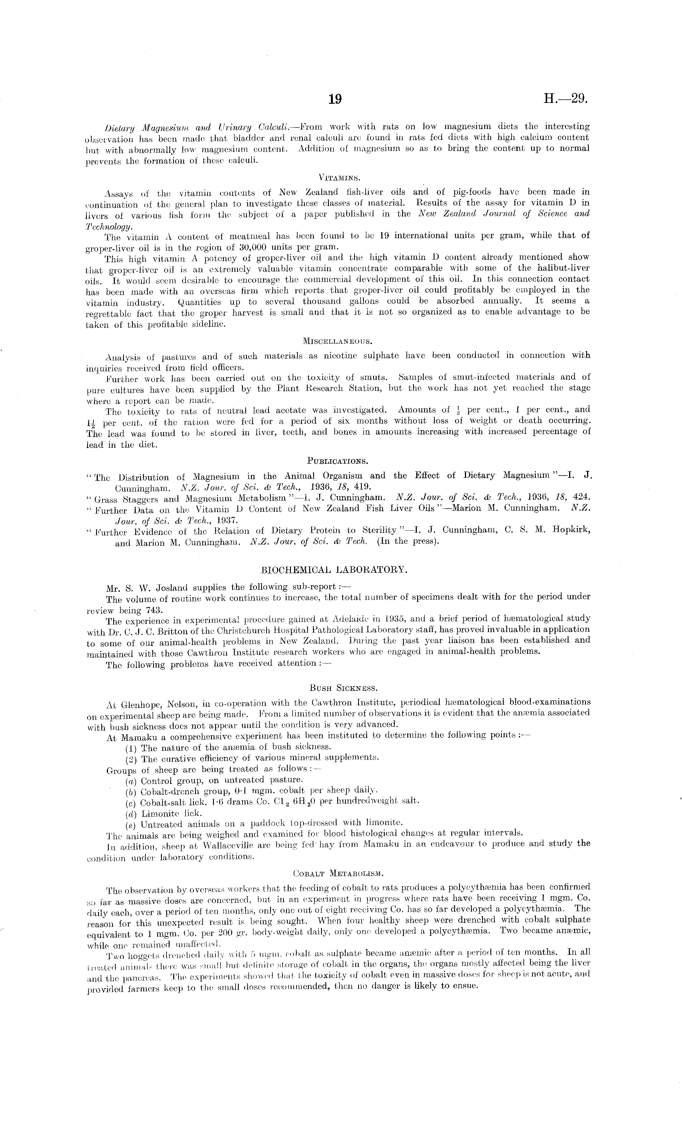 Dietary Magnesium and Urinary Calculi. —From work with rats on low magnesium diets the interesting observation has been made that bladder and renal calculi are found hi rats fed diets with high calcium content but with abnormally low magnesium content. Addition of magnesium so as to bring the content up to normal prevents the formation of these calculi. Vitamins. Assays of the vitamin contents of New Zealand fish-liver oils and of pig-foods have been made in continuation of the general plan to investigate these classes of material. Results of the assay for vitamin D in livers of various fish form the subject of a paper published in the New Zealand Journal of Science and Technology. The vitamin A content of meatmeal has been found to be 19 international units per gram, while that of groper-liver oil is in the region of 30,000 units per gram. This high vitamin A potency of groper-liver oil and the high vitamin D content already mentioned show that groper-liver oil is an extremely valuable vitamin concentrate comparable with some of the halibut-liver oils. It would seem desirable to encourage the commercial development of this oil. In this connection contact has been made with an overseas firm which reports that groper-liver oil could profitably be employed in the vitamin industry. Quantities up to several thousand gallons could be absorbed annually. It seems a regrettable fact that the groper harvest is small and that it is not so organized as to enable advantage to be taken of this profitable sideline. Miscellaneous. Analysis of pastures and of such materials as nicotine sulphate have been conducted in connection with inquiries received from field officers. Further work has been carried out 011 the toxicity of smuts. Samples of smut-infected materials and of pure cultures have been supplied by the Plant Research Station, but the work has not yet reached the stage where a report can be made. The toxicity to rats of neutral lead acetate was investigated. Amounts of | per cent., 1 per cent., and li per cent, of the ration were fed for a period of six months without loss of weight or death occurring. The lead was found to be stored in liver, teeth, and bones in amounts increasing with increased percentage of lead in the diet. Publications. " The Distribution of Magnesium in the Animal Organism and the Effect of Dietary Magnesium"—l. J. Cunningham. N.Z. Jour, of Sci. & Tech., 1936, 18, 419. "Grass Staggers and Magnesium Metabolism" —I. J. Cunningham. N.Z. Jour, of Sci. & Tech., 1936, 18, 424. " Further Data on the Vitamin D Content of New Zealand Fish Liver Oils "-—Marion M. Cunningham. N.Z. Jour, of Sci. & Tech., 1937. " Further Evidence of the Relation of Dietary Protein to Sterility"—l. J. Cunningham, C. S. M. Hopkirk, and Marion M. Cunningham. N.Z. Jour, of Sci. & Tech. (In the press). BIOCHEMICAL LABORATORY. Mr. S. W. Josland supplies the following sub-report: — The volume of routine work continues to increase, the total number of specimens dealt with for the period under review being 743. The experience in experimental procedure gained at Adelaide in 1935, and a brief period of hematological study with Dr. C. J. C. Britton of the Christehurch Hospital Pathological Laboratory staff, has proved invaluable in application to some of our animal-health problems in New Zealand. During the past year liaison has been established and maintained with those Cawthron Institute research workers who are engaged in animal-health problems. The following problems have received attention : — Bush Sickness. At Glenhope, Nelson, in co-operation with the Cawthron Institute, periodical hematological blood-examinations oh experimental sheep are being made. From a limited number of observations it is evident that the anemia associated with bush sickness does not appear until the condition is very advanced. At Mamaku a comprehensive experiment has been instituted to determine the following points : — (1) The nature of the anemia of bush sickness. (2) The curative efficiency of various mineral supplements. Groups of sheep are being treated as follows : — (a) Control group, on untreated pasture. (b) Cobalt-drench group, 0-1 mgm. cobalt per sheep daily. (c) Cobalt-salt lick, 1-6 drams Co. Cl 2 6H a 0 per hundredweight salt. (d) Limonite lick. (e) Untreated animals on a paddock top-dressed with limonite. The animals are being weighed and examined for blood histological changes at regular intervals. In addition, sheep at Wallaceville are being fed hay from Mamaku in an endeavour to produce and study the condition under laboratory conditions. Cobalt Metabolism. The observation by overseas workers that the feeding of cobalt to rats produces a polycythemia has been confirmed so far as massive doses are concerned, but in an experiment in progress where rats have been receiving 1 mgm. Co. daily each, over a period of ten months, only one out of eight receiving Co. has so far developed a polycythemia. The reason for this unexpected result is being sought. When four healthy sheep were drenched with cobalt sulphate equivalent to 1 mgm. Co. per 200 gr. body-weight daily, only one developed a polycythfemia. Two became anaemic, while one remained unaffected. Two hoggets drenched daily with 5 mgm. cobalt as sulphate became anemic after a period of ten months. In all treated animals there was small but definite storage of cobalt in the organs, the organs mostly affected being the liver and the pancreas. The experiments showed that the toxicity of cobalt even in massive doses for sheep is not acute, and provided farmers keep to the small doses recommended, then no danger is likely to ensue.