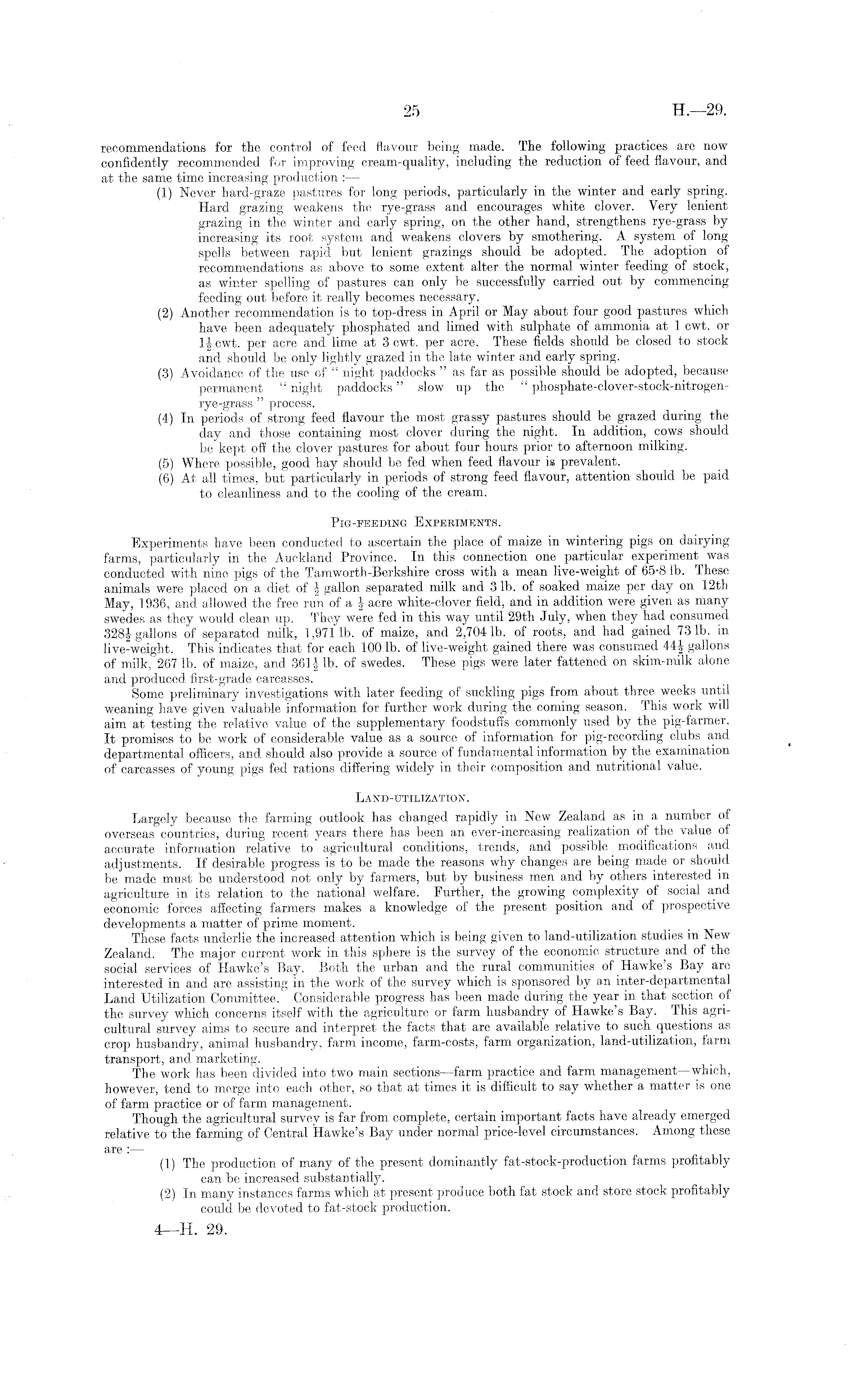 recommendations for the control of feed flavour being made. The following practices are now confidently recommended for improving cream-quality, including the reduction of feed flavour, and at the same time increasing production : — (1) Never hard-graze pastures for long periods, particularly in the winter and early spring. Hard grazing weakens the rye-grass and encourages white clover. Very lenient grazing in the winter and early spring, on the other hand, strengthens rye-grass by increasing its. root system and weakens clovers by smothering. A system of long spells between rapid but lenient grazings should be adopted. The adoption of recommendations as above to some extent alter the normal winter feeding of stock, as winter spelling of pastures can only be successfully carried out by commencing feeding out before it really becomes necessary. (2) Another recommendation is to top-dress in April or May about four good pastures which have been adequately phosphated and limed with sulphate of ammonia at 1 cwt. or 1 \ cwt. per acre and lime at 3 cwt. per acre. These fields should be closed to stock and should be only lightly grazed in the late winter and early spring. (3) Avoidance of the use of " night paddocks " as far as possible should be adopted, because permanent " night paddocks" slow up the " phosphate-clover-stock-nitrogen-rye-grass " process. (4) In periods of strong feed flavour the most grassy pastures should be grazed during the day and those containing most clover during the night. In addition, cows should be"kept off the clover pastures for about four hours prior to afternoon milking. (5) Where possible, good hay should be fed when feed flavour is prevalent. (6) At all times, but particularly in periods of strong feed flavour, attention should be paid to cleanliness and to the cooling of the cream. Pig-feeding Experiments. Experiments have been conducted to ascertain the place of maize in wintering pigs on dairying farms, particularly in the Auckland Province. In this connection one particular experiment was conducted with nine pigs of the Tamworth-Berkshire cross with a mean live-weight of 65-8 lb. These animals were placed on a diet of i gallon separated milk and 3 lb. of soaked maize per day on 12th May, 1936, and allowed the free rnn of a \ acre white-clover field, and in addition were given as many swedes as they would clean up. They were fed in this way until 29th July, when they had consumed 328J gallons of separated milk, 1,9711b. of maize, and 2,7041b. of roots, and had gained 731b. in live-weight. This indicates that for each 100 lb. of live-weight gained there was consumed 44| gallons of milk, 267 lb. of maize, and 36H lb. of swedes. These pigs were later fattened on skim-milk alone and produced first-grade carcasses. Some preliminary investigations with later feeding of suckling pigs from about three weeks until weaning have given valuable information for further work during the coming season. This work will aim at testing the relative value of the supplementary foodstuffs commonly used by the pig-farmer. It promises to be work of considerable value as a source of information for pig-recording clubs a,nd departmental officers, and should also provide a source of fundamental information by the examination of carcasses of young pigs fed rations differing widely in their composition and nutritional value. Land-utilization. Largely because the farming outlook has changed rapidly in New Zealand as in a number of overseas countries, during recent years there has been an ever-increasing realization of the value of accurate information relative to agricultural conditions, trends, and possible modifications and adjustments. If desirable progress is to be made the reasons why changes are being made or should be made must be understood not only by farmers, but by business men and by others interested in agriculture in its relation to the national welfare. Further, the growing complexity of social and economic forces affecting farmers makes a knowledge of the present position and of prospective developments a matter of prime moment. These facts underlie the increased attention which is being given to land-utilization studies in New Zealand. The major current work in this sphere is the survey of the economic structure and of the social services of Hawke's Bay. Both the urban and the rural communities of Hawke's Bay are interested in and are assisting in the work of the survey which is sponsored by an inter-departmental Land Utilization Committee. Considerable progress has been made during the year in that section of the survey which concerns itself with the agriculture or farm husbandry of Hawke's Bay. This agricultural survey aims to secure and interpret the facts that are available relative to such questions as crop husbandry, animal husbandry, farm income, farm-costs, farm organization, land-utilization, farm transport, and marketing. The work lias been divided into two main sections —farm practice and farm management —which, however, tend to merge into each other, so that at times it is difficult to say whether a matter is one of farm practice or of farm management. Though the agricultural survey is far from complete, certain important facts have already emerged relative to the farming of Central Hawke's Bay under normal price-level circumstances. Among these are : — (1) The production of many of the present dominantly fat-stock-production farms profitably can be increased substantially. (2) In many instances farms which at present produce both fat stock and store stock profitably could be devoted to fat-stock production.