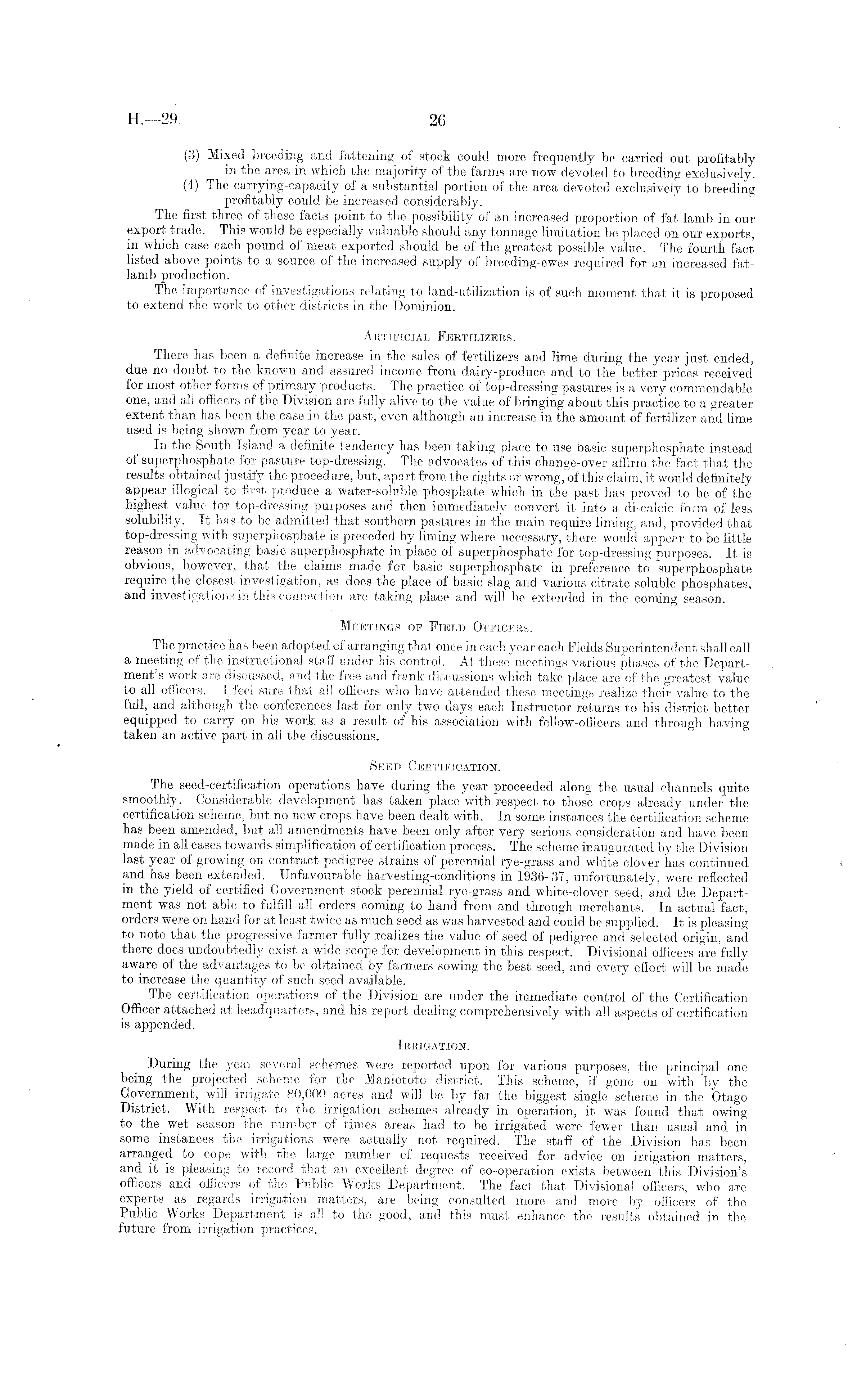 (3) Mixed breeding and fattening of stock could more frequently be carried out profitably in the area in which the majority of the farms are now devoted to breeding exclusively. (4) The carrying-capacity of a substantial portion of the area devoted exclusively to breeding profitably could be increased considerably. The first three of these facts point to the possibility of an increased proportion of fat lamb in our export trade. This would be, especially valuable should any tonnage limitation be placed on our exports, in which case each pound of meat exported should be of the greatest possible value. The fourth fact listed above points to a source of the increased supply of breeding-ewes required for an increased fatlamb production. The importance of investigations relating to land-utilization is of such moment that it is proposed to extend the work to other districts in the Dominion. Artificial Fertilizers. There has been a definite increase in the sales of fertilizers and lime during the year just ended, due no doubt to the known and assured income from dairy-produce and to the better prices received for most other forms of primary products. The practice of top-dressing pastures is a very commendable one, and all officers of the Division are fully alive to the value of bringing about this practice to a 1 greater extent than has been the case in the past, even although an increase in the amount of fertilizer and lime used is being shown from year to year. In the South Island a definite tendency has been taking place to use basic superphosphate instead of superphosphate for pasture top-dressing. The advocates of this change-over affirm the fact that the results obtained justify the procedure, but, apart from the rights or wrong, of this claim, it would definitely appear illogical to first produce a water-soluble phosphate which in the past has proved to be of the highest value for top-dressing purposes and then immediately convert it into a di-calcic form of less solubility. It has to be admitted that southern pastures in the main require liming, and, provided that top-dressing with superphosphate is preceded by liming where necessary, there would appear to be little reason in advocating basic superphosphate in place of superphosphate, for top-dressing purposes. It is obvious, however, that the claims made for basic superphosphate in preference to superphosphate require the closest investigation, as does the place of basic slag and various citrate soluble phosphates, and investigations in this connection are taking place and will be extended in the coming season. Meetings of Field Officers. The practice has been adopted of arranging that once in each year each Fields Superintendent shall call a meeting of the instructional staff under his control. At these meetings various phases of the Department's work are discussed, and the free and frank discussions which take place are of the greatest value to all officers. I feel sure that all officers who have attended these meetings realize their value to the full, and although the conferences last for only two days each Instructor returns to his district better equipped to carry on his work as a result of his association with fellow-officers and through having taken an active part in all the discussions. Seed Certification. The seed-certification operations have during the year proceeded along the usual channels quite smoothly. Considerable development has taken place with respect to those crops already under the certification scheme, but no new crops have been dealt with. In some instances the certification scheme has been amended, but all amendments have been only after very serious consideration and have been made in all cases towards simplification of certification process. The scheme inaugurated by the Division last year of growing on contract pedigree strains of perennial rye-grass and white clover has continued and has been extended. Unfavourable harvesting-conditions in 1936-37, unfortunately, were reflected in the yield of certified Government stock perennial rye-grass and white-clover seed, and the Department was not able to fulfill all orders coming to hand from and through merchants. In actual fact, orders were on hand for at least twice as much seed as was harvested and could be supplied. It is pleasing to note that the progressive farmer fully realizes the value of seed of pedigree and selected origin, and there does undoubtedly exist a wide scope for development in this respect. Divisional officers are fully aware of the advantages to be obtained by farmers sowing the best seed, and every effort will be made to increase the quantity of such seed available. The certification operations of the Division are under the immediate control of the Certification Officer attached at headquarters, and his report dealing comprehensively with all aspects of certification is appended. Irrigation. During the year several schemes were reported upon for various purposes, the principal one being the projected scheme for the Maniototo district. This scheme, if gone on with by the Government, will irrigate 80,000 acres and will be by far the biggest single scheme in the Otago District. With respect to the irrigation schemes already in operation, it was found that owing to the_ wet season the number of times areas had to be irrigated were fewer than usual and in some instances the irrigations were actually not required. The staff of the Division has been arranged to cope with the large number of requests received for advice on irrigation matters, and it is pleasing to record that an excellent degree of co-operation exists between this Division's officers and officers of the Public Works Department. The fact that Divisional officers, who are experts as regards irrigation matters, are being consulted more and more by officers of the Public Works Department is all to the good, and this must enhance the results obtained in the future from irrigation practi
