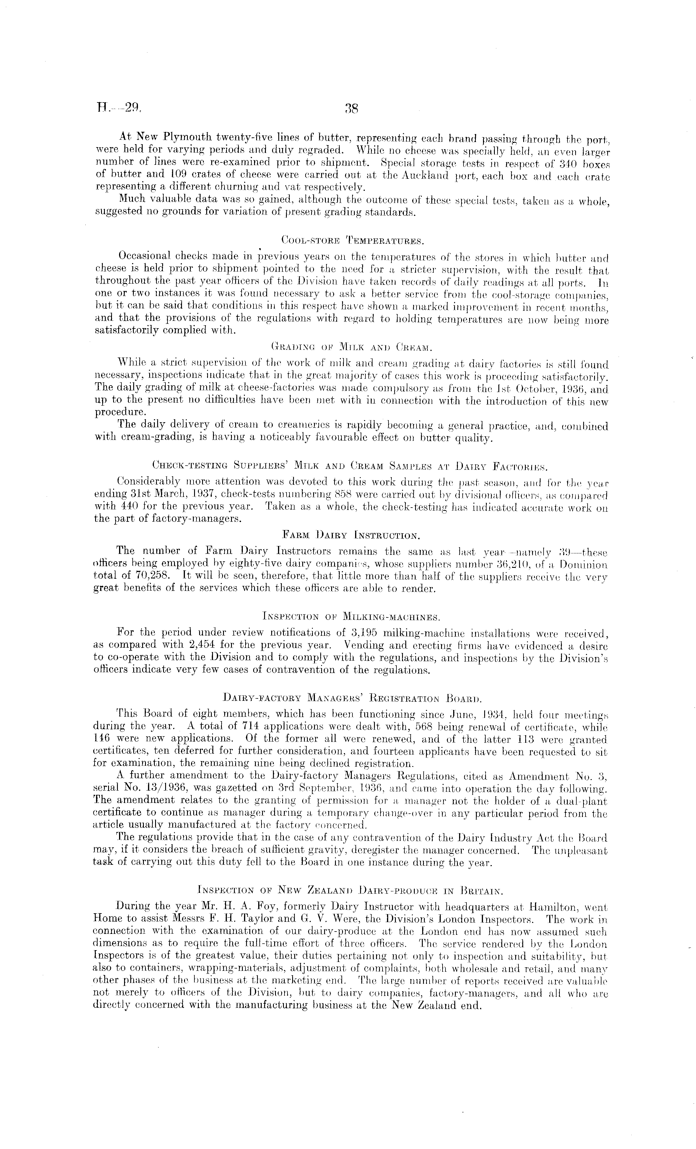 At New Plymouth twenty-five lines of butter, representing each brand passing through the port, were held for varying periods and duly regraded. While no cheese was specially held, an even krger number of lines were re-examined prior to shipment. Special storage tests in respect of 340 boxes of butter and 109 crates of cheese were carried out at the Auckland port, each box and .each crate representing a different churning and vat respectively. Much valuable data was so gained, although the outcome of these special tests, taken as a whole, suggested no grounds for variation of present grading standards. Cool-store Temperatures. Occasional checks made in previous years on the temperatures of the stores in which butter and cheese is held prior to shipment pointed to the need for a stricter supervision, with the result that throughout the past year officers of the Division have taken records of daily readings at all ports. In one or two instances it was found necessary to ask a better service from the cool-storage companies, but it can be said that conditions in this respect have shown a marked improvement in recent months, and that the provisions of the regulations with regard to holding temperatures are now being more satisfactorily complied with. Grading of Milk and Cream. While a strict supervision of the work of milk and cream grading at dairy factories is still found necessary, inspections indicate that in the great majority of cases this work is proceeding satisfactorily. The daily grading of milk at cheese-factories was made compulsory as from the Ist October, 1936, and up to the present no difficulties have been met with m connection with the introduction of this new procedure. The daily delivery of cream to creameries is rapidly becoming a general practice, and, combined with cream-grading, is having a noticeably favourable effect on butter quality. Check-testing Suppliers' Milk and Cream Samples at Dairy Factories. Considerably more attention was devoted to this work during the past season, and for the year ending 31st March, 1937, check-tests numbering 858 were carried out by divisional officers, as compared with 440 for the previous year. Taken as a whole, the check-testing has indicated accurate work on the part of factory-managers. Farm Dairy Instruction. The number of Farm Dairy Instructors remains the same as last year —namely 39—these officers being employed by eighty-five dairy companies, whose suppliers number 36,210, of a Dominion total of 70,258. It will be seen, therefore, that little more than half of the suppliers receive the very great benefits of the services which these officers are able to render. Inspection of Milking-machines. For the period under review notifications of 3,195 milking-machine installations were received, as compared with 2,454 for the previous year. Vending and erecting firms have evidenced a desire to co-operate with the Division and to comply with the regulations, and inspections by the Division's officers indicate very few cases of contravention of the regulations. Dairy-factory Managers' Registration Board. This Board of eight members, which has been functioning since June, 1934, held four meetings during the year. A total of 714 applications were dealt with, 568 being renewal of certificate, while 146 were new applications. Of the former all were renewed, and of the latter 113 were granted certificates, ten deferred for further consideration, and fourteen applicants have been requested to sit for examination, the remaining nine being declined registration. A further amendment to the Dairy-factory Managers Regulations, cited as Amendment No. 3, serial No. 13/1936, was gazetted on 3rd September, 1936, and came into operation the day following. The amendment relates to the granting of permission for a manager not the holder of a dual-plant certificate to continue as manager during a temporary change-over in any particular period from the article usually manufactured at the factory concerned. The regulations provide that in the case of any contravention of the Dairy Industry Act the Board may, if it considers the breach of sufficient gravity, deregister the manager concerned. The unpleasant task of carrying out this duty fell to the Board in one instance during the year. Inspection of New Zealand Dairy-produce in Britain. During the year Mr. H. A. Foy, formerly Dairy Instructor with headquarters at Hamilton, went Home to assist Messrs F. H. Taylor and G. V. Were, the Division's London Inspectors. The work in connection with the examination of our dairy-produce at the London end has now assumed such dimensions as to require the full-time effort of three officers. The service rendered by the London Inspectors is of the greatest value, their duties pertaining not only to inspection and suitability, but also to containers, wrapping-materials, adjustment of complaints, both wholesale and retail, and many other phases of the business at the marketing end. The large number of reports received are valuable not merely to officers of the Division, but to dairy companies, factory-managers, and all who are directly concerned with the manufacturing business at the New Zealand end.