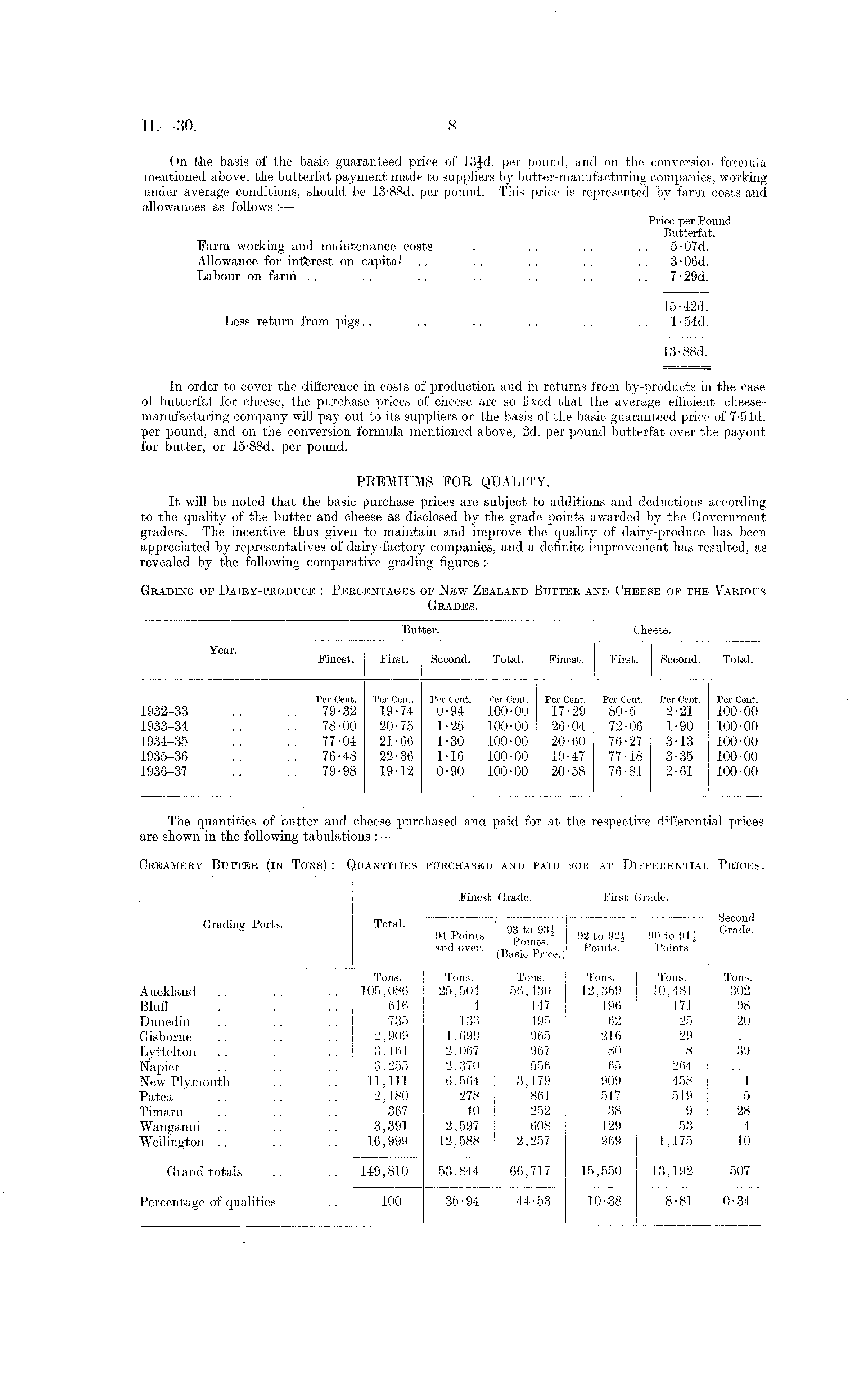 Butter. Cheese. Finest. First. Second. Total. Finest. First. Second. Total. Per Cent. Per Cent. Per Cent. Per Cent. Per Cent. Per Cent. Per Cent. Per Cent. 1932-33 .. .'. 79-32 19-74 0-94 100-00 17-29 80-5 2-21 100-00 1933-34 .. .. 78-00 20-75 1-25 100-00 26-04 72-06 1-90 100-00 1934-35 .. .. 77-04 21-66 1-30 100-00 20-60 76-27 3-13 100-00 1935-36 .. .. 76-48 22-36 1-16 100-00 19-47 77-18 3-35 100-00 1936-37 .. .. 79-98 19-12 0-90 100-00 20-58 76-81 2-61 100-00