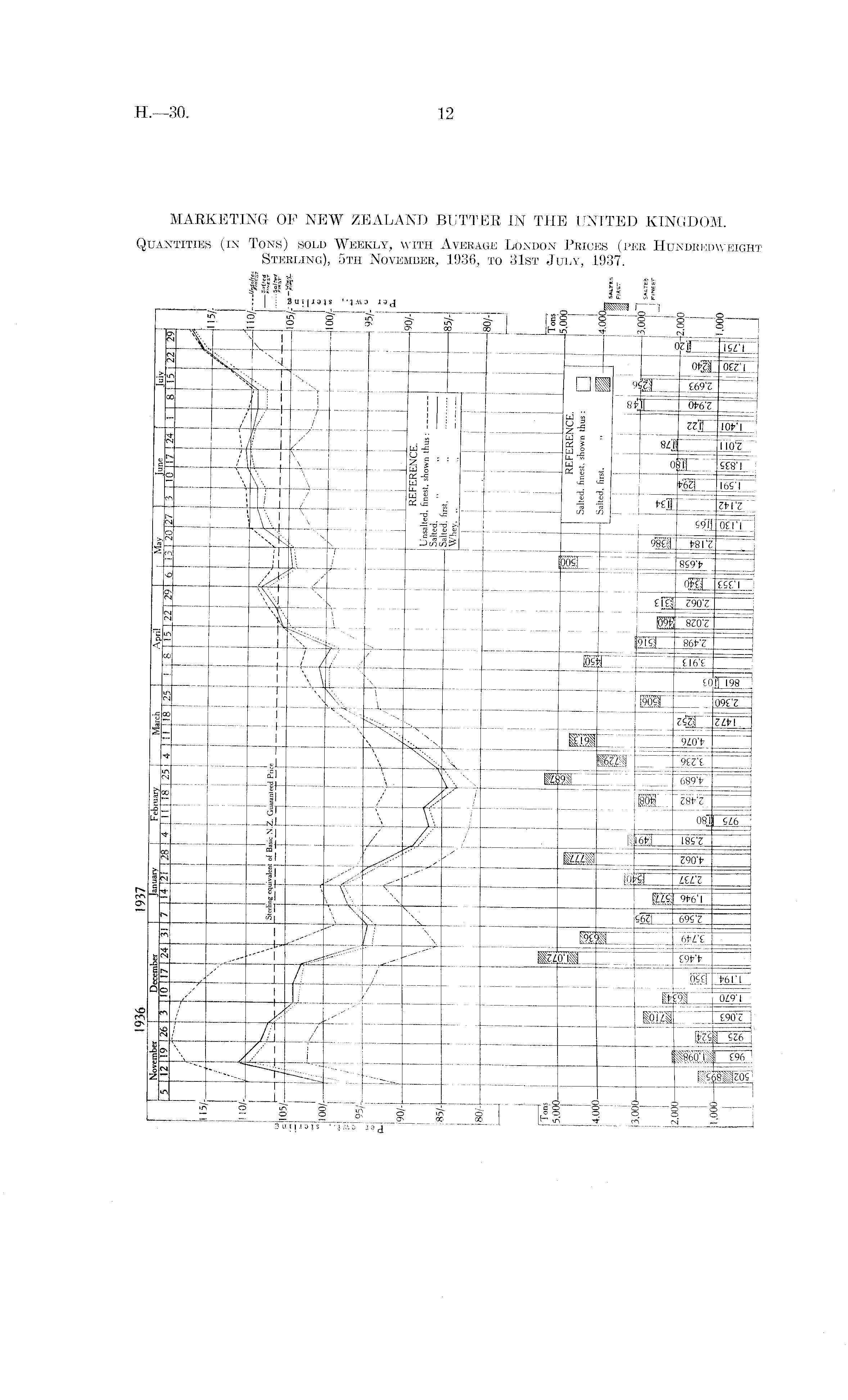 MARKETING OF NEW ZEALAND BUTTER IN THE UNITED KINGDOM. Quantities (in Tons) sold Weekly, with Average London Prices (per Hundredweight Sterling), 5th November, 1936, to 31st July, 1937.