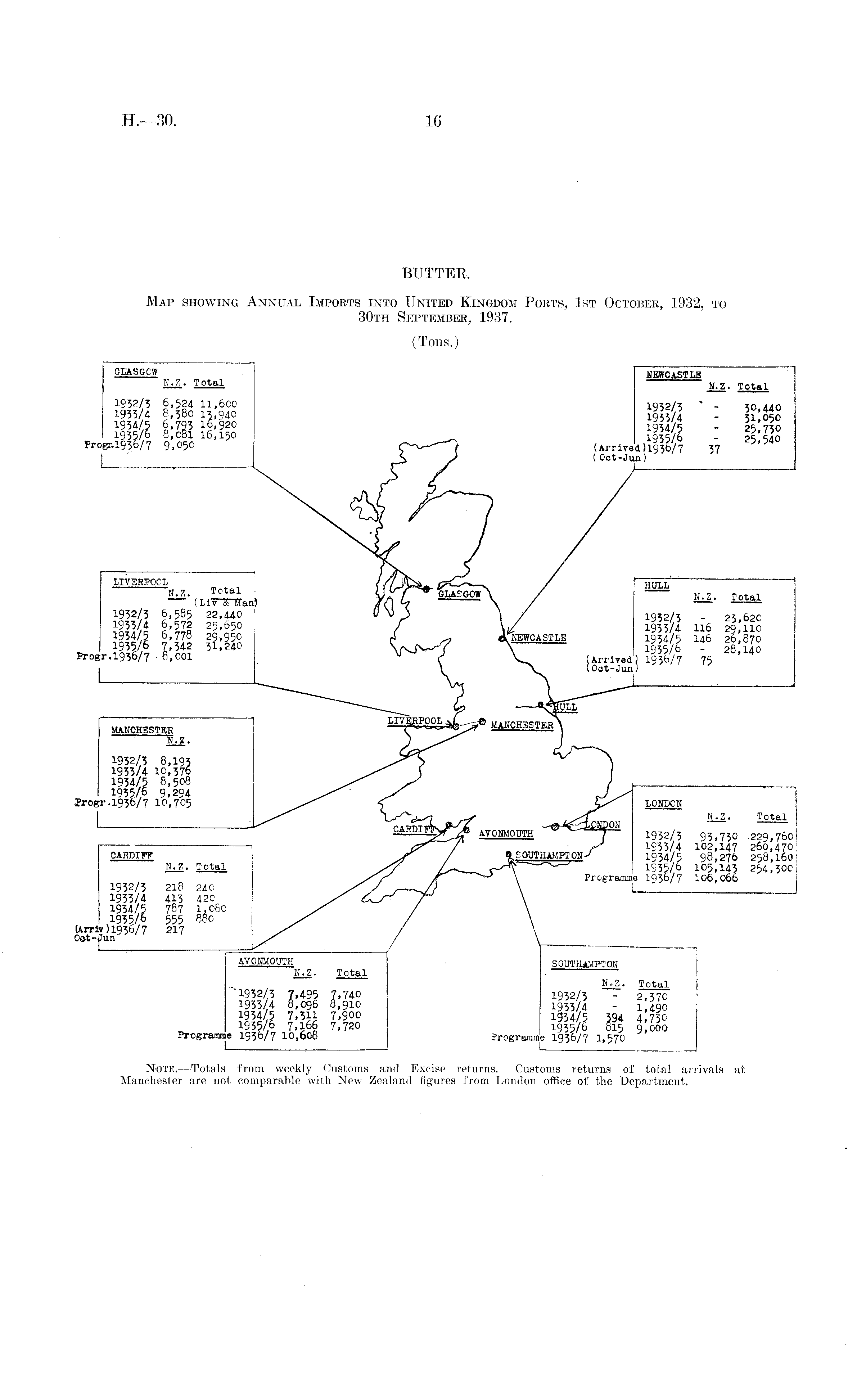 BUTTER. Map showing Annual Imports into United Kingdom Ports, 1st October, 1932, to 30th September, 1937.