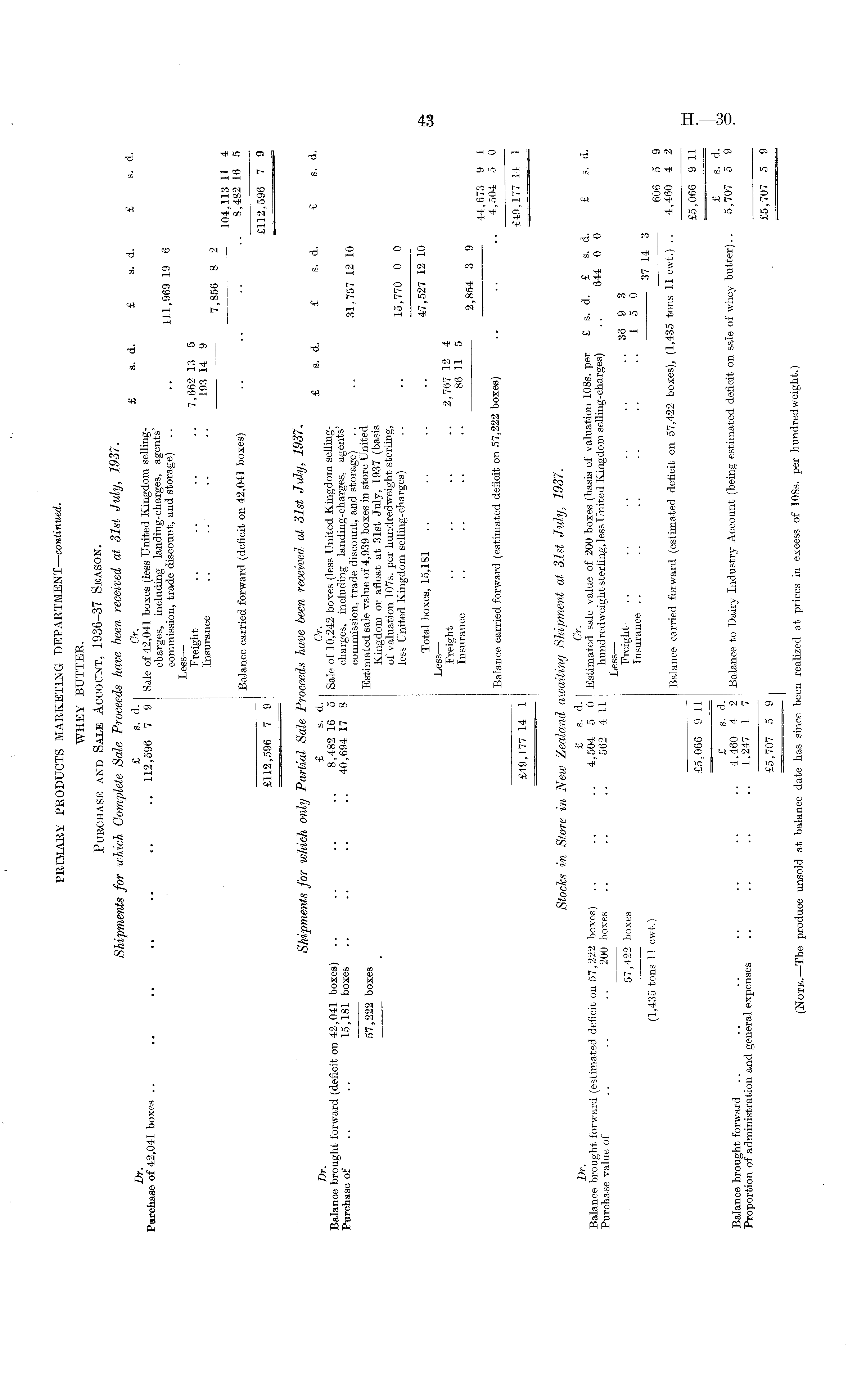 PRIMARY PRODUCTS MARKETING DEPARTMENT— continued. WHEY BUTTER. Purchase and Sale Account, 1936-37 Season. Shipments for which Complete Sale Proceeds have been received at 31st July, 193 <. Dr £ B. d. Or. £ a. d. £ s. d. £ s. d. Purchase 0f'42,041 boxes 112,596 7 9 Sale of 42,041 boxes ((less United Kingdom sellingcharges, including landing-charges, agents commission, trade discount, and storage) .. .. 111,969 19 o Less— Freight .. .. •• •• 7 > 662 13 5 Insurance . . • • 193 9 7,85 6 8 2 104,113 11 4 Balance carried forward (deficit on 42,041 boxes) .. .. •• 8,482 16 5 £112,596 7 9 £113 ' 596 7 9 Shipments for which only Partial Sale Proceeds have been received at 31st July, 1937. Dr £ s. d. Or. £ s. d. £ s. d. £ s. d. Balance brought forward (deficit on 42,041 boxes) 8,482 16 5 Sale of 10,242 boxes (less United Kingdom seUmgPurchaseof .. .. 15,181 boxes 40,694 17 8 charges, including landing-charges, agents „7*7 12 10 commission, trade discount, and storage) .. .. «>1, 101 la iu 57 222 boxes Estimated sale value of 4,939 boxes in store United ' . Kingdom or afloat at 31st July, 1937 (basis of valuation 107s. per hundredweight sterling, less United Kingdom selling-charges) .. .. 15,770 0 0 Total boxes, 15,181 .. •• •• •• 47,527 12 10 Less— Freight 2,767 12 4 IllSUranCe 2,854 3 9 44,673 9 1 Balance carried forward (estimated deficit on 57,222 boxes) .. .. •• 4,504 5 0 £49,177 14 1 £49,177 14 1 Stocks in Store in New Zealand awaiting Shipment at 31st July, 1937. Dr £ s - Or. , Balance brought forward (estimated deficit on 57,222 boxes) 4,504 5 0 Estimated sale value of 200 boxes (basis of valuation 108s. per £ s. d. £ s d £ s. a. Purchase value of .. .. 200 boxes .. .. .. 562 4 11 hundredweight sterling, less United Kmgdom selling-charges) .. 644 0 0 Less— 57,422 boxes Freight .. .. .. •• •• 'tin Insurance .. .. .. •• * 0 u (1,435 tons 11 cwt.) 60 g g g Balance carried forward (estimated deficit on 57,422 boxes), (1,435 tons 11 cwt.) .. 4,460 4 2 £5,066 9 11 £5,066 9 11 £ s. d. £ s ' Balance brought forward .. .. .. .. •• •• •• 4,460 4 2 Balance to Dairy Industry Account (being estimated deficit on sale of whey butter).. 5,707 5 9 Proportion of administration and general expenses .. .. .. •. 1,247 1 7 £5,707 5 9 . £5 > 707 5 9 (Note.— IThe1The produce unsold at balance date has since been realized at prices in excess of 108s. per hundredweight.)