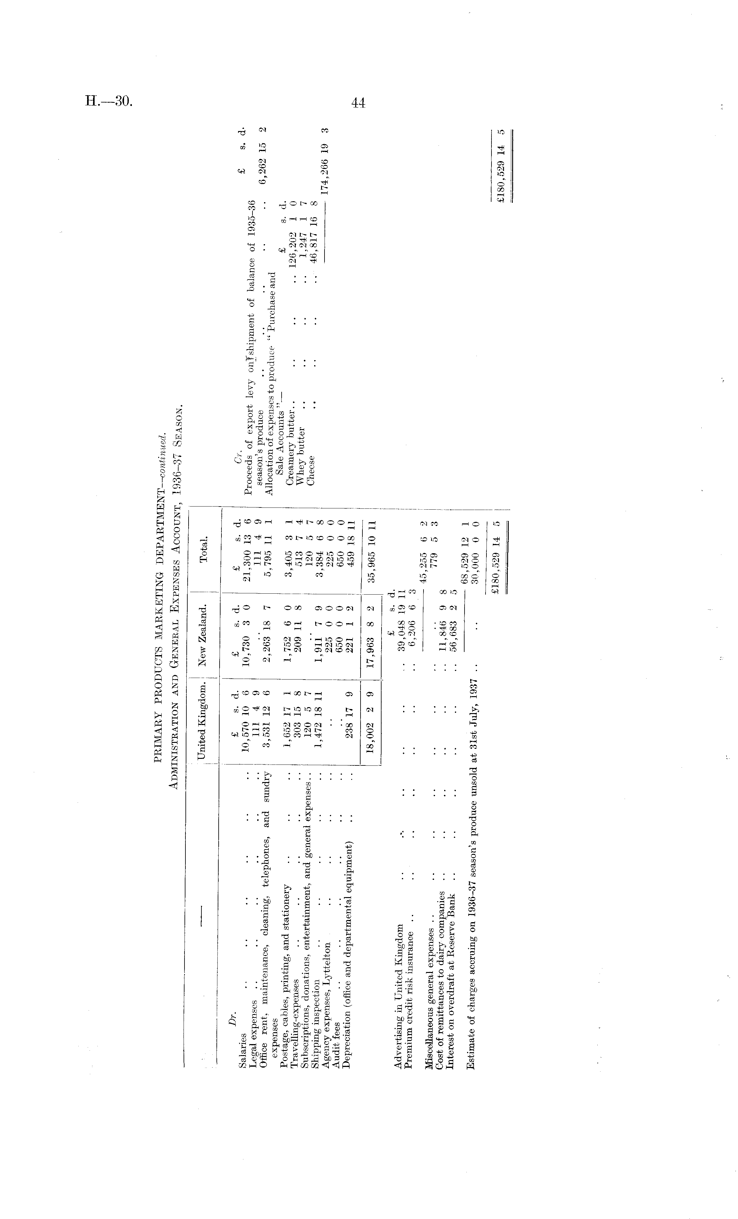 United Kingdom. New Zealand. Total. a i • Dr ' £ s. d. £ s. d. £ s. d. Cr. -P „ LegaTexpenses " ! 10 'm 9 10 > 730 3 0 21 '300 13 6 Proceeds of export levy onjshipment of balance of 1935-36 main ' :ena ' Ilce ' cleaning » telephones, and sundry 3,531 12 6 2,263'l8 7 5,795 11 1 Allocation of expenses to produce "Purchase and " " 6 ' 262 15 2 Postage, cables, printing, and stationery 1,652 17 1 1,752 6 0 3,405 3 1 Creamery Gutter' ~ & I 1i Travelling-expenses 303 15 8 209 11 8 513 7 4 Whey butter 1 947 } 7 subscriptions, donations, entertainment, and general expenses.. 120 5 7 .. 120 o 7 rwL " " " " A n'Zii, nn L Shipping inspection 1,472 18 11 1,911 7 9 3,384 6 8 46,817 16 8 Agency expenses, Lyttelton .. .. .. .. .. 225 0 0 225 0 0 i/4,zt>b iy 3 Audit fees .. .. .. .. .. 650 0 0 650 0 0 Depreciation (office and departmental equipment) .. . . 238 17 9 221 1 2 459 18 11 18,002 2 9 17,963 8 2 35,965 10 11 • • £ s. d. Advertismg m United Kingdom .. ... .. .. .. _ 39,048 19 11 Premium credit risk insurance .. .. .. .. .. .. .. 6 206 6 3 • - 45 255 6 2 Miscellaneous general expenses .. .. .. .. .. .. ,, _ _ ' 779 5 3 Cost of remittances to dairy companies .. .. .. .. .. ..11 846 9 8 Interest on overdraft at Reserve Bank .. .. .. .. ,, .. 56 683 2 5 gg 529 19 1 Estimate of charges accruing on 1936-37 season's produce unsold at 31st July, 1937 .. .. 30,'000 Ō 0 £180,529 14 5 £180,529 14 5