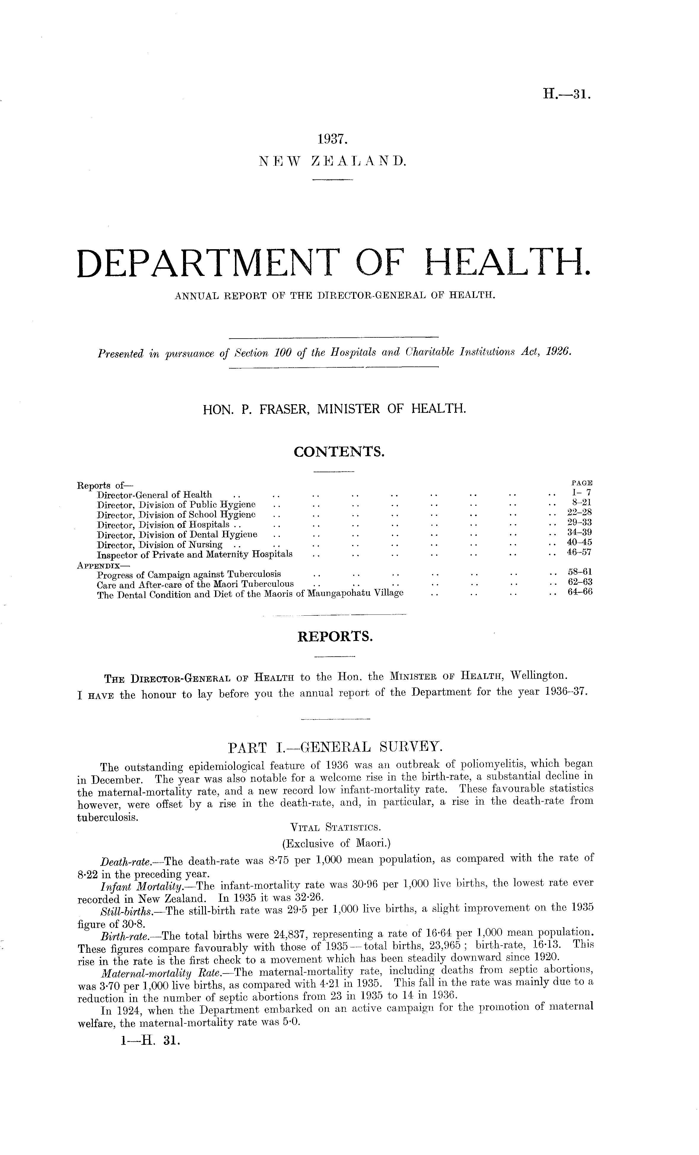 The Director-General of Health to the Hon. the Minister of Health, Wellington. I have the honour to lay before you the annual report of the Department for the year 1936-37.