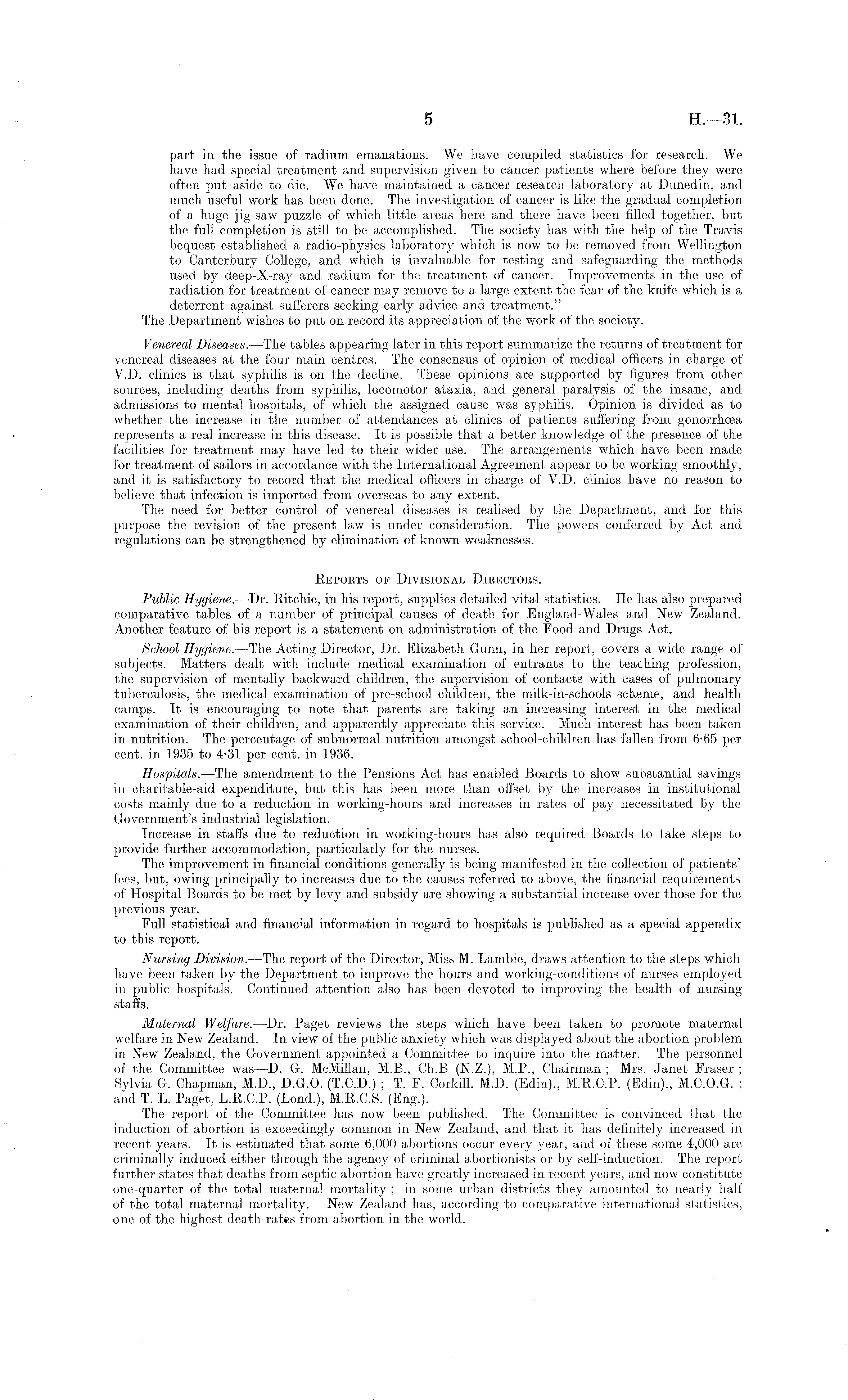 part in the issue of radium emanations. We have compiled statistics for research. We have had special treatment and supervision given to cancer patients where before they were often put aside to die. We have maintained a cancer research laboratory at Dunedin, and much useful work has been done. The investigation of cancer is like the gradual completion of a huge jig-saw puzzle of which little areas here and there have been filled together, but the full completion is still to be accomplished. The society has with the help of the Travis bequest established a radio-physics laboratory which is now to be removed from Wellington to Canterbury College, and which is invaluable for testing and safeguarding the methods used by deep-X-ray and radium for the treatment of cancer. Improvements in the use of radiation for treatment of cancer may remove to a large extent the fear of the knife which is a deterrent against sufferers seeking early advice and treatment." The Department wishes to put on record its appreciation of the work of the society. Venereal Diseases. —The tables appearing later in this report summarize the returns of treatment for venereal diseases at the four main centres. The consensus of opinion of medical officers in charge of V.D. clinics is that Syphilis is on the decline. These opinions are supported by figures from other sources, including deaths from syphilis, locomotor ataxia, and general paralysis of the insane, and admissions to mental hospitals, of which the assigned cause was syphilis. Opinion is divided as to whether the increase in the number of attendances at clinics of patients suffering from gonorrhoea represents a real increase in this disease. It is possible that a better knowledge of the presence of the facilities for treatment may have led to their wider use. The arrangements which have been made for treatment of sailors in accordance with the International Agreement appear to be working smoothly, and it is satisfactory to record that the medical officers in charge of V.I), clinics have no reason to believe that infection is imported from overseas to any extent. The need for better control of venereal diseases is realised by the Department, and for this purpose the revision of the present law is under consideration. The powers conferred by Act and regulations can be strengthened by elimination of known weaknesses. Reports of Divisional Directors. Public Hygiene. —Dr. Ritchie, in his report, supplies detailed vital statistics. He has also prepared comparative tables of a number of principal causes of death for England-Wales and New Zealand. Another feature of his report is a statement on administration of the Food and Drugs Act. School Hygiene. —The Acting Director, Dr. Elizabeth Gunn, in her report, covers a wide range of subjects. Matters dealt with include medical examination of entrants to the teaching profession, the supervision of mentally backward, children, the supervision of contacts with cases of pulmonary tuberculosis, the medical examination of pre-school children, the milk-in-schools scheme, and health camps. It is encouraging to note that parents are taking an increasing interest in the medical examination of their children, and apparently appreciate this service. Much interest has been taken in nutrition. The percentage of subnormal nutrition amongst school-children has fallen from 6-65 per cent, in 1935 to 4-31 per cent, in 1936. Hospitals. —The amendment to the Pensions Act has enabled Boards to show substantial savings in charitable-aid expenditure, but this has been more than offset by the increases in institutional costs mainly due to a reduction in working-hours and increases in rates of pay necessitated by the Government's industrial legislation. Increase in staffs due to reduction in working-hours has also required Boards to take steps to provide further accommodation, particularly for the nurses. The improvement in financial conditions generally is being manifested in the collection of patients' fees, but, owing principally to increases due to the causes referred to above, the financial requirements of Hospital Boards to be met by levy and subsidy are showing a substantial increase over those for the previous year. Full statistical and financial information in regard to hospitals is published as a special appendix to this report. Nursing Division. —The report of the Director, Miss M. Lambie, draws attention to the steps which have been taken by the Department to improve the hours and working-conditions of nurses employed in public hospitals. Continued attention also has been devoted to improving the health of nursing staffs. Maternal Welfare. —Dr. Paget reviews the steps which have been taken to promote maternal welfare in New Zealand. In view of the public anxiety which was displayed about the abortion problem in New Zealand, the Government appointed a Committee to inquire into the matter. The personnel of the Committee was—D. G. McMillan, M.8., Ch.B (N.Z.), M.P., Chairman ; Mrs. Janet Fraser ; Sylvia G. Chapman, M.D., D.G.O. (T.C.D.) ; T. F. Corkill. M.D. (Edin)., M.R.C.P. (Edin)., M.C.O.G. ; and T. L. Paget, L.R.C.P. (Lond.), M.R.C.S. (Eng.). The report of the Committee has now been published. The Committee is convinced that the induction of abortion is exceedingly common in New Zealand, and that it has definitely increased in recent years. It is estimated that some 6,000 abortions occur every year, and of these some 4,000 are criminally induced either through the agency of criminal abortionists or by self-induction. The report further states that deaths from septic abortion have greatly increased in recent years, and now constitute one-quarter of the total maternal mortality ; in some urban districts they amounted to nearly half of the total maternal mortality. New Zealand has, according to comparative international statistics, one of the highest death-rates from abortion in the world.