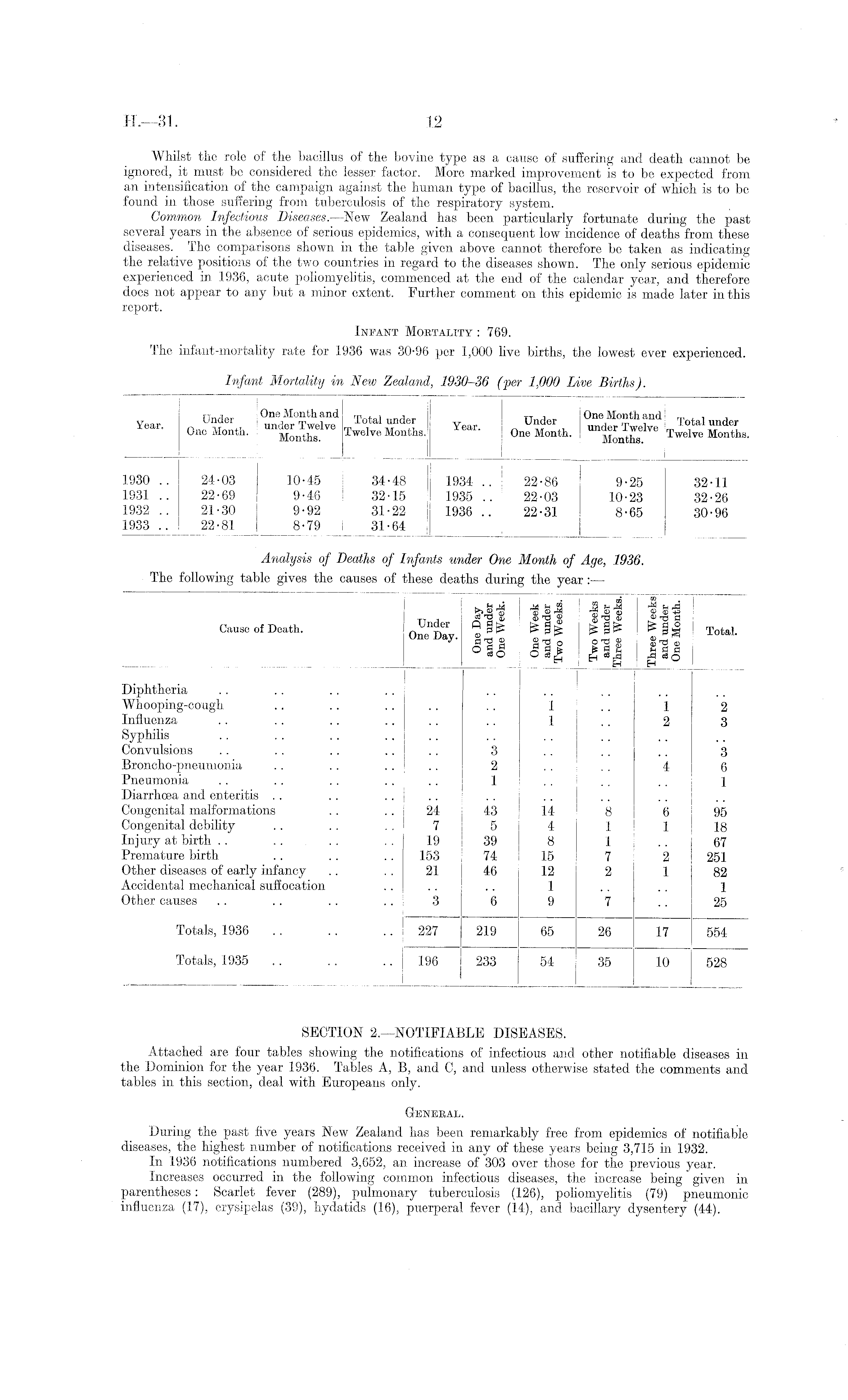 Whilst the role of the bacillus of the bovine type as a cause of suffering and death cannot be ignored, it must be considered the lesser factor. More marked improvement is to be expected from an intensification of the campaign against the human type of bacillus, the reservoir of which is to be found in those suffering from tuberculosis of the respiratory system. Common Infectious Diseases. —New Zealand has been particularly fortunate during the past several years in the absence of serious epidemics, with a consequent low incidence of deaths from these diseases. The comparisons shown in the table given above cannot therefore be taken as indicating the relative positions of the two countries in regard to the diseases shown. The only serious epidemic experienced in 1936, acute poliomyelitis, commenced, at the end of the calendar year, and therefore does not appear to any but a minor extent. Further comment on this epidemic is made later in this report. Infant Moetality : 769. The infant-mortality rate for 1936 was 30-96 per 1,000 live births, the lowest ever experienced.