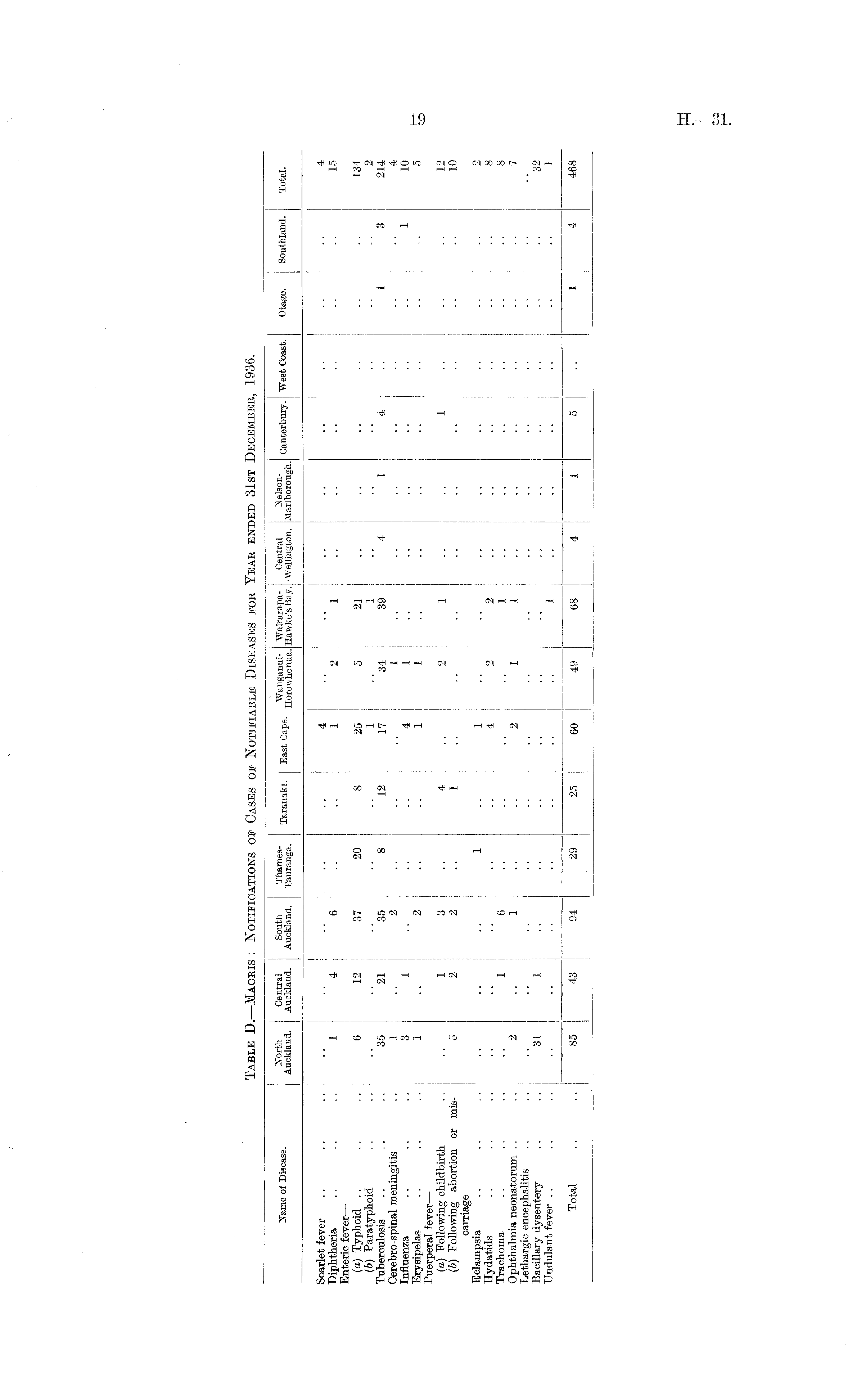 Table D.—Maoris: Notifications of Cases of Notifiable Diseases for Year ended 31st December, 1936.