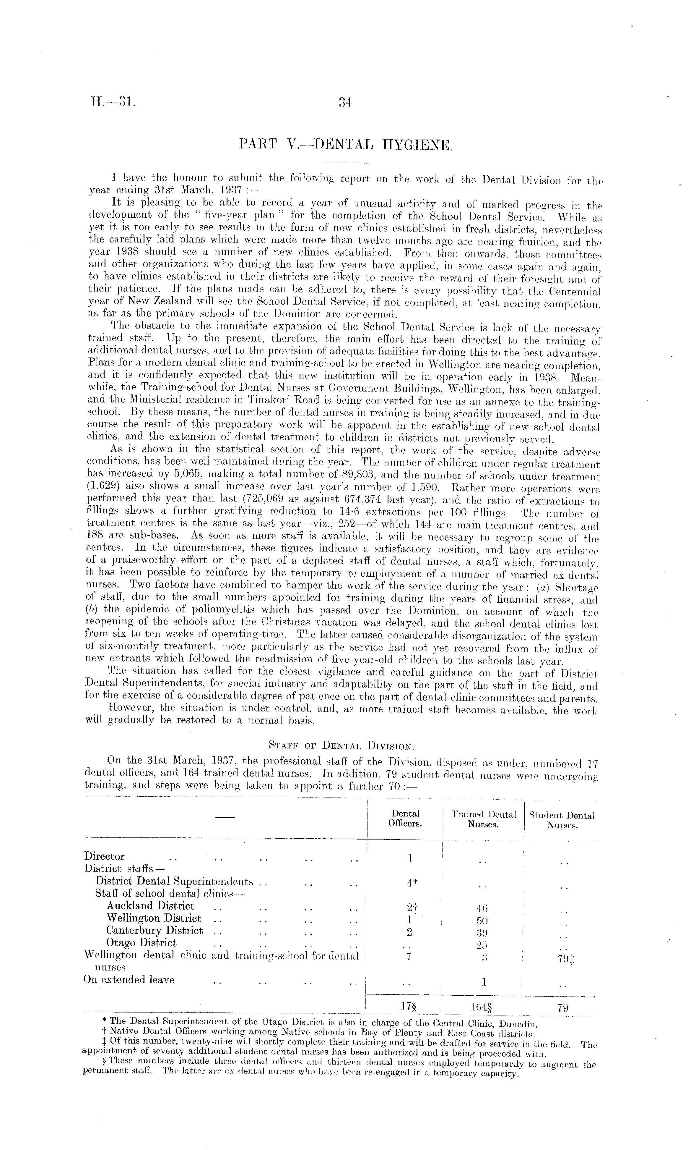 PART V.—DENTAL HYGIENE. I have the honour to submit the following report on the work of the Dental Division for the year ending 31st March, 1937 : — It is pleasing to be able to record a year of unusual activity and of marked progress in the development of the " five-year plan " for the completion of the School Dental Service. While as yet it is too early to see results in the form of new clinics established in fresh districts, nevertheless the carefully laid plans which were made more than twelve months ago are nearing fruition, and the year 1938 should see a number of new clinics established. Prom then onwards, those committees and other organizations who during the last few years have applied, in some cases again and again, to have clinics established in their districts are likely to receive the reward of their foresight and of their patience. If the plans made can be adhered to, there is every possibility that the Centennial year of New Zealand will see the School Dental Service, if not completed, at least nearing completion, as far as the primary schools of the Dominion are concerned. The obstacle to the immediate expansion of the School Dental Service is lack of the necessary trained staff. Up to the present, therefore, the main effort has been directed to the training of additional dental nurses, and to the provision of adequate facilities for doing this to the best advantage. Plans for a modern dental clinic and training-school to be erected in Wellington are nearing completion, and it is confidently expected that this new institution will be in operation early in 1938. Meanwhile, the Training-school for Dental Nurses at Government Buildings, Wellington, has been enlarged, and the Ministerial residence in Tinakori Road is being converted for use as an annexe to the trainingschool. By these means, the number of dental nurses in training is being steadily increased, and in due course the result of this preparatory work will be apparent in the establishing of new school dental clinics, and the extension of dental treatment to children in districts not previously served. As is shown in the statistical section of this report, the work of the service, despite adverse conditions, has been well maintained during the year. The number of children under regular treatment has increased by 5,065, making a total number of 89,803, and the number of schools under treatment (1,629) also shows a small increase over last year's number of 1,590. Rather more operations were performed this year than last (725,069 as against 674,374 last year), and the ratio of extractions to fillings shows a further gratifying reduction to 14-6 extractions per 100 fillings. The number of treatment centres is the same as last year —viz., 252—0f which 144 are main-treatment centres, and 188 are sub-bases. As soon as more staff is available, it will be necessary to regroup some of the centres. In the circumstances, these figures indicate a satisfactory position, and they are evidence of a praiseworthy effort on the part of a depleted staff of dental nurses, a staff which, fortunately, it has been possible to reinforce by the temporary re-employment of a number of married ex-dental nurses. Two factors have combined to hamper the work of the service during the year : (a) Shortage of staff, due to the small numbers appointed for training during the years of financial stress, and (b) the epidemic of poliomyelitis which has passed over the Dominion, on account of which the reopening of the schools after the Christmas vacation was delayed, and the school dental clinics lost from six to ten weeks of operating-time. The latter caused considerable disorganization of the system of six-monthly treatment, more particularly as 'the service had not yet recovered from the influx of new entrants which followed the readmission of five-year-old children to the schools last year. The situation has called for the closest vigilance and careful guidance on the part of District Dental Superintendents, for special industry and adaptability on the part of the staff in the field, and for the exercise of a considerable degree of patience on the part of dental-clinic committees and parents. However, the situation is under control, and, as more trained staff becomes available, the work will gradually be restored to a normal basis. Staff of Dental Division. Qn the 31st March, 1937, the professional staff of the Division, disposed as under, numbered 17 dental officers, and 164 trained dental nurses. In addition, 79 student dental nurses were undergoing training, and steps were being taken to appoint a further 70 :—