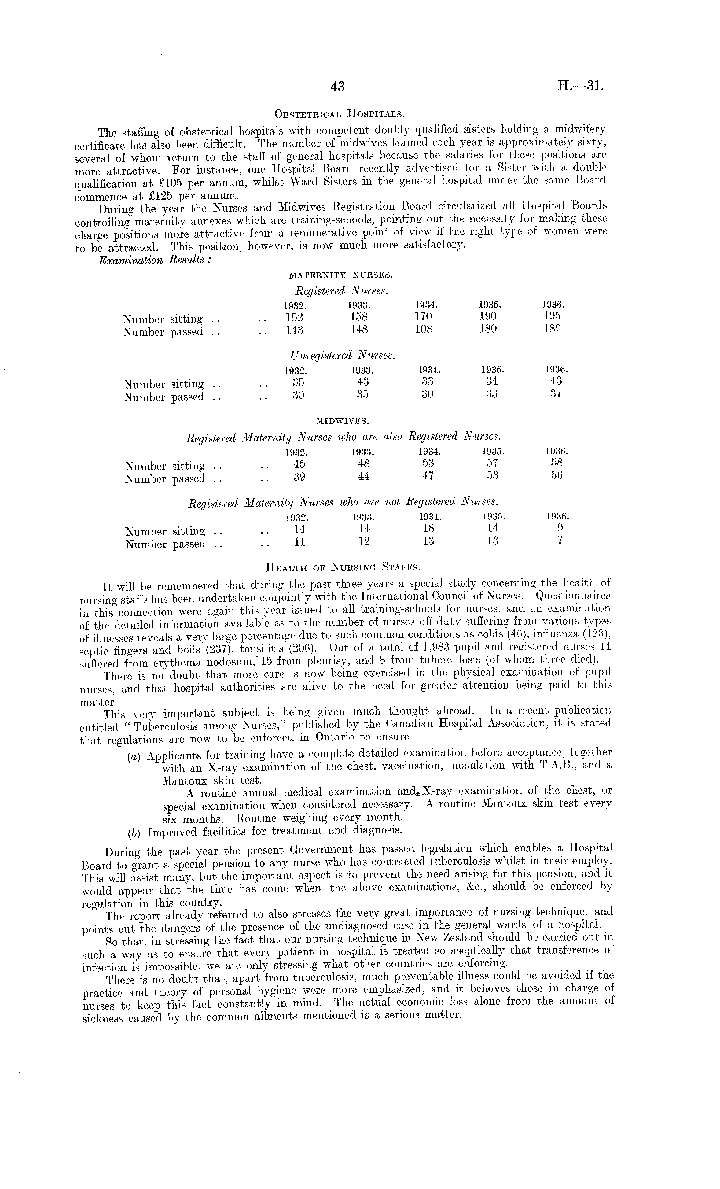 Obstetrical Hospitals. The staffing of obstetrical hospitals with competent doubly qualified sisters holding a midwifery certificate has also been difficult. The number of midwives trained each year is approximately sixty, several of whom return to the staff of general hospitals because the salaries for these positions are more attractive. For instance, one Hospital Board recently advertised for a Sister with a double qualification at £105 per annum, whilst Ward Sisters in the general hospital under the same Board commence at £125 per annum. During the year the Nurses and Midwives Begistration Board circularized ail Hospital isoards controlling maternity annexes which are training-schools, pointing out the necessity for making these charge positions more attractive from a remunerative point of view if the right type of women were to be attracted. This position, however, is now much more satisfactory. Examination Results : — MATERNITY NURSES. Registered Nurses. 1932. 1933. 1934. 1935. 1936. Number sitting .. .. 152 158 170 190 195 Number passed .. .. 143 148 108 180 189 Unregistered Nurses. 1932. 1933. 1934. 1935. 1936. Number sitting .. 35 43 33 34 43 Number passed .. 30 35 30 33 37 MIDWIVES. Registered Maternity Nurses who are also Registered Nurses. 1932. 1933. 1934. 1935. 1936. Number sitting .. 45 48 53 57 58 Number passed .. 39 44 47 53 56 Registered Maternity Nurses who are not Registered Nurses. 1932. 1933. 1934. 1935. 1936. Number sitting .... 14 14 18 14 9 Number passed .. ..11 12 13 13 7 Health of Nursing Staffs. It will be remembered that during the past three years a special study concerning the health of nursing staffs has been undertaken conjointly with the International Council of Nurses. Questionnaires in this connection were again this year issued to all training-schools for nurses, and an examination of the detailed information available as to the number of nurses off duty suffering from various types of illnesses reveals a very large percentage due to such common conditions as colds (46), influenza (123), septic fingers and b0i15"(237), tonsilitis (206). Out of a total of 1,983 pupil and registered nurses 14 suffered from erythema nodosum,' 15 from pleurisy, and 8 from tuberculosis (of whom three died). There is no doubt that more care is now being exercised in the physical examination of pupil nurses, and that hospital authorities are alive to the need for greater attention being paid, to this matter. . This very important subject is being given much thought abroad. In a recent publication entitled " Tuberculosis among Nurses," published by the Canadian Hospital Association, it is stated that regulations are now to be enforced in Ontario to ensure— (a) Applicants for training have a complete detailed examination before acceptance, together with an X-ray examination of the chest, vaccination, inoculation with T.A.8., and a Mantoux skin test. A routine annual medical examination and. X-ray examination of the chest, or special examination when considered necessary. A routine Mantoux skin test every six months. Routine weighing every month. (6) Improved facilities for treatment and diagnosis. During the past year the present Government has passed legislation which enables a Hospital Board to grant a special pension to any nurse who has contracted tuberculosis whilst in their employ. This will assist many, but the important aspect is to prevent the need arising for this pension, and it would appear that the time has come when the above examinations, &c, should be enforced by regulation in this country. The report already referred to also stresses the very great importance of nursing technique, and points out the dangers of the presence of the undiagnosed case in the general wards of a hospital. So that, in stressing the fact that our nursing technique in New Zealand should be carried out in such a way'as to ensure that every patient in hospital is treated so aseptically that transference of infection is impossible, we are only stressing what other countries are enforcing. There is no doubt that, apart from tuberculosis, much preventable illness could be avoided if the practice and theory of personal hygiene were more emphasized, and it behoves those in charge of nurses to keep this fact constantly in mind. The actual economic loss alone from the amount of sickness caused by the common ailments mentioned is a serious matter.