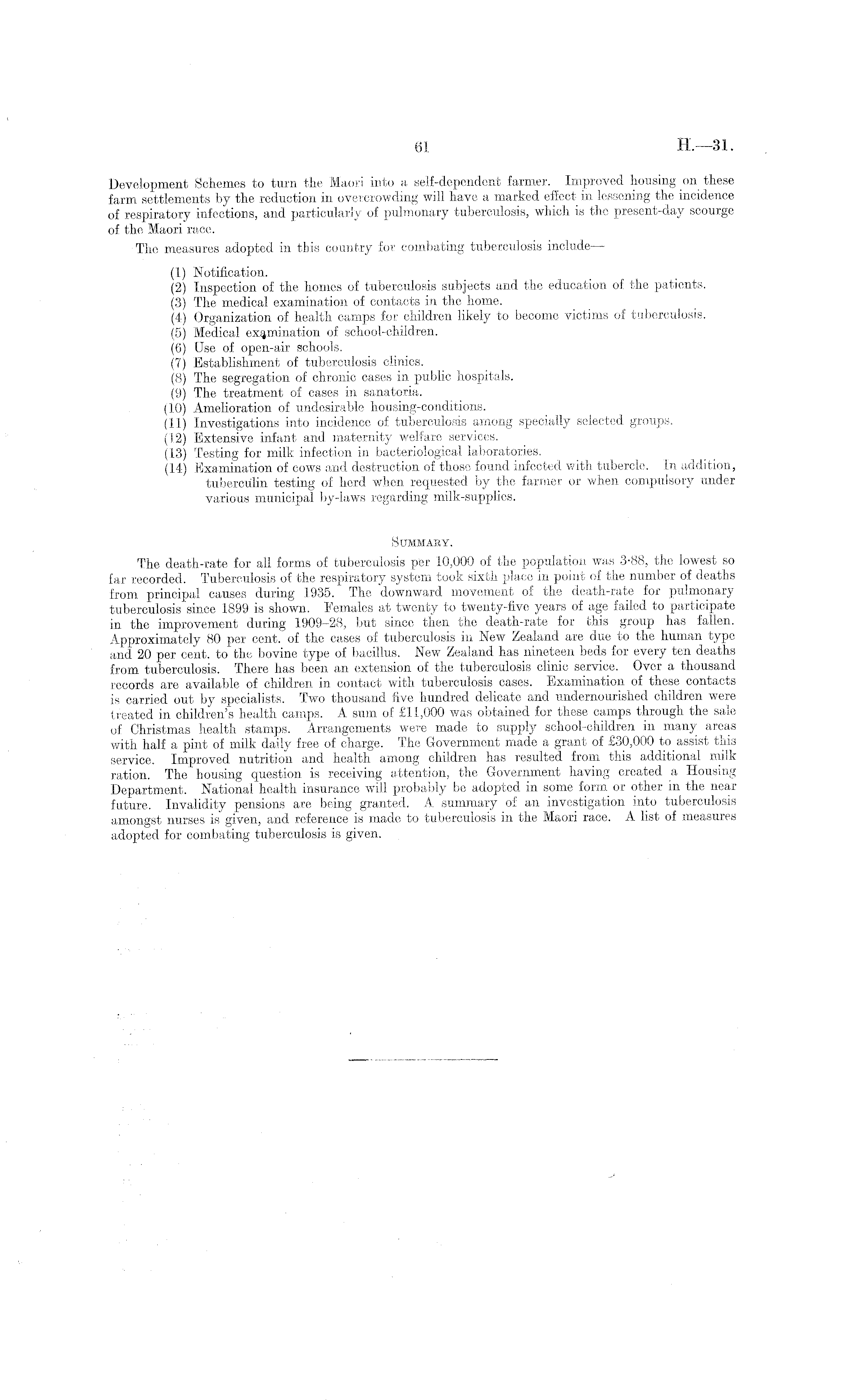 Development Schemes to turn the Maori into a self-dependent farmer. Improved housing on these farm settlements by the reduction in overcrowding will have a marked effect in lessening the incidence of respiratory infections, and particularly of pulmonary tuberculosis, which is the present-day scourge of the Maori race. The measures adopted in this country for combating tuberculosis include — (1) Notification. (2) Inspection of the homes of tuberculosis subjects and the education of the patients. (3) The medical examination of contacts in the home. (4) Organization of health camps for children likely to become victims of tuberculosis. (5) Medical examination of school-children. (6) Use of open-air schools. (7) Establishment of tuberculosis clinics. (8) The segregation of chronic cases in public hospitals. (9) The treatment of cases in sanatoria. (10) Amelioration of undesirable housing-conditions. (11) Investigations into incidence of tuberculosis among specially selected groups. (12) Extensive infant and maternity welfare services. (13) Testing for milk infection in bacteriological laboratories. (14) Examination of cows and destruction of those found infected with tubercle. In addition, tuberculin testing of herd when requested by the farmer or when compulsory under various municipal by-laws regarding milk-supplies. Summary. The death-rate for all forms of tuberculosis per 10,000 of the population was 3-88, the lowest so far recorded. Tuberculosis of the respiratory system took sixth place in point of the number of deaths from principal causes during 1935. The downward movement of the death-rate for pulmonary tuberculosis since 1899 is shown. Females at twenty to twenty-five years of age failed to participate in the improvement during 1909-28, but since then the death-rate for this group has fallen. Approximately 80 per cent, of the cases of tuberculosis in New Zealand are due to the human type and 20 per cent, to the bovine type of bacillus. New Zealand has nineteen beds for every ten deaths from tuberculosis. There has been an extension of the tuberculosis clinic service. Over a thousand records are available of children in contact with tuberculosis cases. Examination of these contacts is carried out by specialists. Two thousand five hundred delicate and undernourished children were treated in children's health camps. A sum of £11,000 was obtained for these camps through the sale of Christmas health stamps. Arrangements were made to supply school-children in many areas with half a pint of milk daily free of charge. The Government made a grant of £30,000 to assist this service. Improved nutrition and health among children has resulted from this additional milk ration. The housing question is receiving attention, the Government having created a Housing Department. National health insurance will probably be adopted in some form or other in the near future. Invalidity pensions are being granted. A summary of an investigation into tuberculosis amongst nurses is given, and reference is made to tuberculosis in the Maori race. A list of measures adopted for combating tuberculosis is given.