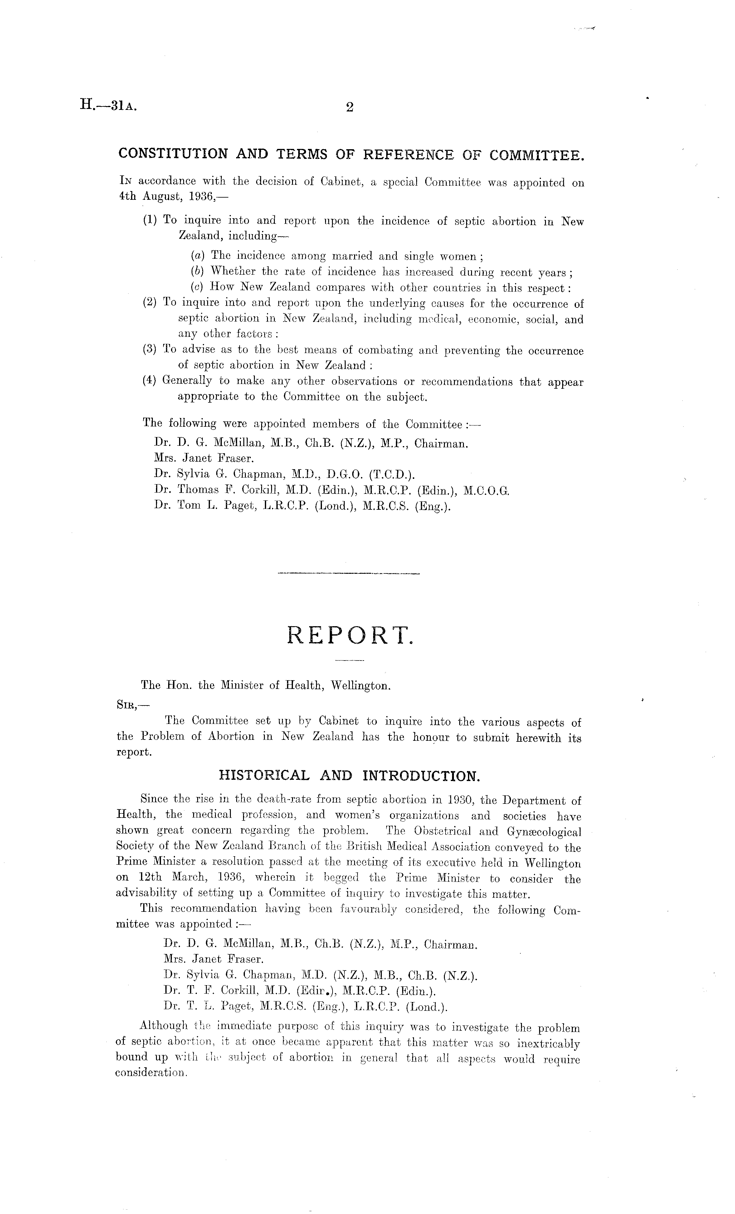 CONSTITUTION AND TERMS OF REFERENCE OF COMMITTEE. In accordance with the decision of Cabinet, a special Committee was appointed on 4th August, 1936, — (1) To inquire into and report upon the incidence of septic abortion in New Zealand, including— (a) The incidence among married and single women ; (b) Whether the rate of incidence has increased during recent years ; (e) How New Zealand compares with other countries in this respect: (2) To inquire into and report upon the underlying causes for the occurrence of septic abortion in New Zealand, including medical, economic, social, and any other factors : (3) To advise as to the best means of combating and preventing the occurrence of septic abortion in New Zealand : (4) Generally to make any other observations or recommendations that appear appropriate to the Committee on the subject. The following were appointed members of the Committee :— Dr. D. G. McMillan, M.8., Ch.B. (N.Z.), M.P., Chairman. Mrs. Janet Fraser. Dr. Sylvia G. Chapman, M.D., D.G.O. (T.C.D.). Dr. Thomas F. Corkill, M.D. (Edin.), M.R.C.P. (Edin.), M.C.O.G. Dr. Tom L. Paget, L.R.C.P. (Lond.), M.R.C.S. (Eng.).