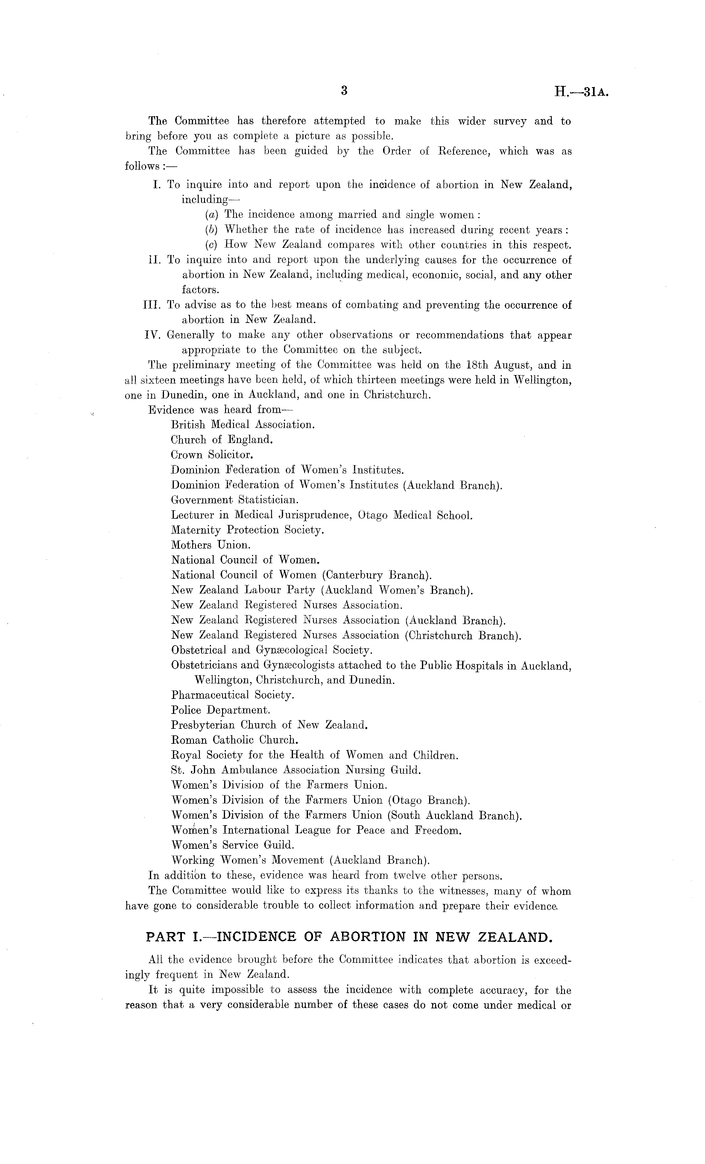 The Committee has therefore attempted to make this wider survey and to bring before you as complete a picture as possible. The Committee has been guided by the Order of Reference, which was as follows :— I. To inquire into and report upon the incidence of abortion in New Zealand, including — (a) The incidence among married and single women : (b) Whether the rate of incidence has increased during recent years : (c) How New Zealand compares with other countries in this respect. 11. To inquire into and report upon the underlying causes for the occurrence of abortion in New Zealand, including medical, economic, social, and any other factors. 111. To advise as to the best means of combating and preventing the occurrence of abortion in New Zealand. IV. Generally to make any other observations or recommendations that appear appropriate to the Committee on the subject. The preliminary meeting of the Committee was held on the 18th August, and in all sixteen meetings have been held, of which thirteen meetings were held in Wellington, one in Dunedin, one in Auckland, and one in Christchurck. Evidence was heard from— British Medical Association. Church of England. Crown Solicitor. Dominion Federation of Women's Institutes. Dominion Federation of Women's Institutes (Auckland Branch). Government Statistician. Lecturer in Medical Jurisprudence, Otago Medical School. Maternity Protection Society. Mothers Union. National Council of Women. National Council of Women (Canterbury Branch). New Zealand Labour Party (Auckland Women's Branch). New Zealand Registered Nurses Association. New Zealand Registered Nurses Association (Auckland Branch). New Zealand Registered Nurses Association (Christchurch Branch). Obstetrical and Gynaecological Society. Obstetricians and Gynecologists attached to the Public Hospitals in Auckland, Wellington, Christchurch, and Dunedin. Pharmaceutical Society. Police Department. Presbyterian Church of New Zealand. Roman Catholic Church. Royal Society for the Health of Women and Children. St. John Ambulance Association Nursing Guild. Women's Division of the Farmers Union. Women's Division of the Farmers Union (Otago Branch). Women's Division of the Farmers Union (South Auckland Branch). Women's International League for Peace and Freedom. Women's Service Guild. Working Women's Movement (Auckland Branch). In addition to these, evidence was heard from twelve other persons. The Committee would like to express its thanks to the witnesses, many of whom have gone to considerable trouble to collect information and prepare their evidence. PART I.—INCIDENCE OF ABORTION IN NEW ZEALAND. All the evidence brought before the Committee indicates that abortion is exceedingly frequent in New Zealand. It is quite impossible to assess the incidence with complete accuracy, for the reason that a very considerable number of these cases do not come under medical or