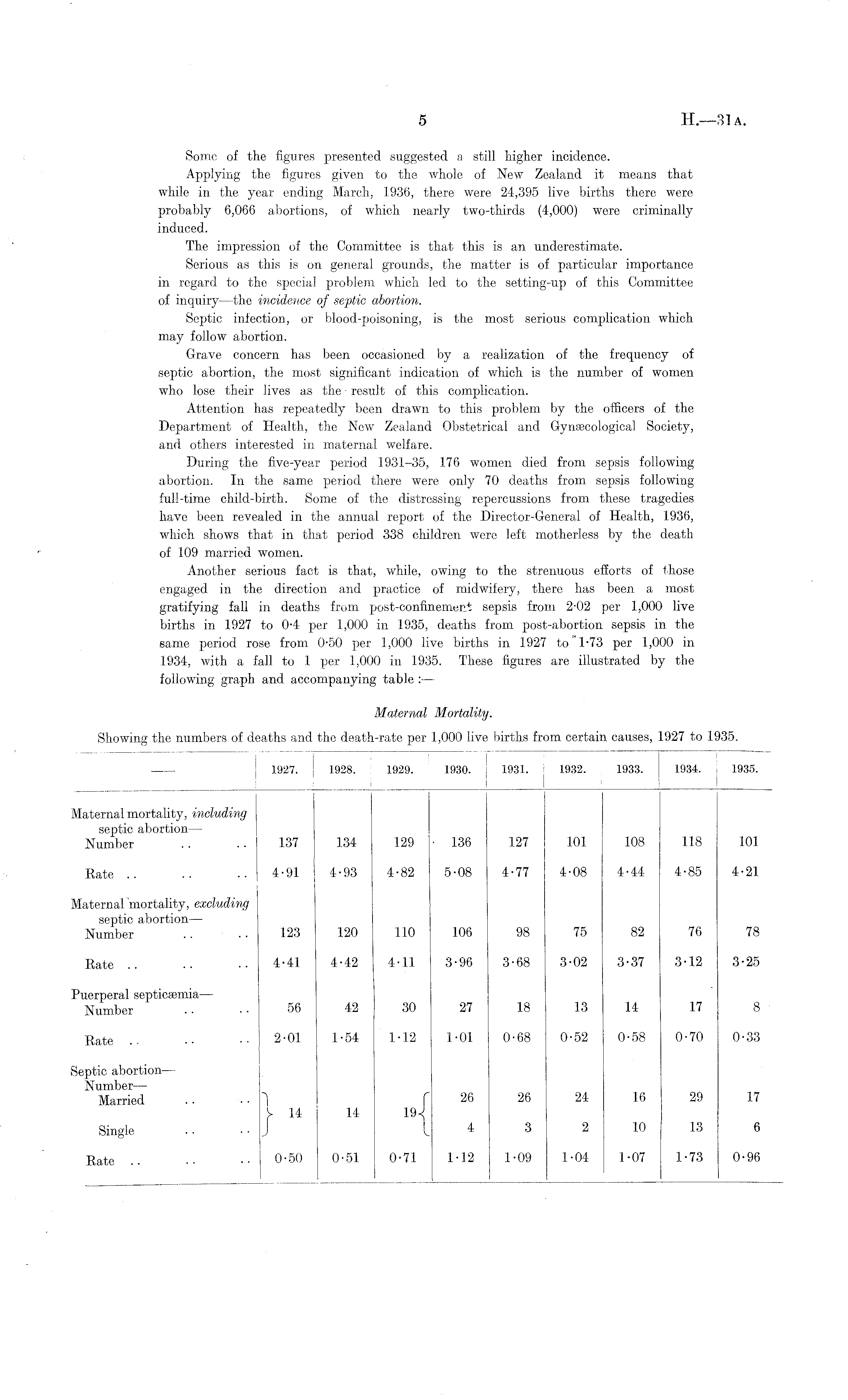 Some of the figures presented suggested a still higher incidence. Applying the figures given to the whole of New Zealand it means that while in the year ending March, 1936, there were 24,395 live births there were probably 6,066 abortions, of which nearly two-thirds (4,000) were criminally induced. The impression of the Committee is that this is an underestimate. Serious as this is on general grounds, the matter is of particular importance in regard to the special problem which led to the setting-up of this Committee of inquiry—the incidence of septic abortion. Septic infection, or blood-poisoning, is the most serious complication which may follow abortion. Grave concern has been occasioned by a realization of the frequency of septic abortion, the most significant indication of which is the number of women who lose their lives as the • result of this complication. Attention has repeatedly been drawn to this problem by the officers of the Department of Health, the New Zealand Obstetrical and Gynaecological Society, and others interested in maternal welfare. During the five-year period 1931-35, 176 women died from sepsis following abortion. In the same period there were only 70 deaths from sepsis following full-time child-birth. Some of the distressing repercussions from these tragedies have been revealed in the annual report of the Director-General of Health, 1936, which shows that in that period 338 children were left motherless by the death of 109 married women. Another serious fact is that, while, owing to the strenuous efforts of those engaged in the direction and practice of midwifery, there has been a most gratifying fall in deaths from post-confinement sepsis from 2-02 per 1,000 live births in 1927 to 0-4 per 1,000 in 1935, deaths from post-abortion sepsis in the same period rose from 0-50 per 1,000 live births in 1927 to 1-73 per 1,000 in 1934, with a fall to 1 per 1,000 in 1935. These figures are illustrated by the following graph and accompanying table : —