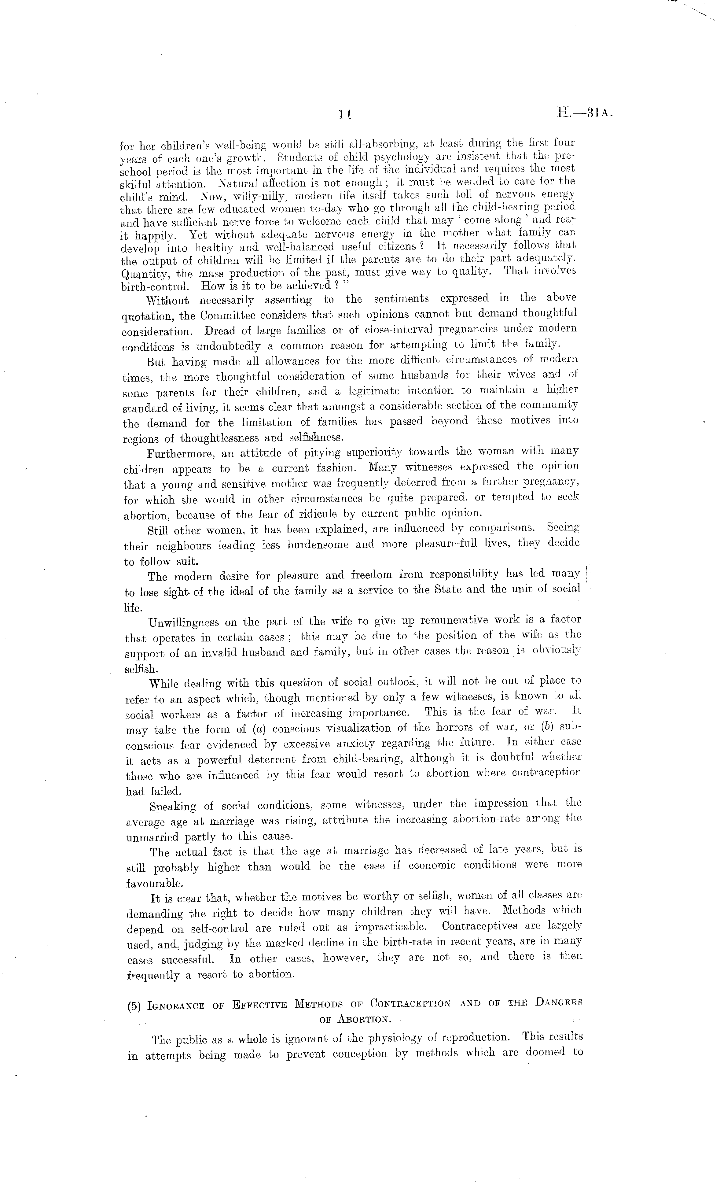for hex children's well-being would be still all-absorbing, at least during the first four years of each, one's growth. Students of child psychology are insistent that the preschool period is the most important in the life of the individual and requires the most skilful attention. Natural affection is not enough ; it must be wedded to care for the child's mind. Now, willy-nilly, modern life itself takes such toll of nervous energy that there are few educated women to-day who go through all the child-bearing period and have sufficient nerve force to welcome each child that may ' come along and rear it happily. Yet without adequate nervous energy in the mother what family can develop into healthy and well-balanced useful citizens ? It necessarily follows that the output of children will be limited if the parents are to do their part adequately. Quantity, the mass production of the past, must give way to quality. That involves birth-control. How is it to be achieved ? " Without necessarily assenting to the sentiments expressed in the above quotation, the Committee considers that such opinions cannot but demand thoughtful consideration. Dread of large families or of close-interval pregnancies under modern conditions is undoubtedly a common reason for attempting to limit the family. But having made all allowances for the more difficult circumstances of modern times, the more thoughtful consideration of some husbands for their wives and of gome parents for their children, and a legitimate intention to maintain a higher standard of living, it seems clear that amongst a considerable section of the community the demand for the limitation of families has passed beyond these motives into regions of thoughtlessness and selfishness. Furthermore, an attitude of pitying superiority towards the woman with many children appears to be a current fashion. Many witnesses expressed the opinion that a young and sensitive mother was frequently deterred from a further pregnancy, for which she would in other circumstances be quite prepared, or tempted to seek abortion, because of the fear of ridicule by current public opinion. Still other women, it has been explained, are influenced by comparisons. Seeing their neighbours leading less burdensome and more pleasure-full lives, they decide to follow suit. The modern desire for pleasure and freedom from responsibility has led many to lose sight of the ideal of the family as a service to the State and the unit of social life. Unwillingness on the part of the wife to give up remunerative work is a factor that operates in certain cases ; this may be due to the position of the wife as the support of an invalid husband and family, but in other cases the reason is obviously selfish. While dealing with this question of social outlook, it will not be out of place to refer to an aspect which, though mentioned by only a few witnesses, is known to all social workers as a factor of increasing importance. This is the fear of war. It may take the form of (a) conscious visualization of the horrors of war, or (b) subconscious fear evidenced by excessive anxiety regarding the future. In either case it acts as a powerful deterrent from child-bearing, although it is doubtful whether those who are influenced by this fear would resort to abortion where contraception had failed. Speaking of social conditions, some witnesses, under the impression that the average age at marriage was rising, attribute the increasing abortion-rate among the unmarried partly to this cause. The actual fact is that the age at marriage has decreased of late years, but is still probably higher than would be the case if economic conditions were more favourable. It is clear that, whether the motives be worthy or selfish, women of all classes are demanding the right to decide how many children they will have. Methods which depend on self-control are ruled out as impracticable. Contraceptives are largely used, and, judging by the marked decline in the birth-rate in recent years, are in many cases successful. In other cases, however, they are not so, and there is then frequently a resort to abortion. (5) Ignorance of Effective Methods of Contraception and of the Dangers of Abortion. The public as a whole is ignorant of the physiology of reproduction. This results in attempts being made to prevent conception by methods which are doomed to
