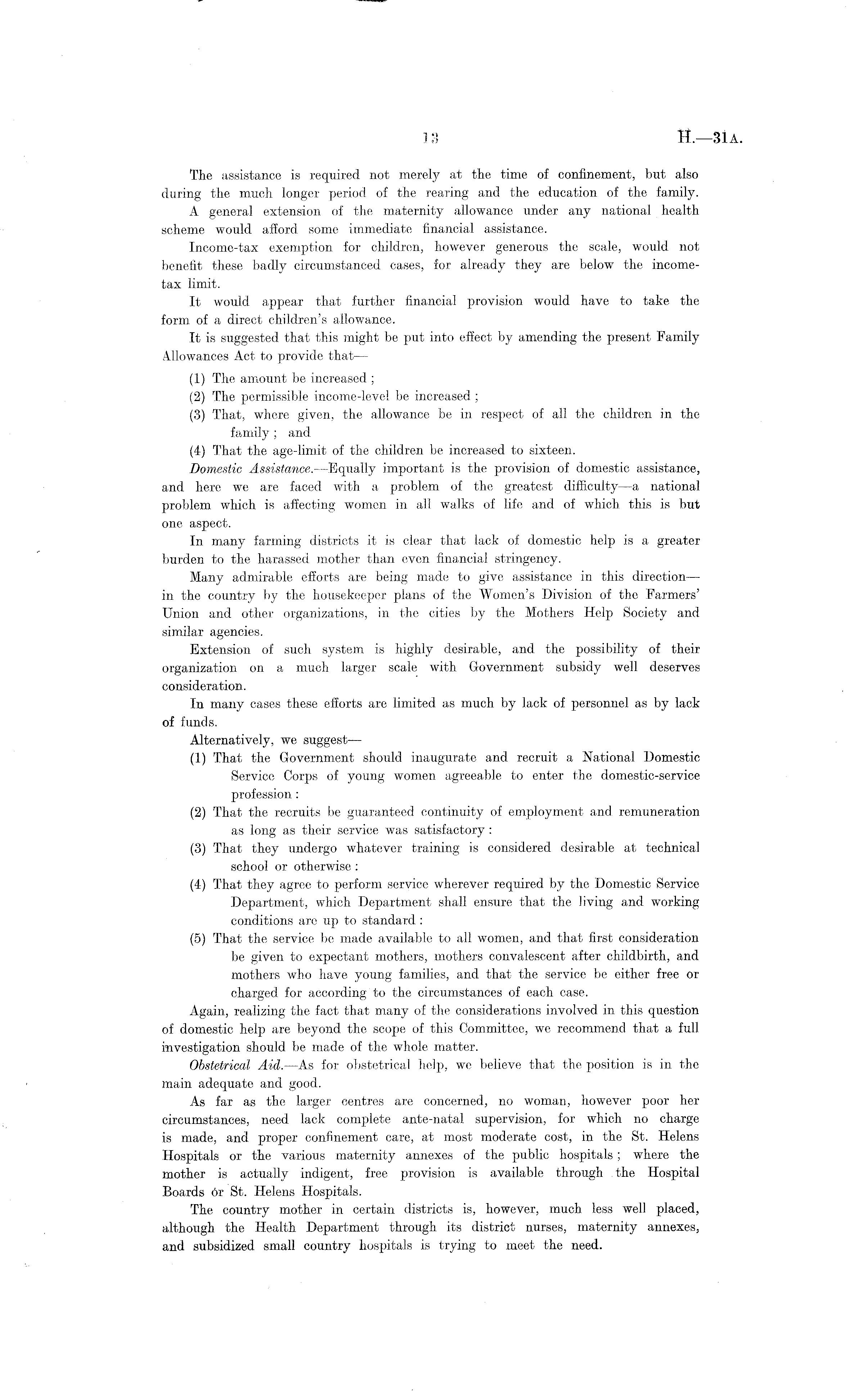 The assistance is required not merely at the time of confinement, but also during the much longer period of the rearing and the education of the family. A general extension of the maternity allowance under any national health scheme would afford some immediate financial assistance. Income-tax exemption for children, however generous the scale, would not benefit these badly circumstanced cases, for already they are below the incometax limit. It would appear that further financial provision would have to take the form of a direct children's allowance. It is suggested that this might be put into effect by amending the present Family Allowances Act to provide that — (1) The amount be increased ; (2) The permissible income-level be increased ; (3) That, where given, the allowance be in respect of all the children in the family ; and (4) That the age-limit of the children be increased to sixteen. Domestic Assistance. —Equally important is the provision of domestic assistance, and here we are faced with a problem of the greatest difficulty —a national problem which is affecting women in all walks of life and of which this is but one aspect. In many farming districts it is clear that lack of domestic help is a greater burden to the harassed mother than even financial stringency. Many admirable efforts are being made to give assistance in this direction — in the country by the housekeeper plans of the Women's Division of the Farmers' Union and other organizations, in the cities by the Mothers Help Society and similar agencies. Extension of such system is highly desirable, and the possibility of their organization on a much larger scale with Government subsidy well deserves consideration. In many cases these efforts are limited as much by lack of personnel as by lack of funds. Alternatively, we suggest — (1) That the Government should inaugurate and recruit a National Domestic Service Corps of young women agreeable to enter the domestic-service profession : (2) That the recruits be guaranteed continuity of employment and remuneration as long as their service was satisfactory : (3) That they undergo whatever training is considered desirable at technical school or otherwise : (4) That they agree to perform service wherever required by the Domestic Service Department, which Department shall ensure that the living and working conditions are up to standard : (5) That the service be made available to all women, and that first consideration be given to expectant mothers, mothers convalescent after childbirth, and mothers who have young families, and that the service be either free or charged for according to the circumstances of each case. Again, realizing the fact that many of the considerations involved in this question of domestic help) are beyond the scope of this Committee, we recommend that a full investigation should be made of the whole matter. Obstetrical Aid. —As for obstetrical help, we believe that the position is in the main adequate and good. As far as the larger centres are concerned, no woman, however poor her circumstances, need lack complete ante-natal supervision, for which no charge is made, and proper confinement care, at most moderate cost, in the St. Helens Hospitals or the various maternity annexes of the public hospitals ; where the mother is actually indigent, free provision is available through the Hospital Boards ôr St. Helens Hospitals. The country mother in certain districts is, however, much less well placed, although the Health Department through its district nurses, maternity annexes, and subsidized small country hospitals is trying to meet the need.