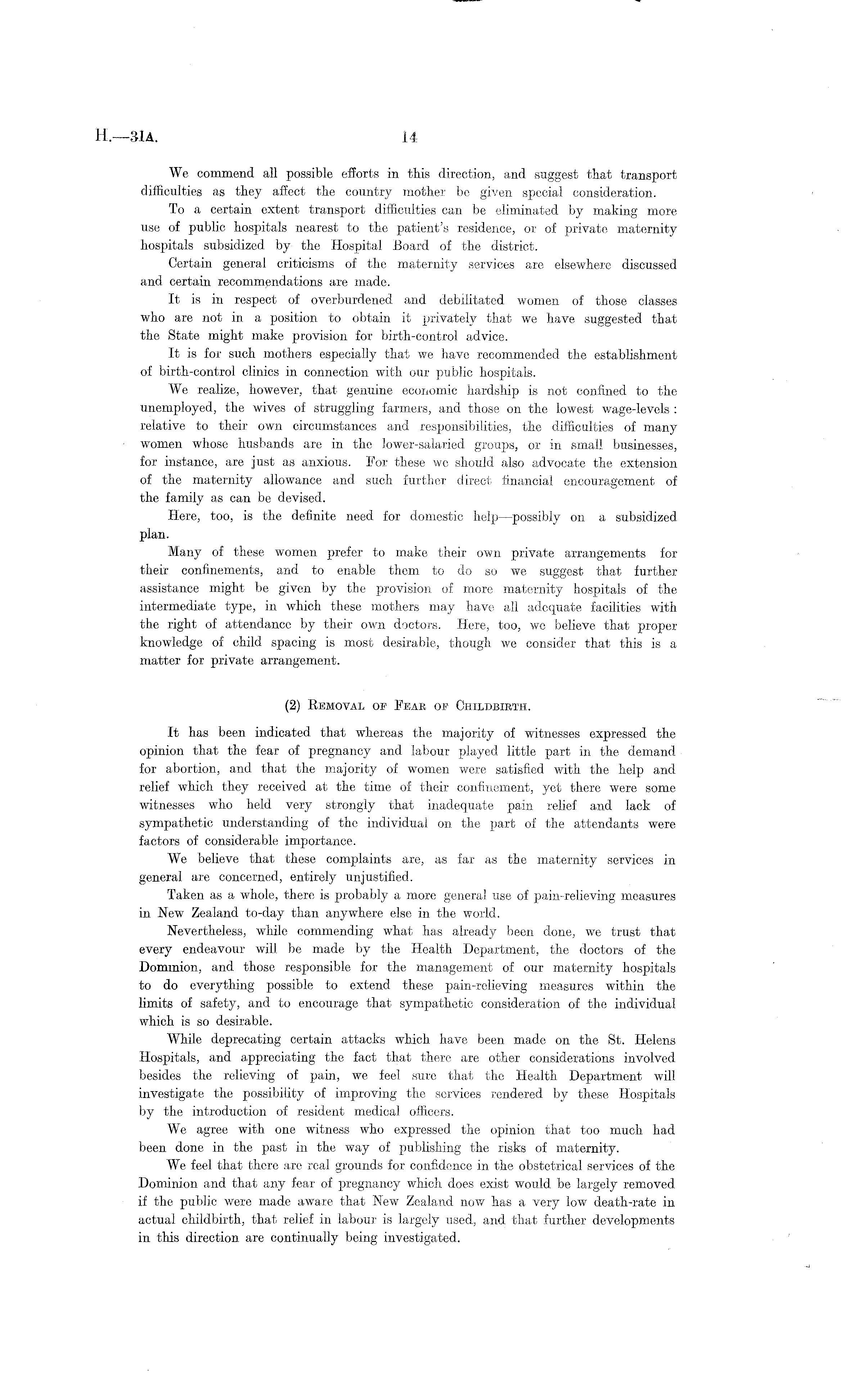 We commend all possible efforts in this direction, and suggest that transport difficulties as they affect the country mother be given special consideration. To a certain extent transport difficulties can be eliminated by mating more use of public hospitals nearest to the patient's residence, or of private maternity hospitals subsidized by the Hospital Board of the district. Certain general criticisms of the maternity services are elsewhere discussed and certain recommendations are made. It is in respect of overburdened and debilitated women of those classes who are not in a position to obtain it privately that we have suggested that the State might make provision for birth-control advice. It is for such mothers especially that we have recommended the establishment of birth-control clinics in connection with our public hospitals. We realize, however, that genuine economic hardship is not confined to the unemployed, the wives of struggling farmers, and those on the lowest wage-levels : relative to their own circumstances and responsibilities, the difficulties of many women whose husbands are in the lower-salaried groups, or in small businesses, for instance, are just as anxious. For these we should also advocate the extension of the maternity allowance and such further direct financial encouragement of the family as can be devised. Here, too, is the definite need for domestic help—possibly on a subsidized plan. Many of these women prefer to make their own private arrangements for their confinements, and to enable them to do so we suggest that further assistance might be given by the provision of more maternity hospitals of the intermediate type, in which these mothers may have all adequate facilities with the right of attendance by their own doctors. Here, too, we believe that proper knowledge of child spacing is most desirable, though we consider that this is a matter for private arrangement. (2) Removal of Fear of Childbirth. It has been indicated that whereas the majority of witnesses expressed the opinion that the fear of pregnancy and labour played little part in the demand for abortion, and that the majority of women were satisfied with the help and relief which they received at the time of their confinement, yet there were some witnesses who held very strongly that inadequate pain relief and lack of sympathetic understanding of the individual on the part of the attendants were factors of considerable importance. We believe that these complaints are, as far as the maternity services in general are concerned, entirely unjustified. Taken as a whole, there is probably a more general use of pain-relieving measures in New Zealand to-day than anywhere else in the world. Nevertheless, while commending what has already been done, we trust that every endeavour will be made by the Health Department, the doctors of the Dominion, and those responsible for the management of our maternity hospitals to do everything possible to extend these pain-relieving measures within the limits of safety, and to encourage that sympathetic consideration of the individual which is so desirable. While deprecating certain attacks which have been made on the St. Helens Hospitals, and appreciating the fact that there are other considerations involved besides the relieving of pain, we feel sure that the Health Department will investigate the possibility of improving the services rendered by these Hospitals by the introduction of resident medical officers. We agree with one witness who expressed the opinion that too much had been done in the past in the way of publishing the risks of maternity. We feel that there are real grounds for confidence in the obstetrical services of the Dominion and that any fear of pregnancy which does exist would be largely removed if the public were made aware that New Zealand now has a very low death-rate in actual childbirth, that relief in labour is largely used, and that further developments in this direction are continually being investigated.