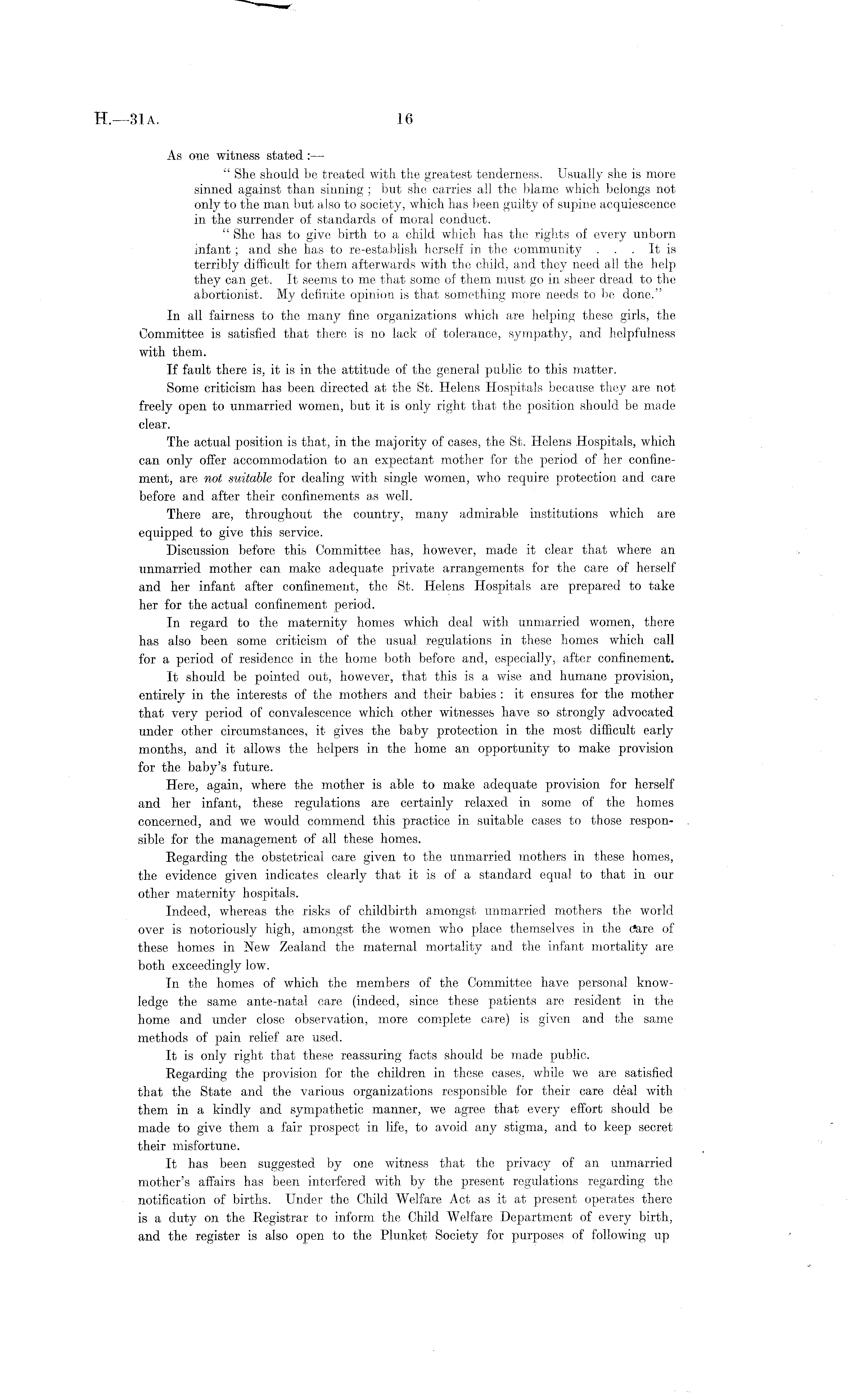 As one witness stated: — " She should be treated with the greatest tenderness. Usually she is more sinned against than sinning ; but she carries all the blame which belongs not only to the man but also to society, which has been guilty of supine acquiescence in the surrender of standards of moral conduct. " She has to give birth to a child which has the rights of every unborn infant; and she has to re-establish herself in the community . . . It is terribly difficult for them afterwards with the child, and they need all the help they can get. It seems to me that some of them must go in sheer dread to the abortionist. My definite opinion is that something more needs to be done." In all fairness to the many fine organizations which are helping these girls, the Committee is satisfied that there is no lack of tolerance, sympathy, and helpfulness with them. If fault there is, it is in the attitude of the general public to this matter. Some criticism has been directed at the St. Helens Hospitals because they are not freely open to unmarried women, but it is only right that the position should be made clear. The actual position is that, in the majority of cases, the St. Helens Hospitals, which can only offer accommodation to an expectant mother for the period of her confinement, are not suitable for dealing with single women, who require protection and care before and after their confinements as well. There are, throughout the country, many admirable institutions which are equipped to give this service. Discussion before this Committee has, however, made it clear that where an unmarried mother can make adequate private arrangements for the care of herself and her infant after confinement, the St. Helens Hospitals are prepared to take her for the actual confinement period. In regard to the maternity homes which deal with unmarried women, there has also been some criticism of the usual regulations in these homes which call for a period of residence in the home both before and, especially, after confinement. It should be pointed out, however, that this is a wise and humane provision, entirely in the interests of the mothers and their babies : it ensures for the mother that very period of convalescence which other witnesses have so strongly advocated under other circumstances, it gives the baby protection in the most difficult early months, and it allows the helpers in the home an opportunity to make provision for the baby's future. Here, again, where the mother is able to make adequate provision for herself and her infant, these regulations are certainly relaxed in some of the homes concerned, and we would commend this practice in suitable cases to those responsible for the management of all these homes. Regarding the obstetrical care given to the unmarried mothers in these homes, the evidence given indicates clearly that it is of a standard equal to that in our other maternity hospitals. Indeed, whereas the risks of childbirth amongst unmarried mothers the world over is notoriously high, amongst the women who place themselves in the (fare of these homes in New Zealand the maternal mortality and the infant mortality are both exceedingly low. In the homes of which the members of the Committee have personal knowledge the same ante-natal care (indeed, since these patients are resident in the home and under close observation, more complete care) is given and the same methods of pain relief are used. It is only right that these reassuring facts should be made public. Regarding the provision for the children in these cases, while we are satisfied that the State and the various organizations responsible for their care deal with them in a kindly and sympathetic manner, we agree that every effort should be made to give them a fair prospect in life, to avoid any stigma, and to keep secret their misfortune. It has been suggested by one witness that the privacy of an unmarried mother's affairs has been interfered with by the present regulations regarding the notification of births. Under the Child Welfare Act as it at present operates there is a duty on the Registrar to inform the Child Welfare Department of every birth, and the register is also open to the Plunket Society for purposes of following up