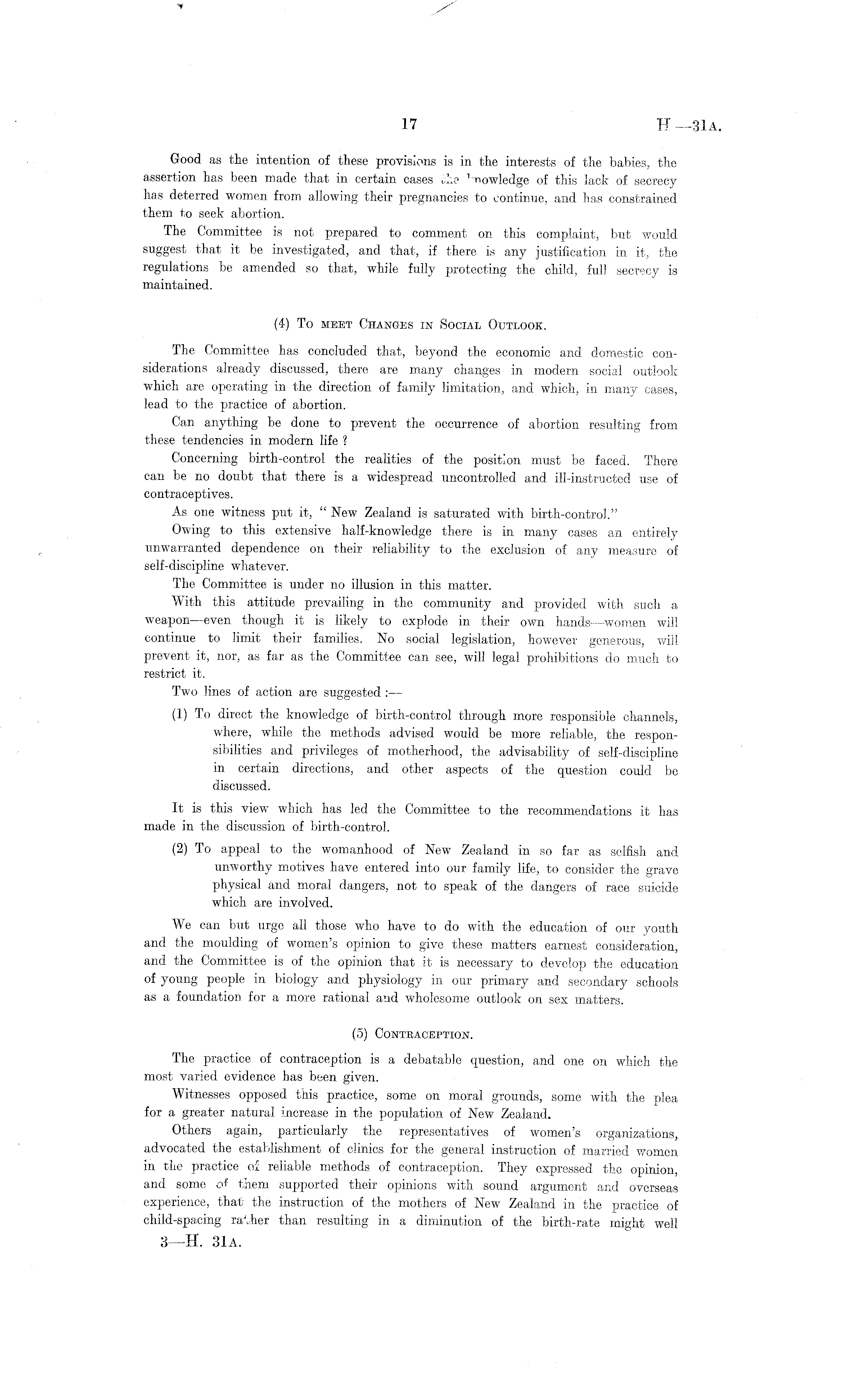 Good as the intention of these provisos is in the interests of the babies, the assertion has been made that in certain oases knowledge of this lack of secrecy has deterred women from allowing their pregnancies to continue, and has constrained them to seek abortion. The Committee is not prepared to comment on this complaint, but would suggest that it be investigated, and that, if there is any justification in it, the regulations be amended so that, while fully protecting the child, full secrecy is maintained. (4) To meet Changes in Social Outlook. The Committee has concluded that, beyond the economic and domestic considerations already discussed, there are many changes in modern social outlook which are operating in the direction of family limitation, and which, in many cases, lead to the practice of abortion. Can anything be done to prevent the occurrence of abortion resulting from these tendencies in modern life ? Concerning birth-control the realities of the position must be faced. There can be no doubt that there is a widespread uncontrolled and ill-instructed use of contraceptives. As one witness put it, "New Zealand is saturated with birth-control." Owing to this extensive half-knowledge there is in many cases an entirely unwarranted dependence on their reliability to the exclusion of any measure of self-discipline whatever. The Committee is under no illusion in this matter. With this attitude prevailing in the community and provided with such a weapon —even though it is likely to explode in their own hands—women will continue to limit their families. No social legislation, however generous, will prevent it, nor, as far as the Committee can see, will legal prohibitions do much to restrict it. Two lines of action are suggested : — (1) To direct the knowledge of birth-control through more responsible channels, where, while the methods advised would be more reliable, the responsibilities and privileges of motherhood, the advisability of self-discipline in certain directions, and other aspects of the question could be discussed. It is this view which has led the Committee to the recommendations it has made in the discussion of birth-control. (2) To appeal to the womanhood of New Zealand in so far as selfish and unworthy motives have entered into our family life, to consider the grave physical and moral dangers, not to speak of the dangers of race suicide which are involved. We can but urge all those who have to do with the education of our youth and the moulding of women's opinion to give these matters earnest consideration, and the Committee is of the opinion that Jf is necessary to develop the education of young people in biology and physiology in our primary and secondary schools as a foundation for a more rational and wholesome outlook on sex matters. (5) Contraception. The practice of contraception is a debatable question, and one on which the most varied evidence has been given. Witnesses opposed this practice, some on moral grounds, some with the plea for a greater natural increase in the population of New Zealand. Others again, particularly the representatives of women's organizations, advocated the establishment of clinics for the general instruction of married women in the practice of reliable methods of contraception. They expressed the opinion, and some of them supported their opinions with sound argument and overseas experience, that the instruction of the mothers of New Zealand in the practice of child-spacing rather than resulting in a diminution of the birth-rate might well