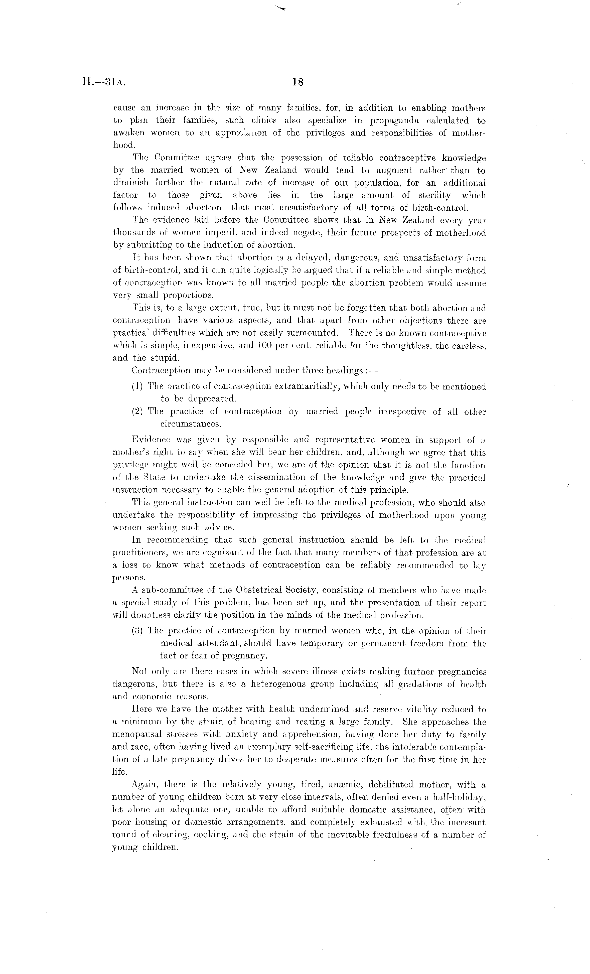 cause an increase in the size of many families, for, in addition to enabling mothers to plan their families, such clinics also specialize in propaganda calculated to awaken women to an appreciation of the privileges and responsibilities of motherhood. The Committee agrees that the possession of reliable contraceptive knowledge by the married women of New Zealand would tend to augment rather' than to diminish further the natural rate of increase of our population, for an additional factor to those given above lies in the large amount of sterility which follows induced abortion —that most unsatisfactory of all forms of birth-control. The evidence laid before the Committee shows that in New Zealand every year thousands of women imperil, and indeed negate, their future prospects of motherhood by submitting to the induction of abortion. It has been shown that abortion is a delayed, dangerous, and unsatisfactory form of birth-control, and it can quite logically be argued that if a reliable and simple method of contraception was known to all married people the abortion problem would assume very small proportions. This is, to a large extent, true, but it must not be forgotten that both abortion and contraception have various aspects, and that apart from other objections there are practical difficulties which are not easily surmounted. There is no known contraceptive which is simple, inexpensive, and 100 per cent, reliable for the thoughtless, the careless, and the stupid. Contraception may be considered under three headings : — (1) The practice of contraception extramaritially, which only needs to be mentioned to be deprecated. (2) The practice of contraception by married people irrespective of all other circumstances. Evidence was given bv responsible and representative women in support of a mother's right to say when she will bear her children, and, although we agree that this privilege might well be conceded her, we are of the opinion that it is not the function of the State to undertake the dissemination of the knowledge and give the practical instruction necessary to enable the general adoption of this principle. This general instruction can well be left to the medical profession, who should also undertake the responsibility of impressing the privileges of motherhood upon young women seeking such advice. In recommending that such general instruction should be left to the medical practitioners, we are cognizant of the fact that many members of that profession are at a loss to know what methods of contraception can be reliably recommended to lay persons. A sub-committ.ee of the Obstetrical Society, consisting of members who have made a special study of this problem, has been set up, and the presentation of their report will doubtless clarify the position in the minds of the medical profession. (3) The practice of contraception by married women who, in the opinion of their medical attendant, should have temporary or permanent freedom from the fact or fear of pregnancy. Not only are there cases in which severe illness exists making further pregnancies dangerous, but there is also a heterogenous group including all gradations of health and economic reasons. Here we have the mother with health undermined and reserve vitality reduced to a minimum by the strain of bearing and rearing a large family. She approaches the menopausal stresses with anxiety and apprehension, having done her duty to family and race, often having lived an exemplary self-sacrificing life, the intolerable contemplation of a late pregnancy drives her to desperate measures often for the first time in her life. Again, there is the relatively young, tired, anaemic, debilitated mother, with a number of young children born at very close intervals, often denied even a half-holiday, let alone an adequate one, unable to afford suitable domestic assistance, oft,fiH with poor housing or domestic arrangements, and completely exhausted witlufcsae incessant round of cleaning, cooking, and the strain of the inevitable fretfulness of a number of young children.