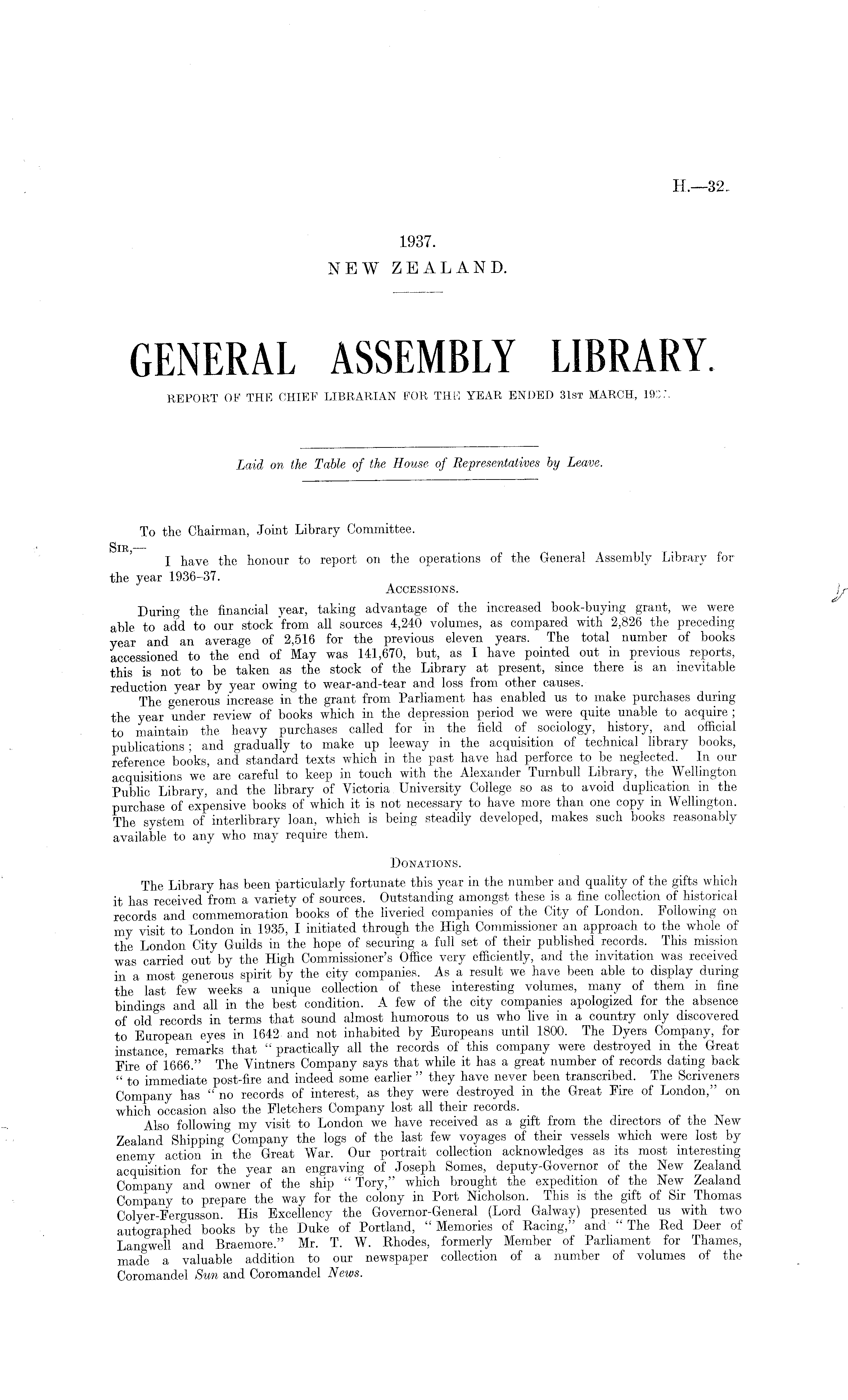 To the Chairman, Joint Library Committee. I have the honour to report on the operations of the General Assembly Library for the year 1936-37. Accessions. During the financial year, taking advantage of the increased book-buying grant, we were able to add to our stock "from all sources 4,240 volumes, as compared with 2,826 the preceding year and an average of 2,516 for the previous eleven years. The total number of books accessioned to the end of May was 141,670, but, as I have pointed out in previous reports, this is not to be taken as the stock of the Library at present, since there is an inevitable reduction year by year owing to wear-and-tear and loss from other causes. The generous increase in the grant from Parliament has enabled us to make purchases during the year under review of books which in the depression period we were quite unable to acquire ; to maintain the heavy purchases called for in the field of sociology, history, and official publications ; and gradually to make up leeway in the acquisition of technical library books, reference books, and standard texts which in the past have had perforce to be neglected. In our acquisitions we are careful to keep in touch with the Alexander Turnbull Library, the Wellington Public Library, and the library of Victoria University College so as to avoid duplication in the purchase of expensive books of which it is not necessary to have more than one copy in Wellington. The system of interlibrary loan, which is being steadily developed, makes such books reasonably available to any who may require them. Donations. The Library has been particularly fortunate this year in the number and quality of the gifts which it has received from a variety of sources. Outstanding amongst these is a fine collection of historical records and commemoration books of the liveried companies of the City of London. Following on my visit to London in 1935, I initiated through the High Commissioner an approach to the whole of the London City Guilds in the hope of securing a full set of their published records. This mission was carried out by the High Commissioner's Office very efficiently, and the invitation was received in a most generous spirit by the city companies. As a result we have been able to display during the last few weeks a unique collection of these interesting volumes, many of them in fine bindings and all in the best condition. A few of the city companies apologized for the absence of old records in terms that sound almost humorous to us who live in a country only discovered to European eyes in 1642. and not inhabited by Europeans until 1800. The Dyers Company, for instance, remarks that "practically all the records of this company were destroyed in the Great Fire of 1666." The Vintners Company says that while it has a great number of records dating back "to immediate post-fire and indeed some earlier " they have never been transcribed. The Scriveners Company has " no records of interest, as they were destroyed in the Great Fire of London," on which occasion also the Fletchers Company lost all their records. Also following my visit to London we have received as a gift from the directors of the New Zealand Shipping Company the logs of the last few voyages of their vessels which were lost by enemv action in the Great War. Our portrait collection acknowledges as its most interesting acquisition for the year an engraving of Joseph Somes, deputy-Governor of the New Zealand Company and owner of the ship " Tory," which brought the expedition of the New Zealand Company to prepare the way for the colony in Port Nicholson. This is the gift of Sir Thomas Colyer-Fergusson. His Excellency the Governor-General (Lord Galway) presented us with two autographed books by the Duke of Portland, " Memories of Racing," and " The Red Deer of Langwell and Braemore." Mr. T. W. Rhodes, formerly Member of Parliament for Thames, made a valuable addition to our newspaper collection of a number of volumes of the Coromandel Sun and Coromandel News.