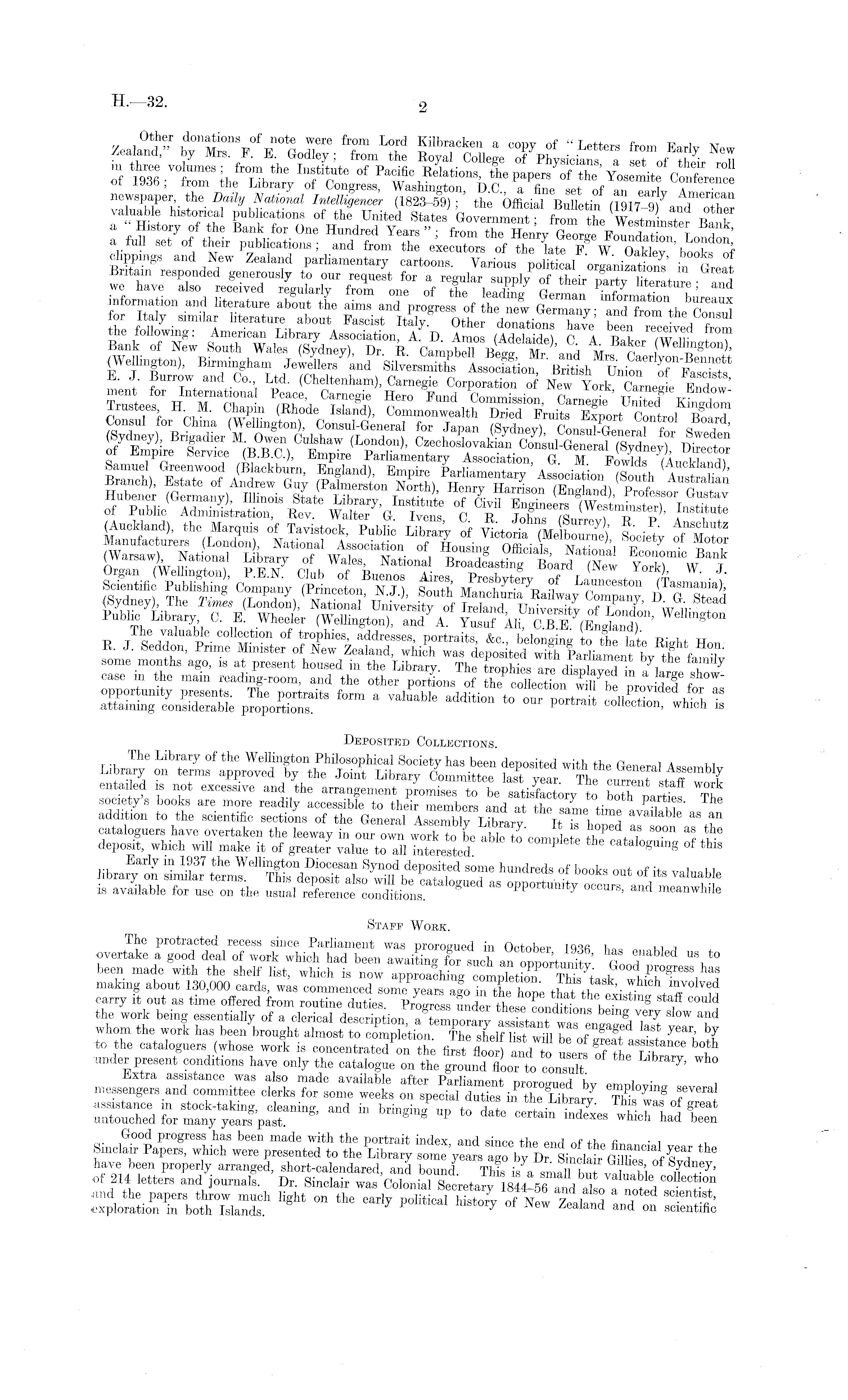 Zealand'" iTr *7* a copy of "Letters from Early New S SS -wr, Si'r S?olm'bluu aôut Tir v* ;™ M " «»> public,,,», of J United St. J the <w ItaLta B tk' a History of the Bank for One Hundred Years"; from the Henry George FoundaXn London u set of their publications; and from the executors of the late F W Oaklev 'books of «l pprngs »,„1 New Ze.l.nd p.rli.m.ntery cartoons. V.riou, politic! orLisa.S' in Great Britain responded generously to our request for a regular supply of their party literature ■ and' we have also received regularly from one of thp lar,riii,r n ■ n «erature, and the following: American Library Association, A. D Amos P A "R l /w ir 2 »s tees H M. Chapm (Rhode Island), Commonwealth Dried Fruits Exnort fYmtml ~rL (Sydney), Brigadier MffiKS), Sor of Empire Service (8.8.C.), Empire Parliamentary Association, G. M (AuckkndT Branch), ETS(pSSL^S, nT iSsr-Jts % %' ills R The valuable collection of trophies, addresses, portraits, &c„ belonging to the late Rieht Hon . J. Seddon, Prime Minister of New Zealand, which was deposited with Parliament bv the family some months ago, is at present housed in the Library. The trophies are dispkved n7w I 7 case m the mam reading-room, and the other portions of thecdSection wffl lILT f opportunity presents. The portraits form a valuable addition to our ItS K v attaining considerable proportions. portrait collection, which is Deposited Collections. mg I: b s,f« sns w Ti,f e f/rn entailed is not excessive and the arrangement promises to be satisfactory t K +V, society's books are more readily accessible to thek Members and at the s me V addition to the scientific sections of the General Assembly lihrarv T+ V available as an cataloguers have overtaken the leeway in our own work to be able to'complete th° P 't7 S °° n a # deposit, which will make it of greater value to all interested cataloguing of this Staff Wobk. The protracted recess since Parliament was prorogued in October mfi W a •overtake a good deal of work which had been awaiting for such an opportunity' P nT V 0 been made with the shelf list, which is now approaching completion THs task wHeh o^® 88 ! j making about 130,000 cards, was commenced some years ago in the hope that theexistit Vff u carry it out as time offered from routine duties Proems LrW •? , existm B staff could the work being essentially of a clerical 7? f whom the work has been brought almost to completion The shelf list will he nfJ t I ? to the cataloguers (whose work is concentrated on the first floor) and to users ? under present conditions have only the catalogue on the ground flLrTo consult 7 ' messengers c£L Trt Tl Good progress has been made with the portrait index, and since the end nf • 1 ,1 Sinclair Papers, which were presented to the Library some years aao bv [),- HiJi tave been properly arranged, short-calendared, and bound, Thfs is a small bS mthi «1 214 letters and journal.. Dr. Sinclair .a. Colonial Seor.to 184«6 and .to f noted Z 'T," and the papers throw much light on the early political history of AT™ 7 1 j f scientist, exploration in both Islands. 7 political History of New Zealand and on scientific