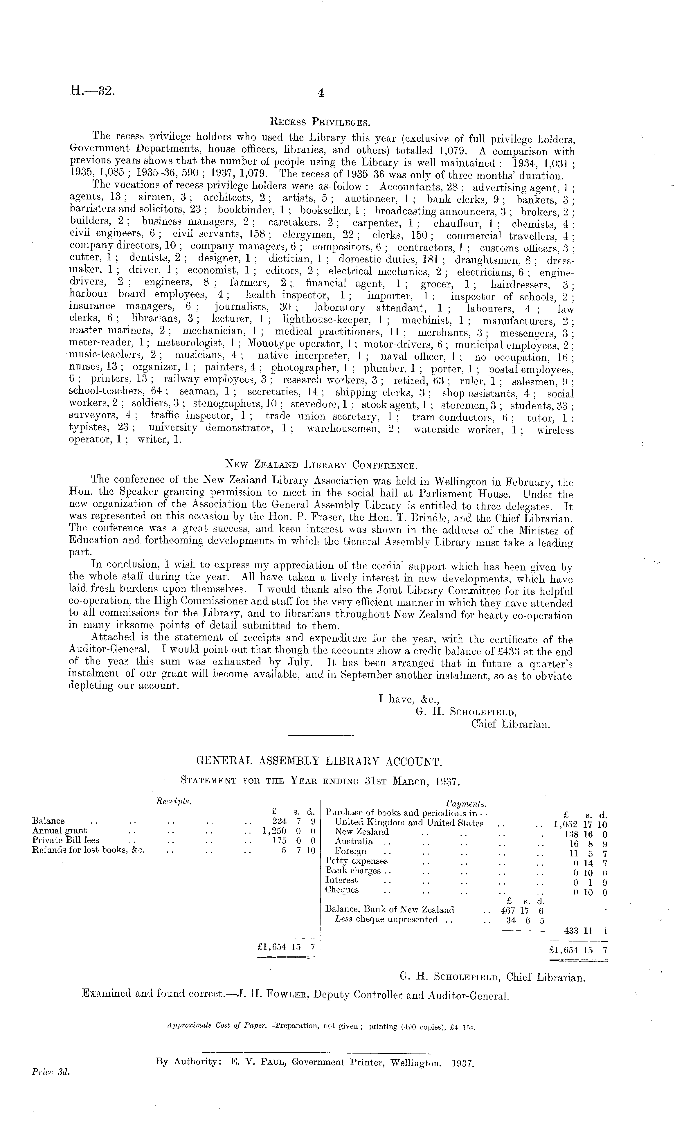 Recess Privileges. The recess privilege holders who used the Library this year (exclusive of full privilege holders, Government Departments, house officers, libraries, and others) totalled 1,079. A comparison with previous years shows that the number of people using the Library is well maintained : 1934, 1,031 ; 1935, 1,085 ; 1935-36, 590 ; 1937, 1,079. The recess of 1935-36 was only of three months' duration. The vocations of recess privilege holders were as-follow : Accountants, 28 ; advertising agent, 1 ; agents, 13 ; airmen, 3 ; architects, 2 ; artists, 5 ; auctioneer, 1 ; bank clerks, 9 ; bankers, 3 ; barristers and solicitors, 23 ; bookbinder, 1 ; bookseller, 1 ; broadcasting announcers, 3 ; brokers, 2 ; builders, 2 ; business managers, 2 ; caretakers, 2 ; carpenter, 1 ; chauffeur, 1 ; chemists, 4 ; civil engineers, 6 ; civil servants, 158 ; clergymen, 22 ; clerks, 150 ; commercial travellers, 4 ; company directors, 10 ; company managers, 6 ; compositors, 6 ; contractors, 1 ; customs officers, 3 ; cutter, 1 ; dentists, 2 ; designer, 1 ; dietitian, 1 ; domestic duties, 181 ; draughtsmen, 8 ; dressmaker, 1 ; driver, 1 ; economist, 1 ; editors, 2 ; electrical mechanics, 2 ; electricians, 6 ; enginedrivers, 2 ; engineers, 8 ; farmers, 2; financial agent, 1 ; grocer, 1 ; hairdressers, 3 ; harbour board employees, 4; health inspector, 1 ; importer, 1 ; inspector of schools, 2 ; insurance managers, 6 ; journalists, 30 ; laboratory attendant, 1 ; labourers, 4 ; 'law clerks, 6 ; librarians, 3 ; lecturer, 1 ; lighthouse-keeper, 1 ; machinist, 1 ; manufacturers, 2 ; master mariners, 2 ; mechanician, 1 ; medical practitioners, 11 ; merchants, 3 ; messengers, 3 ; meter-reader, 1; meteorologist, 1; Monotype operator, 1; motor-drivers, 6 ; municipal employees, 2 ; music-teachers, 2 ; musicians, 4 ; native interpreter, 1 ; naval officer, 1 ; no occupation, 16 ; nurses, 13 ; organizer, 1 ; painters, 4 ; photographer, 1 ; plumber, 1 ; porter, 1 ; postal employees, 6 ; printers, 13 ; railway employees, 3 ; research workers, 3 ; retired, 63 ; ruler, 1 ; salesmen, 9 ; school-teachers, 64 ; seaman, 1 ; secretaries, 14 ; shipping clerks, 3 ; shop-assistants, 4 ; social workers, 2 ; soldiers, 3 ; stenographers, 10 ; stevedore, 1 ; stock agent, 1 ; storemen, 3 ; students, 33 ; surveyors, 4 ; traffic inspector, 1 ; trade union secretary, 1 ; tram-conductors, 6 ; tutor, 1 ; typistes, 23 ; university demonstrator, 1 ; warehousemen, 2 ; waterside worker, 1 ; wireless operator, 1 ; writer, 1. New Zealand Library Conference. The conference of the New Zealand Library Association was held in Wellington in February, the Hon. the Speaker granting permission to meet in the social hall at Parliament House. Under the new organization of the Association the General Assembly Library is entitled to three delegates. It was represented on this occasion by the Hon. P. Fraser, the Hon. T. Brindle, and the Chief Librarian. The conference was a great success, and keen interest was shown in the address of the Minister of Education and forthcoming developments in which the General Assembly Library must take a leading part. In conclusion, I wish to express my appreciation of the cordial support which has been given by the whole staff during the year. All have taken a lively interest in new developments, which have laid fresh burdens upon themselves. I would thank also the Joint Library Committee for its helpful co-operation, the High Commissioner and staff for the very efficient manner in which they have attended to all commissions for the Library, and to librarians throughout New Zealand for hearty co-operation in many irksome points of detail submitted to them. Attached is the statement of receipts and expenditure for the year, with the certificate of the Auditor-General. I would point out that though the accounts show a credit balance of £433 at the end of the year this sum was exhausted by July. It has been arranged that in future a quarter's instalment of our grant will become available, and in September another instalment, so as to obviate depleting our account. I have, &c., G. H. SCHOLEFIELD, Chief Librarian.