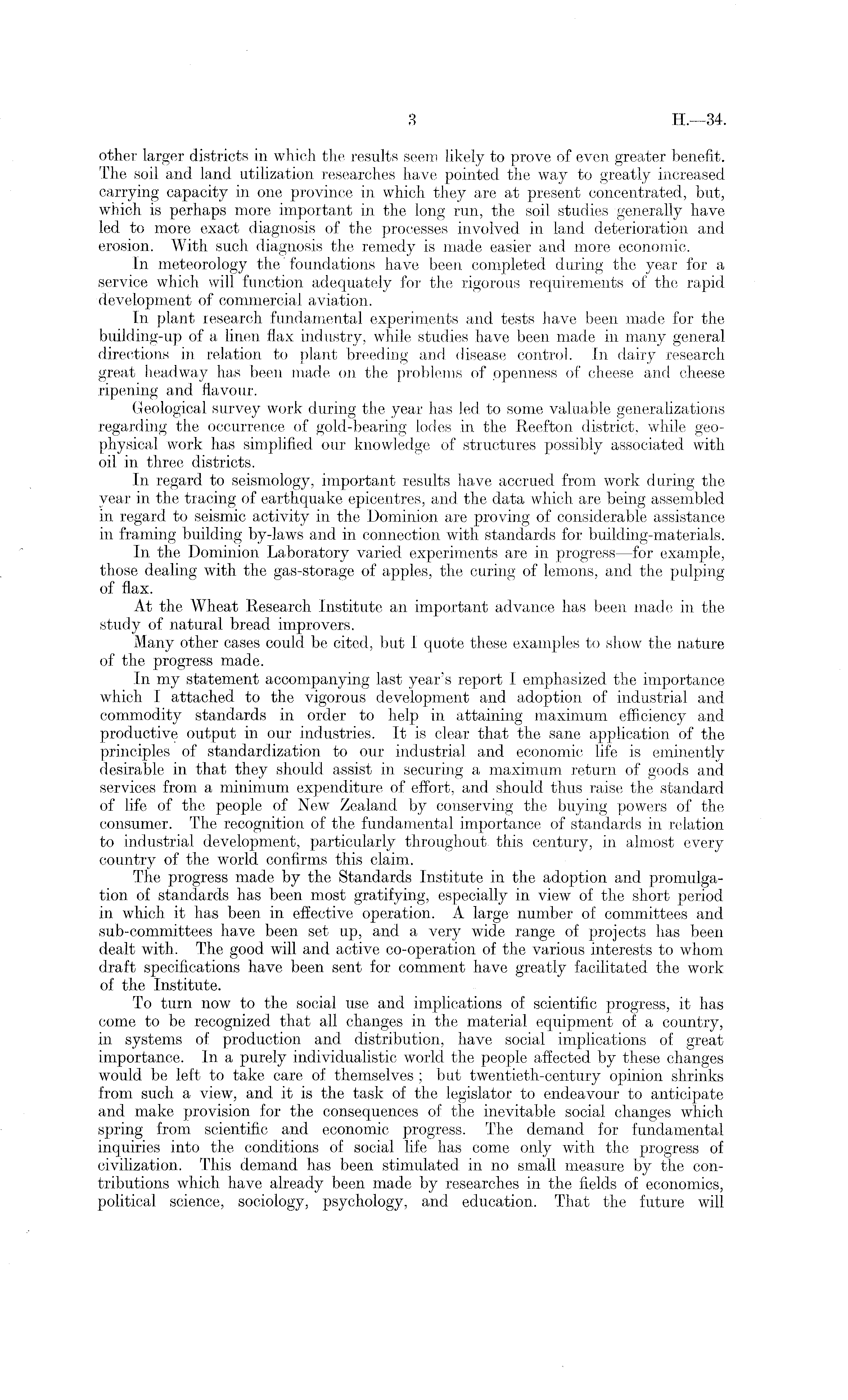other larger districts in which the results seem likely to prove of even greater benefit. The soil and land utilization researches have pointed the way to greatly increased carrying capacity in one province in which they are at present concentrated, but, which is perhaps more important in the long run, the soil studies generally have led to more exact diagnosis of the processes involved in land deterioration and erosion. With such diagnosis the remedy is made easier and more economic. In meteorology the' foundations have been completed during the year for a service which will function adequately for the rigorous requirements of the rapid development of commercial aviation. In plant research fundamental experiments and tests have been made for the building-up of a linen flax industry, while studies have been made in many general directions in relation to plant breeding and disease control. In dairy research great headway has been made on the problems of openness of cheese and cheese ripening and flavour. Geological survey work during the year has led to some valuable generalizations regarding the occurrence of gold-bearing lodes in the Reefton district, while geophysical work has simplified our knowledge of structures possibly associated with oil in three districts. In regard to seismology, important results have accrued from work during the year in the tracing of earthquake epicentres, and the data which are being assembled in regard to seismic activity in the Dominion are proving of considerable assistance in framing building by-laws and in connection with standards for building-materials. In the Dominion Laboratory varied experiments are in progress —for example, those dealing with the gas-storage of apples, the curing of lemons, and the pulping of flax. At the Wheat Research Institute an important advance has been made in the study of natural bread improvers. Many other cases could be cited, but I quote these examples to show the nature of the progress made. In my statement accompanying last year's report I emphasized the importance which I attached to the vigorous development and adoption of industrial and commodity standards in order to help in attaining maximum efficiency and productive output in our industries. It is clear that the sane application of the principles of standardization to our industrial and economic life is eminently desirable in that they should assist in securing a maximum return of goods and services from a minimum expenditure of effort, and should thus raise the standard of life of the people of New Zealand by conserving the buying powers of the consumer. The recognition of the fundamental importance of standards in relation to industrial development, particularly throughout this century, in almost every country of the world confirms this claim. The progress made by the Standards Institute in the adoption and promulgation of standards has been most gratifying, especially in view of the short period in which it has been in effective operation. A large number of committees and sub-committees have been set up, and a very wide range of projects has been dealt with. The good will and active co-operation of the various interests to whom draft specifications have been sent for comment have greatly facilitated the work of the Institute. To turn now to the social use and implications of scientific progress, it has come to be recognized that all changes in the material equipment of a country, in systems of production and distribution, have social implications of great importance. In a purely individualistic world the people affected by these changes would be left to take care of themselves ; but twentieth-century opinion shrinks from such a view, and it is the task of the legislator to endeavour to anticipate and make provision for the consequences of the inevitable social changes which spring from scientific and economic progress. The demand for fundamental inquiries into the conditions of social fife has come only with the progress of civilization. This demand has been stimulated in no small measure by the contributions which have already been made by researches in the fields of economics, political science, sociology, psychology, and education. That the future will