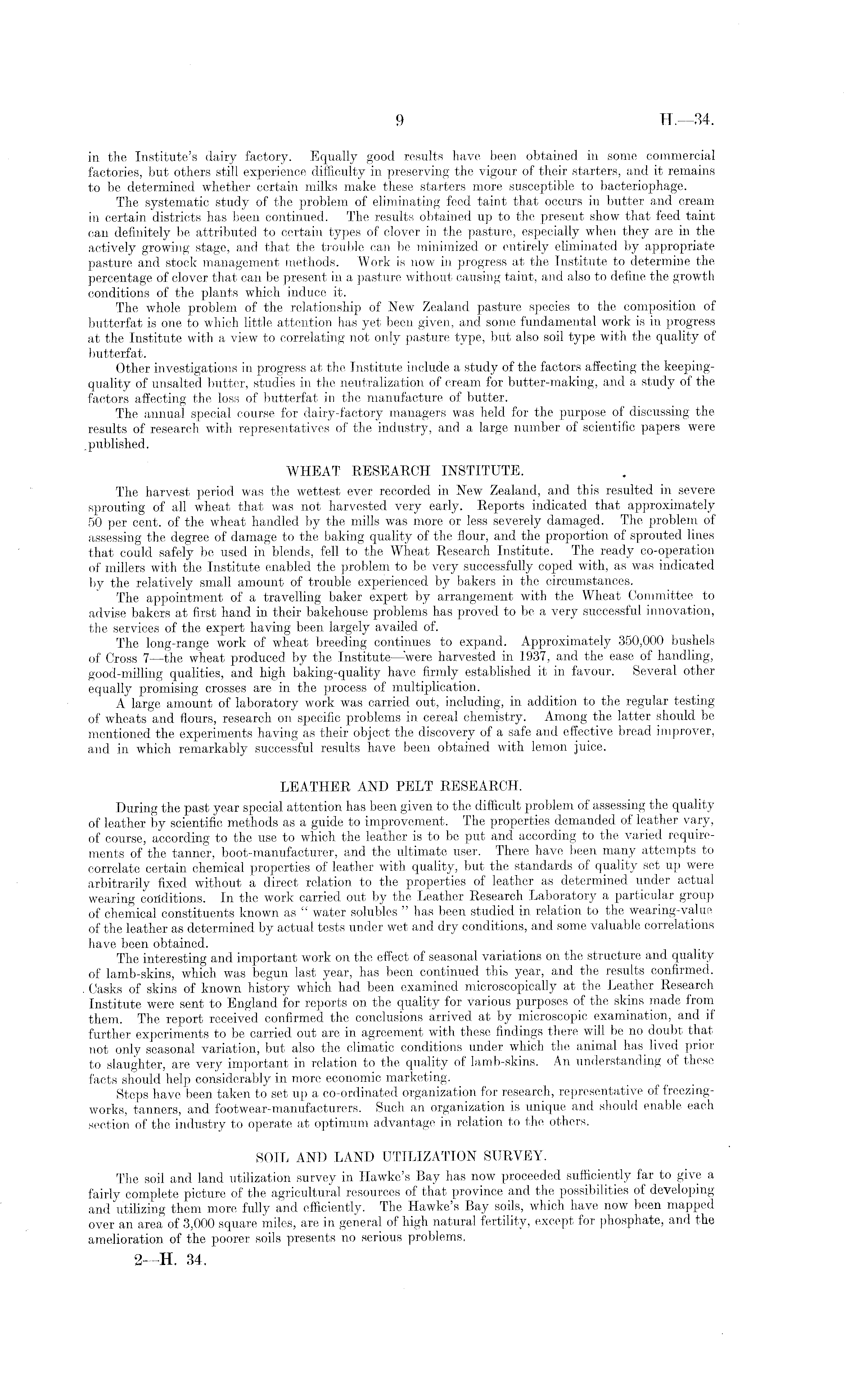 in the Institute's dairy factory. Equally good results have been obtained in some commercial factories, but others still experience difficulty in preserving the vigour of their starters, and it remains to be determined whether certain milks make these starters more susceptible to bacteriophage. The systematic study of the problem of eliminating feed taint that occurs in butter and cream in certain districts has been continued. The results obtained up to the present show that feed taint can definitely be attributed to certain types of clover in the pasture, especially when they are in the actively growing stage, and that the trouble can be minimized or entirely eliminated by appropriate pasture and stock management methods. Work is now in progress at the Institute to determine the percentage of clover that can be present in a pasture without causing taint, and also to define the growth conditions of the plants which induce it. The whole problem of the relationship of New Zealand pasture species to the composition of butterfat is one to which little attention has yet been given, and some fundamental work is in progress at the Institute with a view to correlating not only pasture type, but also soil type with the quality of butterfat. Other investigations in progress at the Institute include a study of the factors affecting the keepingquality of unsalted butter, studies in the neutralization of cream for butter-making, and a study of the factors affecting the loss of butterfat in the manufacture of butter. The annual special course for dairy-factory managers was held for the purpose of discussing the results of research with representatives of the industry, and a large number of scientific papers were published. WHEAT RESEARCH INSTITUTE. The harvest period was the wettest ever recorded in New Zealand, and this resulted in severe sprouting of all wheat that was not harvested very early. Reports indicated that approximately 50 per cent, of the wheat handled by the mills was more or less severely damaged. The problem of assessing the degree of damage to the baking quality of the flour, and the proportion of sprouted lines that could safely be used in blends, fell to the Wheat Research Institute. The ready co-operation of millers with the Institute enabled the problem to be very successfully coped with, as was indicated by the relatively small amount of trouble experienced by bakers in the circumstances. The appointment of a travelling baker expert by arrangement with the Wheat Committee to advise bakers at first hand in their bakehouse problems has proved to be a very successful innovation, the services of the expert having been largely availed of. The long-range work of wheat breeding continues to expand. Approximately 350,000 bushels of Cross 7—the wheat produced by the Institute —'were harvested in 1937, and the ease of handling, good-milling qualities, and high baking-quality have firmly established it in favour. Several other equally promising crosses are in the process of multiplication. A large amount of laboratory work was carried out, including, in addition to the regular testing of wheats and flours, research on specific problems in cereal chemistry. Among the latter should be mentioned the experiments having as their object the discovery of a safe and effective bread improver, and in which remarkably successful results have been obtained with lemon juice. * LEATHER AND PELT RESEARCH. During the past year special attention has been given to the difficult problem of assessing the quality of leather by scientific methods as a guide to improvement. The properties demanded of leather vary, of course, according to the use to which the leather is to be put and according to the varied requirements of the tanner, boot-manufacturer, and the ultimate user. There have been many attempts to correlate certain chemical properties of leather with quality, but the standards of quality set up were arbitrarily fixed without a direct relation to the properties of leather as determined under actual wearing conditions. In the work carried out by the Leather Research Laboratory a particular group of chemical constituents known as " water solubles " has been studied in relation to the wearing-value of the leather as determined by actual tests under wet and dry conditions, and some valuable correlations have been obtained. The interesting and important work on the effect of seasonal variations on the structure and quality of lamb-skins, which was begun last year, has been continued this year, and the results confirmed. Casks of skins of known history which had been examined microscopically at the Leather Research Institute were sent to England for reports on the quality for various purposes of the skins made from them. The report received confirmed the conclusions arrived at by microscopic examination, and if further experiments to be carried out are in agreement with these findings there will be no doubt that not only seasonal variation, but also the climatic conditions under which the animal has lived prior to slaughter, are very important in relation to the quality of lamb-skins. An understanding of these facts should help considerably in more economic marketing. Steps have been taken to set up a co-ordinated organization for research, representative of freezingworks, tanners, and footwear-manufacturers. Such an organization is unique and should enable each section of the industry to operate at optimum advantage in relation to the others. SOIL AND LAND UTILIZATION SURVEY. The soil and land utilization survey in Hawke's Bay has now proceeded sufficiently far to give a fairly complete picture of the agricultural resources of that province and the possibilities of developing and utilizing them more fully and efficiently. The Hawke s Bay soils, which have now been mapped over an area of 3,000 square miles, are in general of high natural fertility, except for phosphate, and the amelioration of the poorer 