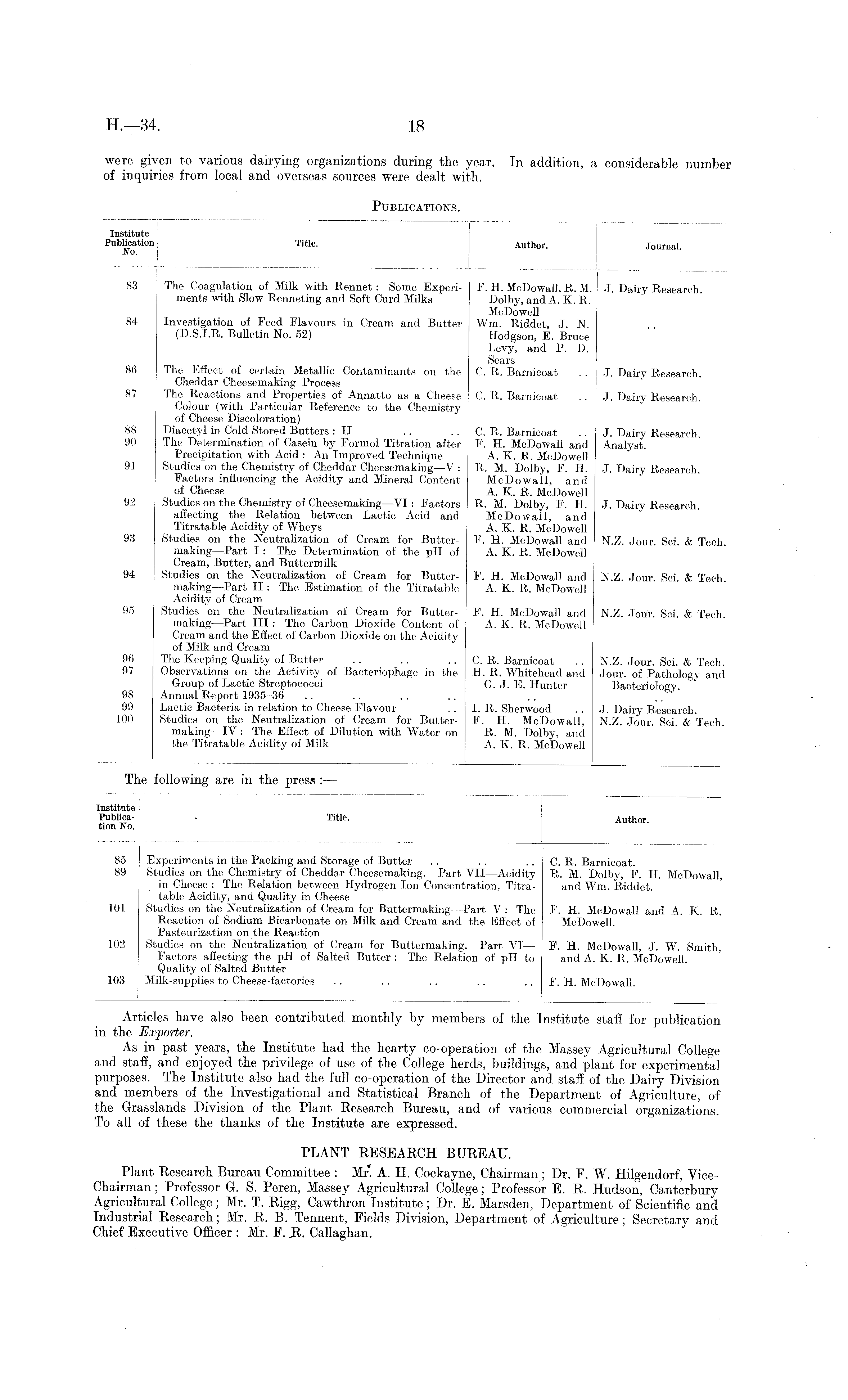 Articles have also been contributed monthly by members of the Institute staff for publication in the Exporter. As in past years, the Institute had the hearty co-operation of the Massey Agricultural College and staff, and enjoyed the privilege of use of the College herds, buildings, and plant for experimental purposes. The Institute also had the full co-operation of the Director and staff of the Dairy Division and members of the Investigational and Statistical Branch of the Department of Agriculture, of the Grasslands Division of the Plant Research Bureau, and of various commercial organizations. To all of these the thanks of the Institute are expressed. PLANT RESEARCH BUREAU. Plant Research Bureau Committee : Mr. A. H. Cockayne, Chairman; Dr. F. W. Hilgendorf, ViceChairman; Professor G. S. Peren, Massey Agricultural College; Professor E. R. Hudson, Canterbury Agricultural College; Mr. T. Rigg, Cawthron Institute; Dr. E. Marsden, Department of Scientific and Industrial Research; Mr. R. B. Tennent, Fields Division, Department of Agriculture; Secretary and Chief Executive Officer : Mr. F. ,R. Callaghan.