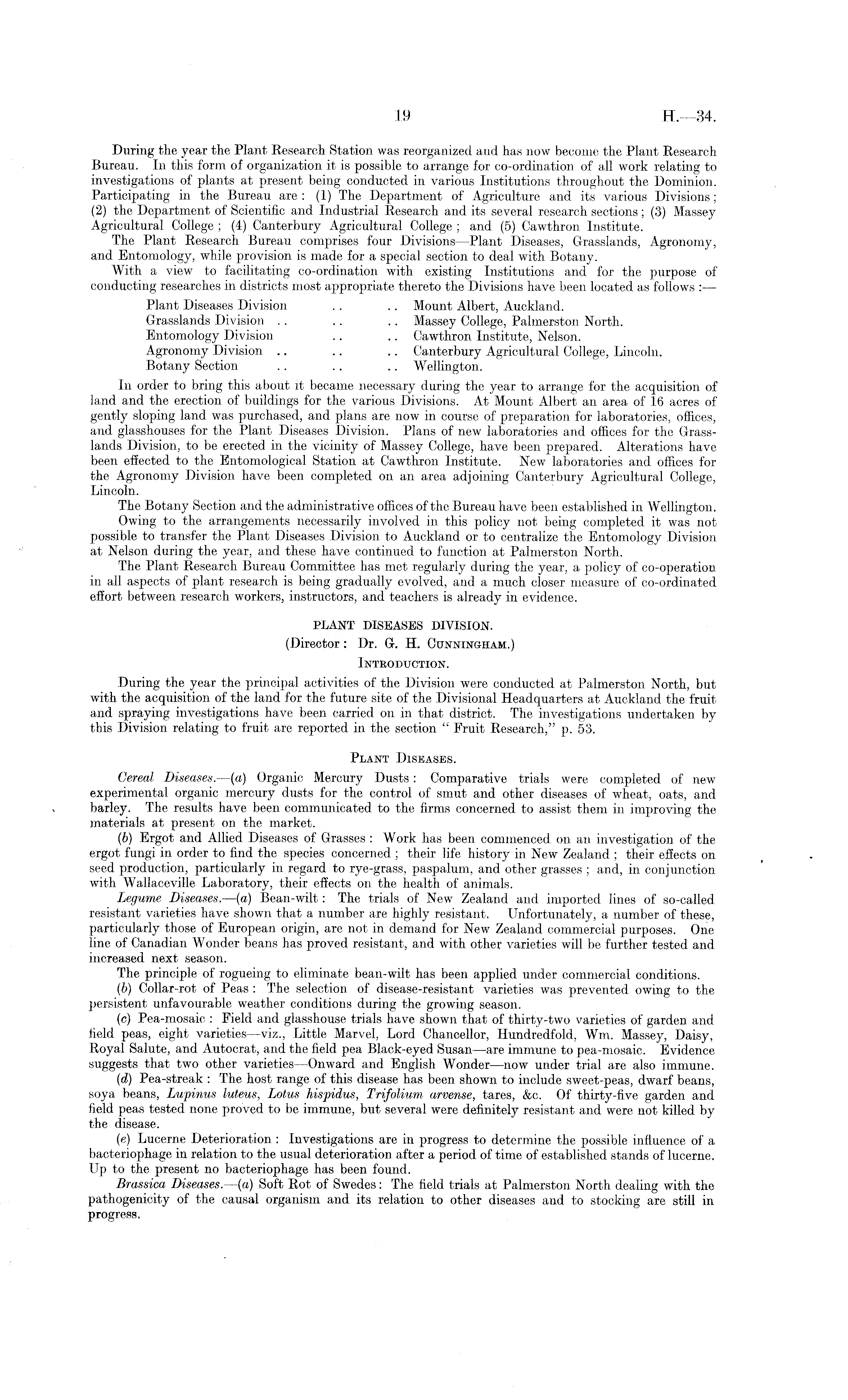 During the year the Plant Research Station was reorganized and has now become the Plant Research Bureau. In this form of organization it is possible to arrange for co-ordination of all work relating to investigations of plants at present being conducted in various Institutions throughout the Dominion. Participating in the Bureau are: (1) The Department of Agriculture and its various Divisions; (2) the Department of Scientific and Industrial Research and its several research sections; (3) Massey Agricultural College ; (4) Canterbury Agricultural College ; and (5) Cawthron. Institute. The Plant Research Bureau comprises four Divisions—Plant Diseases, Grasslands, Agronomy, and Entomology, while provision is made for a special section to deal with Botany. With a view to facilitating co-ordination with existing Institutions and for the purpose of conducting researches in districts most appropriate thereto the Divisions have been located as follows :— Plant Diseases Division . . .. Mount Albert, Auckland. Grasslands Division .. .. . . Massey College, Palmerston North. Entomology Division .. .. Cawthron Institute, Nelson. Agronomy Division .. .. .. Canterbury Agricultural College, Lincoln. Botany Section .. .. .. Wellington. In order to bring this about it became necessary during the year to arrange for the acquisition of land and the erection of buildings for the various Divisions. At Mount Albert an area of 16 acres of gently sloping land was purchased, and plans are now in course of preparation for laboratories, offices, and glasshouses for the Plant Diseases Division. Plans of new laboratories and offices for the Grasslands Division, to be erected in the vicinity of Massey College, have been prepared. Alterations have been effected to the Entomological Station at Cawthron Institute. New laboratories and offices for the Agronomy Division have been completed on an area adjoining Canterbury Agricultural College, Lincoln. The Botany Section and the administrative offices of the Bureau have been established in Wellington. Owing to the arrangements necessarily involved in this policy not being completed it was not possible to transfer the Plant Diseases Division to Auckland or to centralize the Entomology Division at Nelson during the year, and these have continued to function at Palmerston North. The Plant Research Bureau Committee has met regularly during the year, a policy of co-operation in all aspects of plant research is being gradually evolved, and a much closer measure of co-ordinated effort between research workers, instructors, and teachers is already in evidence. PLANT DISEASES DIVISION. (Director: Dr. G. H. Cunningham.) Introduction. During the year the principal activities of the Division were conducted at Palmerston North, but with the acquisition of the land for the future site of the Divisional Headquarters at Auckland the fruit and spraying investigations have been carried on in that district. The investigations undertaken by this Division relating to fruit are reported in the section " Fruit Research," p. 53. Plant Diseases. Cereal Diseases. —(a) Organic Mercury Dusts: Comparative trials were completed of new experimental organic mercury dusts for the control of smut and other diseases of wheat, oats, and barley. The results have been communicated to the firms concerned to assist them in improving the materials at present on the market. (b) Ergot and Allied Diseases of Grasses : Work has been commenced on an investigation of the ergot fungi in order to find the species concerned ; their life history in New Zealand ; their effects on seed production, particularly in regard to rye-grass, paspalum, and other grasses ; and, in conjunction with Wallaceville Laboratory, their effects on the health of animals. Legume Diseases. —(a) Bean-wilt: The trials of New Zealand and imported lines of so-called resistant varieties have shown that a number are highly resistant. Unfortunately, a number of these, particularly those of European origin, are not in demand for New Zealand commercial purposes. One line of Canadian Wonder beans has proved resistant, and with other varieties will be further tested and increased next season. The principle of rogueing to eliminate bean-wilt has been applied under commercial conditions. (b) Collar-rot of Peas : The selection of disease-resistant varieties was prevented owing to the persistent unfavourable weather conditions during the growing season. (c) Pea-mosaic : Field and glasshouse trials have shown that of thirty-two varieties of garden and field peas, eight varieties —viz., Little Marvel, Lord Chancellor, Hundredfold, Wm. Massey, Daisy, Royal Salute, and Autocrat, and the field pea Black-eyed Susan —are immune to pea-mosaic. Evidence suggests that two other varieties —Onward and English Wonder —now under trial are also immune. (d) Pea-streak : The host range of this disease has been shown to include sweet-peas, dwarf beans, soya beans, Lupinus luteus, Lotus hispidus, Trifolium arvense, tares, &c. Of thirty-five garden and field peas tested none proved to be immune, but several were definitely resistant and were not killed by the disease. (e) Lucerne Deterioration : Investigations are in progress to determine the possible influence of a bacteriophage in relation to the usual deterioration after a period of time of established stands of lucerne. Up to the present no bacteriophage has been found. Brassica Diseases. —(a) Soft Rot of Swedes: The field trials at Palmerston North dealing with the pathogenicity of the causal organism and its relation to other diseases and to stocking are still in progress.