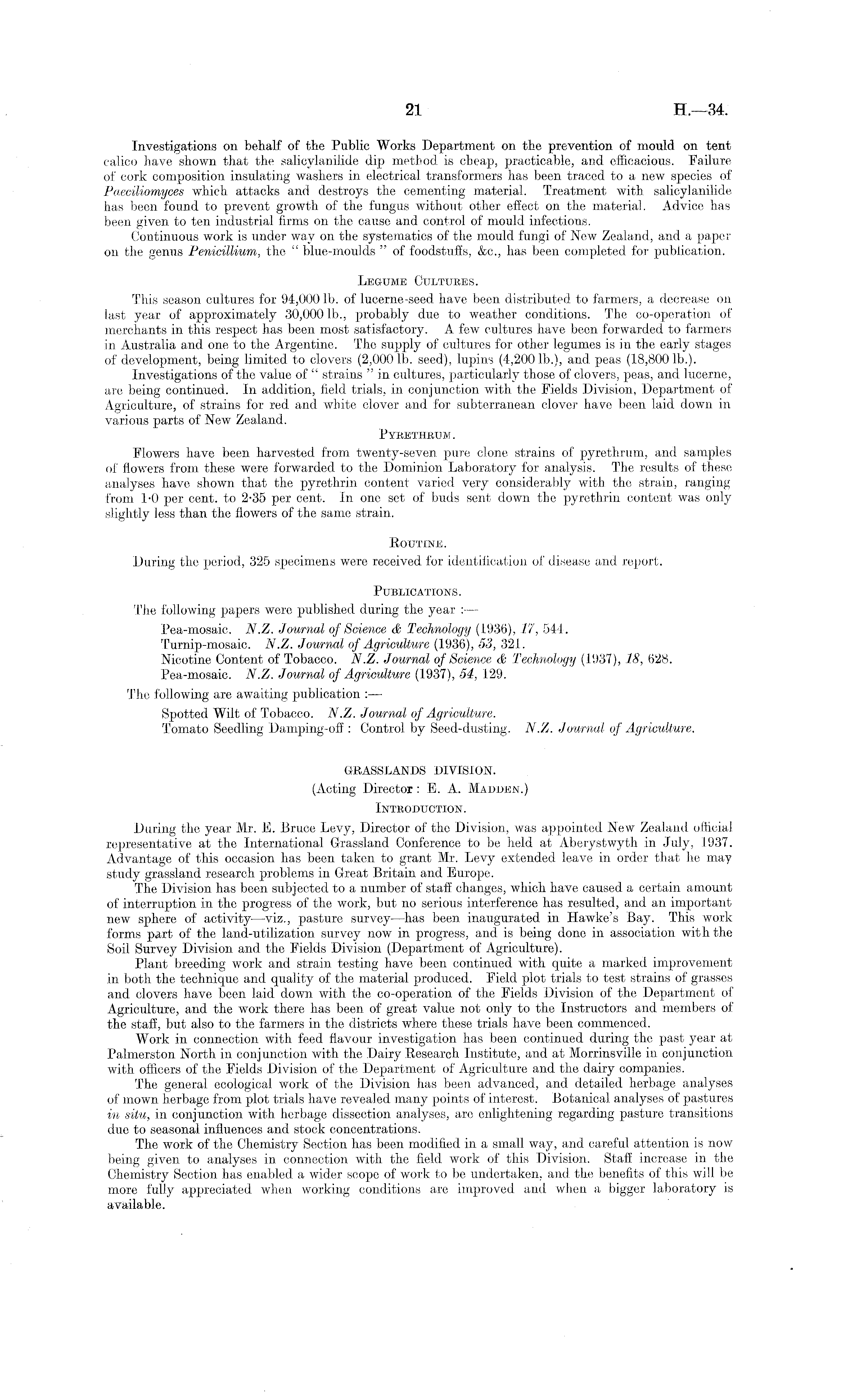 Investigations on behalf of the Public Works Department on the prevention of mould on tent calico have shown that the salicylanilide dip method, is cheap, practicable, and efficacious. Failure of cork composition insulating washers in electrical transformers has been traced to a new species of Paeciliomyces which attacks and destroys the cementing material. Treatment with salicylanilide has been found to prevent growth of the fungus without other eflect on the material. Advice has been given to ten industrial firms on the cause and control of mould infections. Continuous work is under way on the systematics of the mould fungi of New Zealand, and a paper on the genus Penicillium, the " blue-moulds " of foodstuffs, &c., has been completed for publication. Legume Cultures. This season cultures for 94,000 lb. of lucerne-seed have been distributed to farmers, a decrease on last year of approximately 30,000 lb., probably due to weather conditions. The co-operation of merchants in this respect has been most satisfactory. A few cultures have been forwarded to farmers in Australia and one to the Argentine. The supply of cultures for other legumes is in the early stages of development, being limited to clovers (2,0001b. seed), lupins (4,2001b.), and peas (18,8001b.). Investigations of the value of " strains " in cultures, particularly those of clovers, peas, and lucerne, are being continued. In addition, field trials, in conjunction with the Fields Division, Department of Agriculture, of strains for red and white clover and for subterranean clover have been laid down in various parts of New Zealand. Pyrethrum. Flowers have been harvested from twenty-seven, pure clone strains of pyrethrum, and samples of flowers from these were forwarded to the Dominion Laboratory for analysis. The results of these analyses have shown that the pyrethrin content varied very considerably with the strain, ranging from 1-0 per cent, to 2-35 per cent. In one set of buds sent down the pyrethrin content was only slightly less than the flowers of the same strain. Routine. During the period, 325 specimens were received for identification of disease and report. Publications. The following papers were published during the year : — Pea-mosaic. N.Z. Journal of Science & Technology (1936), 17, 544. Turnip-mosaic. N.Z. Journal of Agriculture (1936), 53, 321. Nicotine Content of Tobacco. N.Z. Journal of Science <& Technology (1937), 18, 628. Pea-mosaic. N.Z. Journal of Agriculture (1937), 54, 129. The following are awaiting publication : — Spotted Wilt of Tobacco. N.Z. Journal of Agriculture. Tomato Seedling Damping-off: Control by Seed-dusting. N.Z. Journal of Agriculture. GRASSLANDS DIVISION. (Acting Director: E. A. Madden.) Introduction. During the year Mr. E. Bruce Levy, Director of the Division, was appointed New Zealand official representative at the International Grassland Conference to be held at Aberystwyth in July, 1937. Advantage of this occasion has been taken to grant Mr. Levy extended leave in order that he may study grassland research problems in Great Britain and Europe. The Division has been subjected to a number of staff changes, which have caused a certain amount of interruption in the progress of the work, but no serious interference has resulted, and an important new sphere of activity —viz., pasture survey —has been, inaugurated in Hawke's Bay. This work forms part of the land-utilization survey now in progress, and is being done in association with the Soil Survey Division and the Fields Division (Department of Agriculture). Plant breeding work and strain testing have been continued with quite a marked improvement in both the technique and quality of the material produced. Field plot trials to test strains of grasses and clovers have been laid down with the co-operation of the Fields Division of the Department of Agriculture, and the work there has been of great value not only to the Instructors and members of the stafi, but also to the farmers in the districts where these trials have been commenced. Work in connection with feed flavour investigation has been continued during the past year at Palmerston North in conjunction with the Dairy Research Institute, and at Morrinsville in conjunction with officers of the Fields Division of the Department of Agriculture and the dairy companies. The general ecological work of the Division has been advanced, and detailed herbage analyses of mown herbage from plot trials have revealed many points of interest. Botanical analyses of pastures in situ, in conjunction with herbage dissection analyses, are enlightening regarding pasture transitions due to seasonal influences and stock concentrations. The work of the Chemistry Section has been modified in a small way, and careful attention is now being given to analyses in connection with the field work of this Division. Staff increase in the Chemistry Section has enabled a wider scope of work to be undertaken, and the benefits of this will be more fully appreciated when working conditions are improved and when a bigger laboratory is available.