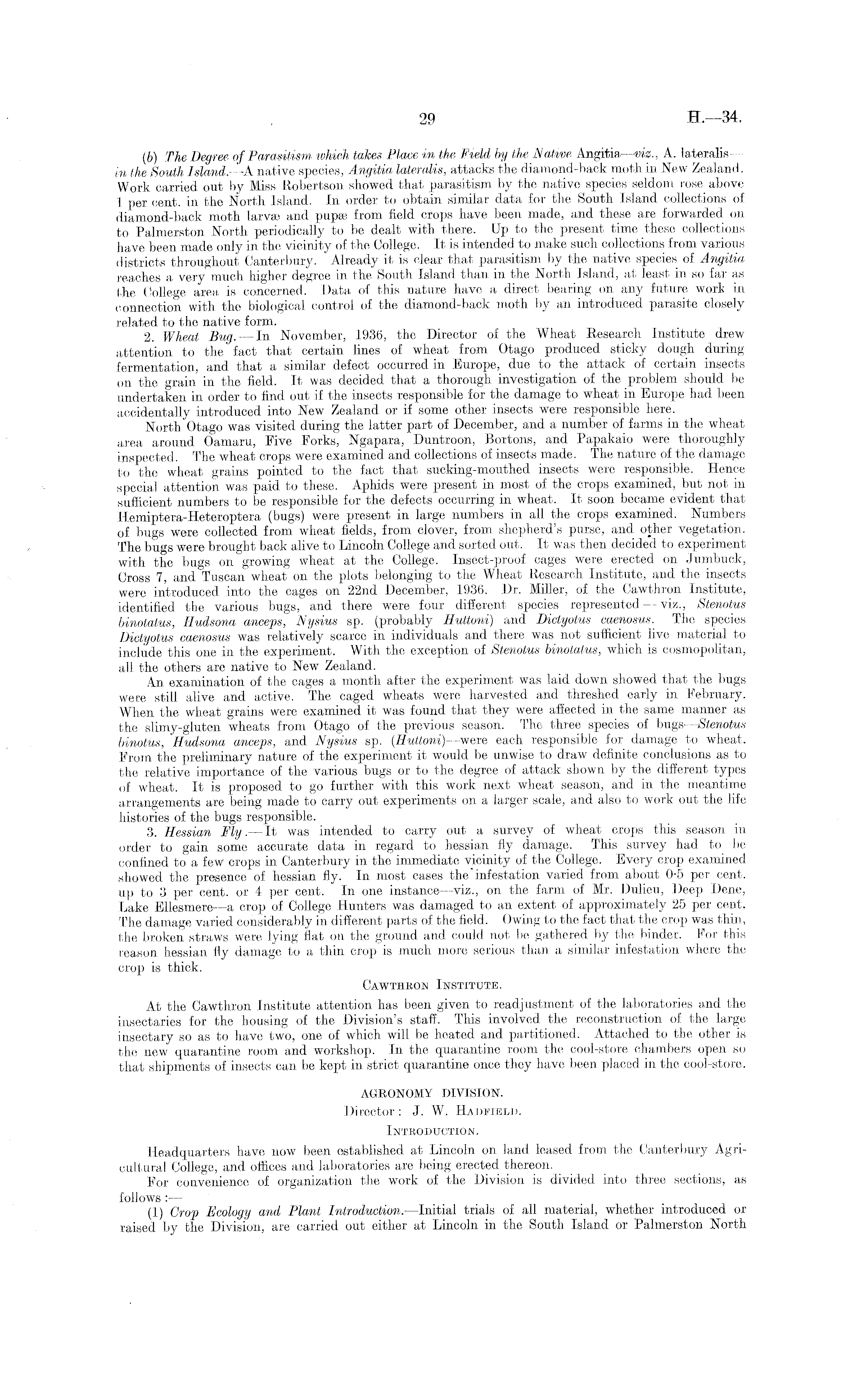 (6) The Degree of Parasitism which takes Place in the Field by the Native Angitia —viz., A. lateralis — in the South Island.—A native species, Angitia lateralis, attacks the diamond-back moth in New Zealand. Work carried out by Miss Robertson showed that parasitism by the native species seldom rose above 1 per cent, in the North Island. In order to obtain similar data for the South Island collections of diamond-back moth larvse and pup® from field crops have been made, and these are forwarded on to Palmerston North periodically to be dealt with there. Up to the present time these collections have been made only in the vicinity of the College. It is intended to make such collections from various districts throughout Canterbury. Already it is clear that parasitism by the native species of Angitia reaches a very much higher degree in the South Island than in the North Island, at least, in so far as the College area is concerned. Data of this nature have a direct bearing 011 any future work in connection with the biological control of the diamond-back moth by an introduced parasite closely related to the native form. 2. Wheat Bug. —In November, 1936, the Director of the Wheat Research Institute drew attention to the fact that certain lines of wheat from Otago produced sticky dough during fermentation, and that a similar defect occurred in Europe, due to the attack of certain insects on the grain in the field. It was decided that a thorough investigation of the problem should be undertaken in order to find out if the insects responsible for the damage to wheat in Europe had been accidentally introduced into New Zealand or if some other insects were responsible here. North Otago was visited during the latter part of December, and a number of farms in the wheat area around Oamaru, Five Forks, Ngapara, Duntroon, Bortons, and Papakaio were thoroughly inspected. The wheat crops were examined and collections of insects made. The nature of the damage to the wheat grains pointed to the fact that sucking-mouthed insects were responsible. Hence special attention was paid to these. Aphids were present in most of the crops examined, but not in sufficient numbers to be responsible for the defects occurring in wheat. It soon became evident that Hemiptera-Heteroptera (bugs) were present in large numbers in all the crops examined. Numbers of bugs were collected from wheat fields, from clover, from shepherd's purse, and other vegetation. The bugs were brought-back alive to Lincoln College and sorted out. It was then decided to experiment with the bugs on growing wheat at the College. Insect-proof cages were erected on Jumbuck, Cross 7, and Tuscan wheat on the plots belonging to the Wheat Research Institute, and the insects were introduced into the 22nd December, 1936. Dr. Miller, of the Cawthron Institute, identified the various bugs, and there were four different, species represented — viz., Stenotus binotatus, Hudsona anceps, Nysius sp. (probably Huttoni) and Dictyotus caenosus. The species Dictyotus caenosus was relatively scarce in individuals and there was not sufficient live material to include this one in the experiment. With the exception of Stenotus binotatus, which is cosmopolitan, all the others are native to New Zealand. An examination of the cages a month after the experiment was laid down showed that the bugs were still alive and active. The caged wheats were harvested and threshed early in February. When the wheat grains were examined it was found that they were affected in the same manner as the slimy-gluten wheats from Otago of the previous season. The three species of bugs—Stenotus binotus, Hudsona anceps, and Nysius sp. (Huttoni) —were each responsible for damage to wheat. From the preliminary nature of the experiment it would be unwise to draw definite conclusions as to the relative importance of the various bugs or to the degree of attack shown by the different types of wheat. It is proposed to go further with this work next wheat season, and in the meantime arrangements are being made to carry out, experiments on a larger scale, and also to work out the life histories of the bugs responsible. 3. Hessian Fly.— It was intended to carry out a survey of wheat crops this season in order to gain some accurate data in regard to hessian fly damage. This survey had to be confined to a few crops in Canterbury in the immediate vicinity of the College. Every crop examined showed the presence of hessian fly. In most cases the "infestation varied from about 0-5 per cent,, up to 3 per cent, or 4 per cent. In one instance—viz., on the farm of Mr. Dulieu, Deep Dene, Lake Ellesmere —a crop of College Hunters was damaged to an extent, of approximately 25 per cent. The damage varied considerably in different parts of the field. Owing to the fact that the crop was thin, the broken straws were lying fiat on the ground and could not be gathered by the binder. For this reason hessian fly damage to a thin crop is much more serious than a similar infestation where the crop is thick. Cawthron Institute. At the Cawthron Institute attention has been given to readjustment of the laboratories and the insectaries for the housing of the Division's staff. This involved the reconstruction of the large insectary so as to have two, one of which will be heated and partitioned. Attached to the other is the new quarantine room and workshop. In the quarantine room the cool-store chambers open so that shipments of insects can be kept in strict quarantine once they have been placed in the cool-store. AGRONOMY DIVISION. Director : J. W. Hadfield, Introduction. Headquarters have now been established at Lincoln on land leased from the Canterbury Agricultural College, and offices and laboratories are being erected thereon. For convenience of organization the work of the Division is divided into three sections, as follows : — (1) Crop Ecology and Plant Introduction. —Initial trials of all material, whether int