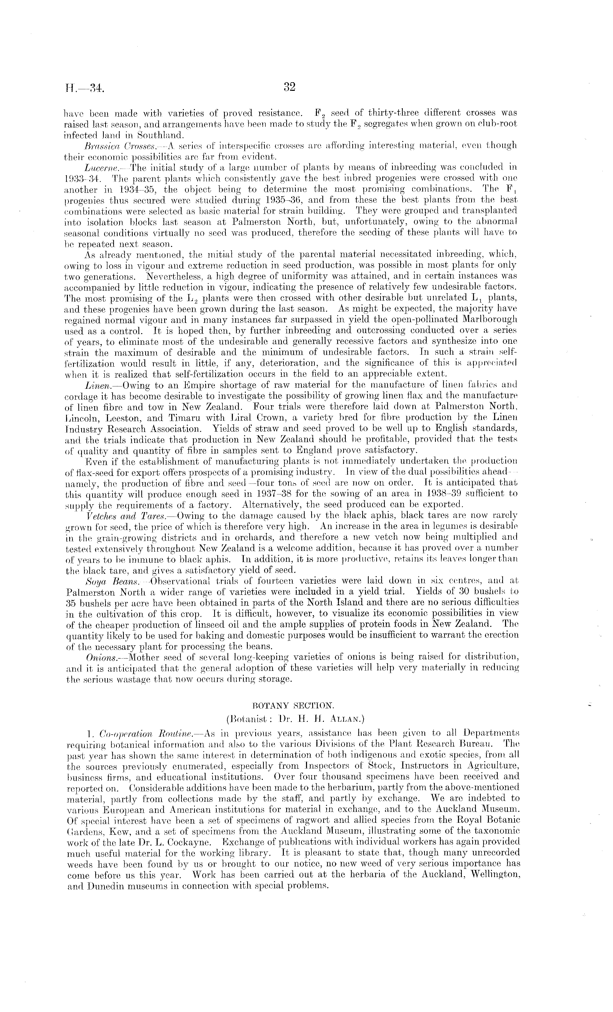 have been made with, varieties of proved resistance. F 2 seed of thirty-three different crosses was raised last season, and arrangements have been made to study the F 2 segregates when grown on club-root infected land in Southland. Brassica Crosses. —A series of interspecific crosses are affording interesting material, even though their economic possibilities are far from evident. Lucerne. —The initial study of a large number of plants by means of inbreeding was concluded in 1933-34. The parent plants which consistently gave the best inbred progenies were crossed with one another in 1934-35, the object being to determine the most promising combinations. The progenies thus secured were studied during 1935-36, and from these the best plants from the best combinations were selected as basic material for strain building. They were grouped and transplanted into isolation blocks last season at Palmerston North, but, unfortunately, owing to the abnormal seasonal conditions virtually no seed was produced, therefore the seeding of these plants will have to be repeated next season. As already mentioned, the initial study of the parental material necessitated inbreeding, which, owing to loss in vigour and extreme reduction in seed production, was possible in most plants for only two generations. Nevertheless, a high degree of uniformity was attained, and in certain instances was accompanied by little reduction in vigour, indicating the presence of relatively few undesirable factors. The most promising of the L 2 plants were then crossed with other desirable but unrelated L 1 plants, and these progenies have been grown during the last season. As might be expected, the majority have regained normal vigour and in many instances far surpassed in yield the open-pollinated Marlborough used as a control. It is hoped then, by further inbreeding and outcrossing conducted over a series of years, to eliminate most of the undesirable and generally recessive factors and synthesize into one strain the maximum of desirable and the minimum of undesirable factors. In such a strain selffertilization would result in little, if any, deterioration, and the significance of this is appreciated when it is realized that self-fertilization occurs in the field to an appreciable extent. Linen. —Owing to an Empire shortage of raw material for the manufacture of linen fabrics and cordage it has become desirable to investigate the possibility of growing linen flax and the manufacture of linen fibre and tow in New Zealand. Four trials were therefore laid down, at Palmerston North, Lincoln, Leeston, and Timaru with Liral Crown, a variety bred for fibre production by the Linen Industry Research Association. Yields of straw and seed proved to be well up to English standards, and. the trials indicate that production in New Zealand should be profitable, provided that the tests of quality and quantity of fibre in samples sent to England prove satisfactory. Even if the establishment of manufacturing plants is not immediately undertaken the production of flax-seed for export offers prospects of a promising industry. In view of the dual possibilities ahead— namely, the production of fibre and seed —four tons of seed are now on order. It is anticipated that this quantity will produce enough seed in 1937-38 for the sowing of an area in 1938-39 sufficient to supply the requirements of a factory. Alternatively, the seed produced can be exported. Vetches and Tares. —Owing to the damage caused by the black aphis, black tares are now rarely grown for seed, the price of which is therefore very high. An increase in the area in legumes is desirable in the grain-growing districts and in orchards, and therefore a new vetch now being multiplied and tested extensively throughout New Zealand is a welcome addition, because it has proved over a number of years to be immune to black aphis. In addition, it is more productive, retains its leaves longer than the black tare, and gives a satisfactory yield of seed. Soya Beans. —Observational trials of fourteen varieties were laid down in six centres, and at Palmerston North a wider range of varieties were included in a yield trial. Yields of 30 bushels to 35 bushels per acre have been obtained in parts of the North Island and there are no serious difficulties in the cultivation of this crop. It is difficult, however, to visualize its economic possibilities in view of the cheaper production of linseed oil and the ample supplies of protein foods in New Zealand. The quantity likely to be used for baking and domestic purposes would be insufficient to warrant the erection of the necessary plant for processing the beans. Onions. —Mother seed of several long-keeping varieties of onions is being raised for distribution, and it is anticipated that the general adoption of these varieties will help very materially in reducing the serious wastage that now occurs during storage. BOTANY SECTION. (Botanist: Dr. H. H. Allan.) 1. Co-operation Routine. —As in previous years, assistance has been given to all Departments requiring botanical information and also to the various Divisions of the Plant Research Bureau. The past year has shown the same interest in determination of both indigenous and exotic species, from all the sources previously enumerated, especially from Inspectors of Stock, Instructors in Agriculture, business firms, and educational institutions. Over four thousand specimens have been received and reported on. Considerable additions have been made to the herbarium, partly from the above-mentioned material, partly from collections made by the staff, and partly by exchange. We are indebted to various European and American institutions for material in exchange, and to the Auckland Museum. Of special interest have been a set of specimens of ragwort and allied species from the Royal Botanic Gardens, Kew, and a set of specimens from the Auckland Museum, illustrating some of the taxonomic work of the la