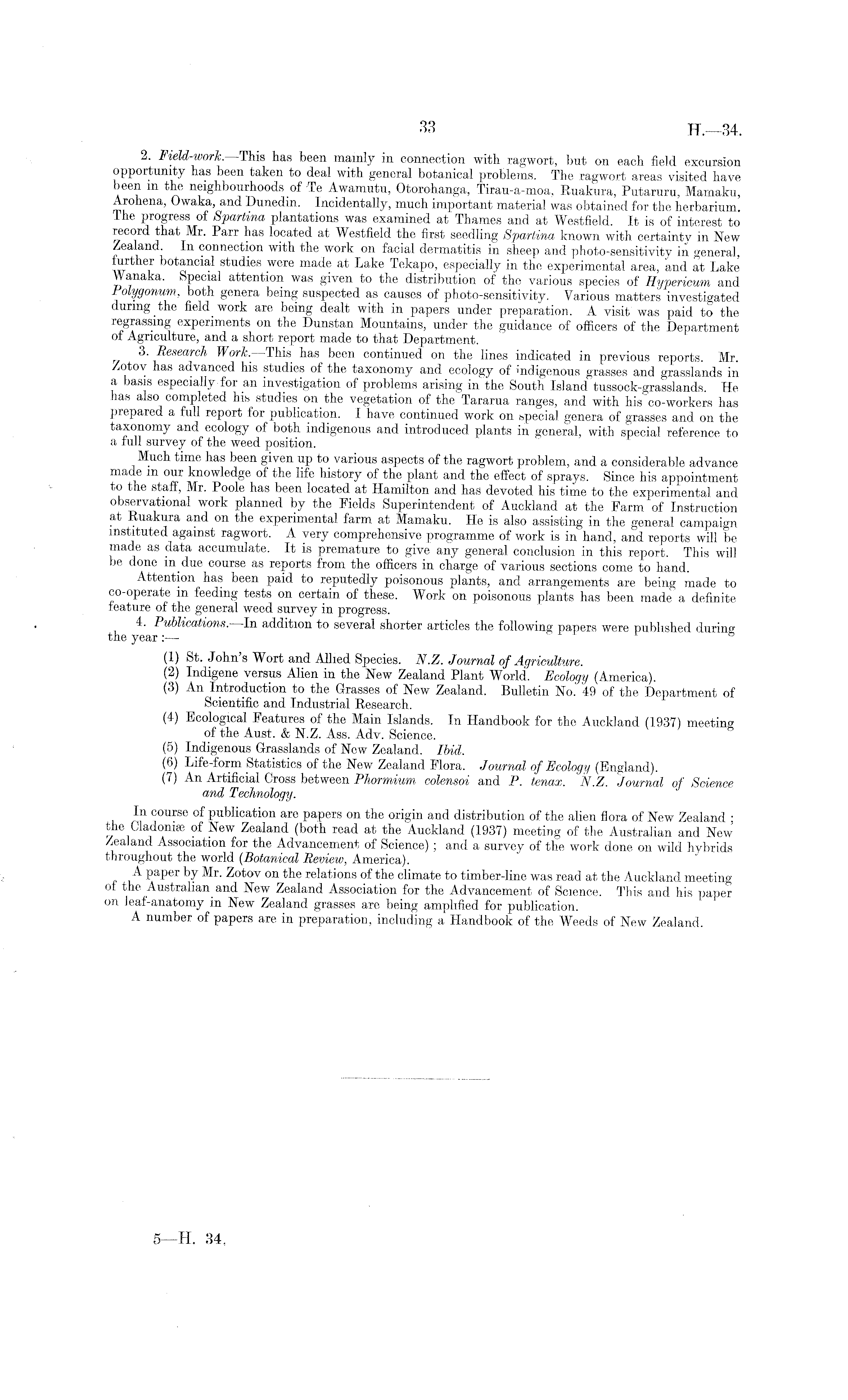 2. Field-work—This has been mainly in connection with ragwort, but on each field excursion opportunity has been taken to deal with general botanical problems. The ragwort areas visited have been m the neighbourhoods of Te Awamutu, Otorohanga, Tirau-a-moa, Ruakura, Putaruru, Mamaku, Arohena, Owaka, and Dunedin. Incidentally, much important material was obtained for the herbarium. The progress of Spartina plantations was examined at Thames and at Westfield. It is of interest to record that Mr. Pair has located at Westfield the first seedling Spartina known with certaintv in New Zealand. In connection with the work on facial dermatitis in sheep and photo-sensitivity in general, further botancial studies were made at Lake Tekapo, especially in the experimental area, and at Lake Wanaka. Special attention was given to the distribution of the various species of Hypericum and Polygonum, both genera being suspected as causes of photo-sensitivity. Various matters investigated during the field work are being dealt with in papers under preparation. A visit was paid to the regrassing experiments 011 the Dunstan Mountains, under the guidance of officers of the Department of Agriculture, and a short report made to that Department. 3. Research Work. This has been continued on the lines indicated in previous reports. Mr. Zotov has advanced his studies of the taxonomy and ecology of indigenous grasses and grasslands in a basis especially for an investigation of problems arising in the South Island tussock-grasslands. He has also completed his studies on the vegetation of the Tararua ranges, and with his co-workers has prepared a full report for publication. I have continued work on special genera of grasses and on the taxonomy and ecology of both indigenous and introduced plants in general, with special reference to a full survey of the weed position. Much time has been given up to various aspects of the ragwort problem, and a considerable advance made m our knowledge of the life history of the plant and the effect of sprays. Since his appointment to the staff, Mr. Poole has been located at Hamilton and has devoted his time to the experimental and observational work planned by the Fields Superintendent of Auckland at the Farm of Instruction at Euakura and on the experimental farm at Mamaku. He is also assisting in the general campaign instituted against ragwort. A very comprehensive programme of work is in hand, and reports will be made as data accumulate. It is premature to give any general conclusion in this report. This will be done in due course as reports from the officers in charge of various sections come to hand. Attention has been paid to reputedly poisonous plants, and arrangements are being made to co-operate in feeding tests on certain of these. Work on poisonous plants has been made a definite feature of the general weed survey in progress. 4. Publications. In addition to several shorter articles the following papers were published during (1) St. Johns Wort and Allied Species. N.Z. Journal of Agriculture. (2) Indigene versus Alien in the New Zealand Plant World. Ecology (America). (3) An Introduction to the Grasses of New Zealand. Bulletin No. 49 of the Department of Scientific and Industrial Research. (4) Ecological Features of the Main Islands. In Handbook for the Auckland (1937) meeting of the Aust. & N.Z. Ass. Adv. Science. (5) Indigenous Grasslands of New Zealand. Ibid. (6) Life-form Statistics of the New Zealand Flora. Journal of Ecology (England). (7) An Artificial Cross between Phormium colensoi and P. tenax. N.Z. \Journal of Science and Technology. In course of publication are papers on the origin and distribution of the alien flora of New Zealand ; the Cladoniae of New Zealand (both read at the Auckland (1937) meeting of the Australian and New' Zealand Association for the Advancement of Science) ; and a survey of the work done on wild hybrids throughout the world (Botanical Review, America). A paper by Mr. Zotov on the relations of the climate to timber-line was read at the Auckland meeting of the Australian and New Zealand Association for the Advancement of Science. This and his paper on leaf-anatomy in New Zealand grasses are being amplified for publication. A number of papers are in preparation, including a Handbook of the Weeds of New Zealand.