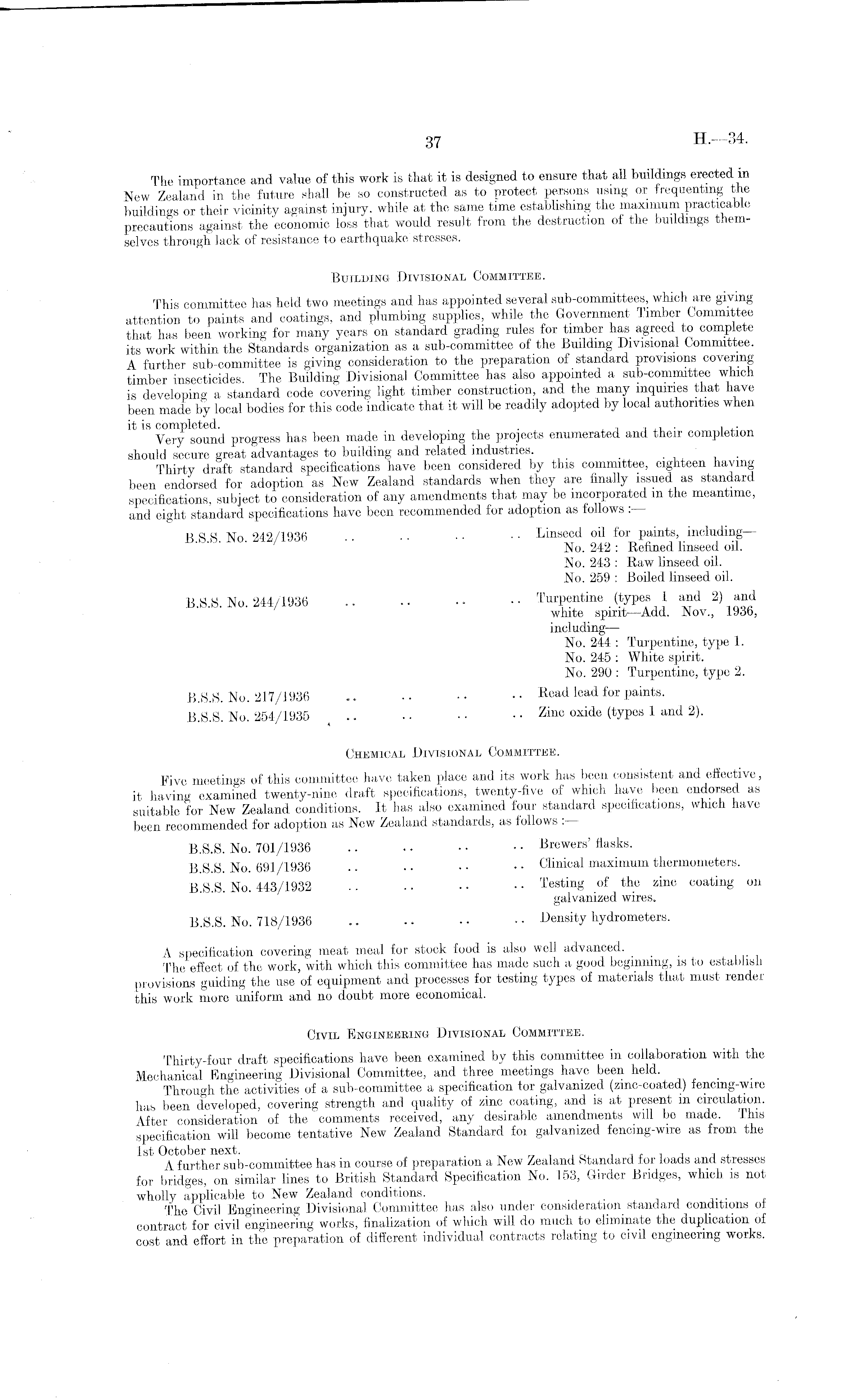 The importance and value of this work is that it is designed to ensure that all buildings erected in New Zealand in the future shall be so constructed as to protect persons using or frequenting the buildings or their vicinity against injury, while at the same time establishing the maximum practicable precautions against the economic loss that would result from the destruction of the buildings themselves through lack of resistance to earthquake stresses. Building Divisional Committee. This committee has held two meetings and has appointed several sub-committees, which are giving attention to paints and coatings, and plumbing supplies, while the Government Timber Committee that has been working for many years on standard grading rules for timber has agreed to complete its work within the Standards organization as a sub-committee of the Building Divisional Committee. A further sub-committee is giving consideration to the preparation of standard provisions covering timber insecticides. The Building Divisional Committee has also appointed a sub-committee which is developing a standard code covering light timber construction, and the many inquiries that have been made by local bodies for this code indicate that it will be readily adopted by local authorities when it is progregg hag been made in developing the projects enumerated and their completion should secure great advantages to building and related industries. Thirty draft standard specifications have been considered by this committee, eighteen haying been endorsed for adoption as Now Zealand standards when they are finally issued as standard specifications, subject to consideration of any amendments that may be incorporated in the meantime, and eight standard specifications have been recommended for adoption as follows BS S No 242/1936 .. . ■ • • • • Linseed oil for paints, including — ' ' No. 242 : Refined linseed oil. No. 243 : Raw linseed oil. No. 259 : Boiled linseed oil. BSS No 244/1936 Turpentine (types 1 and 2) and ' white spirit—Add. Nov., 1936, including — No. 244 : Turpentine, type 1. No. 245 : White spirit. No. 290 : Turpentine, type 2. B.S.S. No. 217/1936 .. • • • • • • Read lead for P aints - B.S.S. No. 254/1935 < . • • • • • • zinc oxide (^P OB 1 and 2 )- Chemical Divisional Committee. Five meetings of this committee have taken place and its work has been consistent and effective, it having examined twenty-nine draft specifications, twenty-five of which have been endorsed as suitable for New Zealand conditions. It has also examined four standard specifications, which have been recommended for adoption as New Zealand standards, as follows . B.S.S. No. 701/1936 .. •• •• •• Brewers'flasks. BSS No 691/1936 .. •• •• •• Clinical maximum thermometers. BSS No 443/1932 .. •• •• •• Testing of the zinc coating on galvanized wires. B.S.S. No. 718/1936 .. . • • • • • Density hydrometers. A specification covering meat meal for stock food is also well advanced. The effect of the work, with which this committee has made such a good beginning, is to establish provisions guiding the use of equipment and processes for testing types of materials that must render this work more uniform and no doubt more economical. Civil Engineering Divisional Committee. Thirty-four draft specifications have been examined by this committee in collaboration with the Mechanical Engineering Divisional Committee, and three meetings have been held. Through the activities of a sub-committee a specification tor galvanized (zinc-coated) fencing-wire has been developed, covering strength and quality of zinc coating, and is at present in circulation. After consideration of the comments received, any desirable amendments will be made. This specification will become tentative New Zealand Standard foi galvanized fencing-wire as from the \ further sub-committee has m course of preparation a New Zealand Standard for loads and stresses for bridges, on similar lines to British Standard Specification No. 153, Girder Bridges, which is not wholly applicable to New Zealand conditions. The Civil Engineering Divisional Committee has also under consideration standard conditions of contract for civil engineering works, finalization of which will do much to eliminate the duplication of cost and effort in the preparation of different individual contracts relating to civil engineering works.