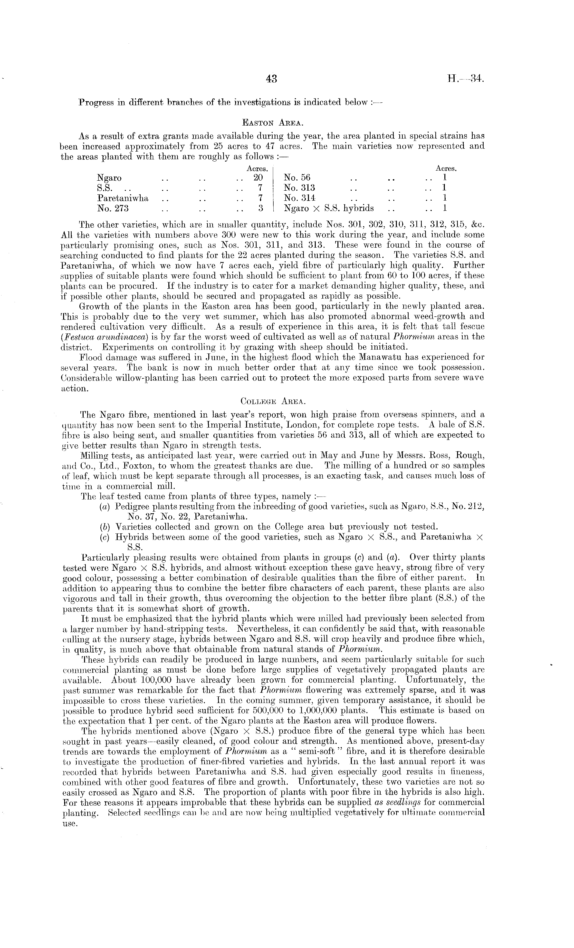 Progress in different branches of the investigations is indicated below : — EASTON AEEA. As a result of extra grants made available during the year, the area planted in special strains has been increased approximately from 25 acres to 47 acres. The main varieties now represented and the areas planted with them are roughly as follows : — Acres. Acres. Ngaro .. .. .. 20 No. 56 .. .. .. 1 S.S. .. .. .. .. 7 No. 313 .. .. .. 1 Paretaniwha .. .. 7 No. 314 .. .. 1 No. 273 .. .. 3 Ngaro X S.S. hybrids .. .. 1 The other varieties, which are in smaller quantity, include Nos. 301, 302, 310, 311, 312, 315, &c. All the varieties with numbers above 300 were new to this work during the year, and include some particularly promising ones, such as Nos. 301, 311, and 313. These were found in the course of searching conducted to find plants for the 22 acres planted during the season. The varieties S.S. and Paretaniwha, of which we now have 7 acres each, yield fibre of particularly high quality. Further supplies of suitable plants were found which should be sufficient to plant from 60 to 100 acres, if these plants can be procured. If the industry is to cater for a market demanding higher quality, these, and if possible other plants, should be secured and propagated as rapidly as possible. Growth of the plants in the Easton area has been good, particularly in the newly planted area. This is probably due to the very wet summer, which has also promoted abnormal weed-growth and rendered cultivation very difficult. As a result of experience in this area, it is felt that tall fescue (Festuca arundinacea) is by far the worst weed of cultivated as well as of natural Phormium areas in the district. Experiments on controlling it by grazing with sheep should be initiated. Flood damage was suffered in June, in the highest flood which the Manawatu has experienced for Several years. The bank is now in much better order that at any time since we took possession. Considerable willow-planting has been carried out to protect the more exposed parts from severe wave action. College Area. The Ngaro fibre, mentioned in last year's report, won high praise from overseas spinners, and a quantity has now been sent to the Imperial Institute, London, for complete rope tests. A bale of S.S. fibre is also being sent, and smaller quantities from varieties 56 and 313, all of whieh are expected to give better results than Ngaro in strength tests. Milling tests, as anticipated last year, were carried out in May and June by Messrs. Ross, Rough, and Co., Ltd., Foxton, to whom the greatest thanks are due. The milling of a hundred or so samples of leaf, which must be kept separate through all processes, is an exacting task, and causes much loss of time in a commercial mill. The leaf tested came from plants of three types, namely : — (a) Pedigree plants resulting from the inbreeding of good varieties, such as Ngaro, S.S., No. 212, No. 37, No. 22, Paretaniwha. (b) Varieties collected and grown on the College area but previously not tested. (c) Hybrids between some of the good varieties, such as Ngaro X S.S., and Paretaniwha X S.S. Particularly pleasing results were obtained from plants in groups (c) and (a). Over thirty plants tested were Ngaro X S.S. hybrids, and almost without exception these gave heavy, strong fibre of very good colour, possessing a better combination of desirable qualities than the fibre of either parent. In addition to appearing thus to combine the better fibre characters of each parent, these plants are also vigorous and tall in their growth, thus overcoming the objection to the better fibre plant (S.S.) of the parents that it is somewhat short of growth. It must be emphasized that the hybrid plants which were milled had previously been selected from a larger number by hand-stripping tests. Nevertheless, it can confidently be said that, with reasonable culling at the nursery stage, hybrids between Ngaro and S.S. will crop heavily and produce fibre which, in quality, is much above that obtainable from natural stands of Phormium. These hybrids can readily be produced in large numbers, and seem particularly suitable for such commercial planting as must be done before large supplies of vegetatively propagated plants are available. About 100,000 have already been grown for commercial planting. Unfortunately, the past summer was remarkable for the fact that Phormium flowering was extremely sparse, and it was impossible to cross these varieties. In the coming summer, given temporary assistance, it should be possible to produce hybrid seed sufficient for 500,000 to 1,000,000 plants. This estimate is based on the expectation that 1 per cent, of the Ngaro plants at the Easton area will produce flowers. The hybrids mentioned above (Ngaro X S.S.) produce fibre of the general type which has been sought in past years —easily cleaned, of good colour and strength. As mentioned above, present-day trends are towards the employment of Phormium as a " semi-soft " fibre, and it is therefore desirable to investigate the production of finer-fibred varieties and hybrids. In the last annual report it was recorded that hybrids between Paretaniwha and S.S. had given especially good results in fineness, combined with other good features of fibre and growth. Unfortunately, these two varieties are not so easily crossed as Ngaro and S.S. The proportion of plants with poor fibre in the hybrids is also high. For these reasons it appears improbable that these hybrids can be supplied as seedlings for commercial planting. Selected seedlings can be and are now being multiplied vegetatively for ultimate commercial use.