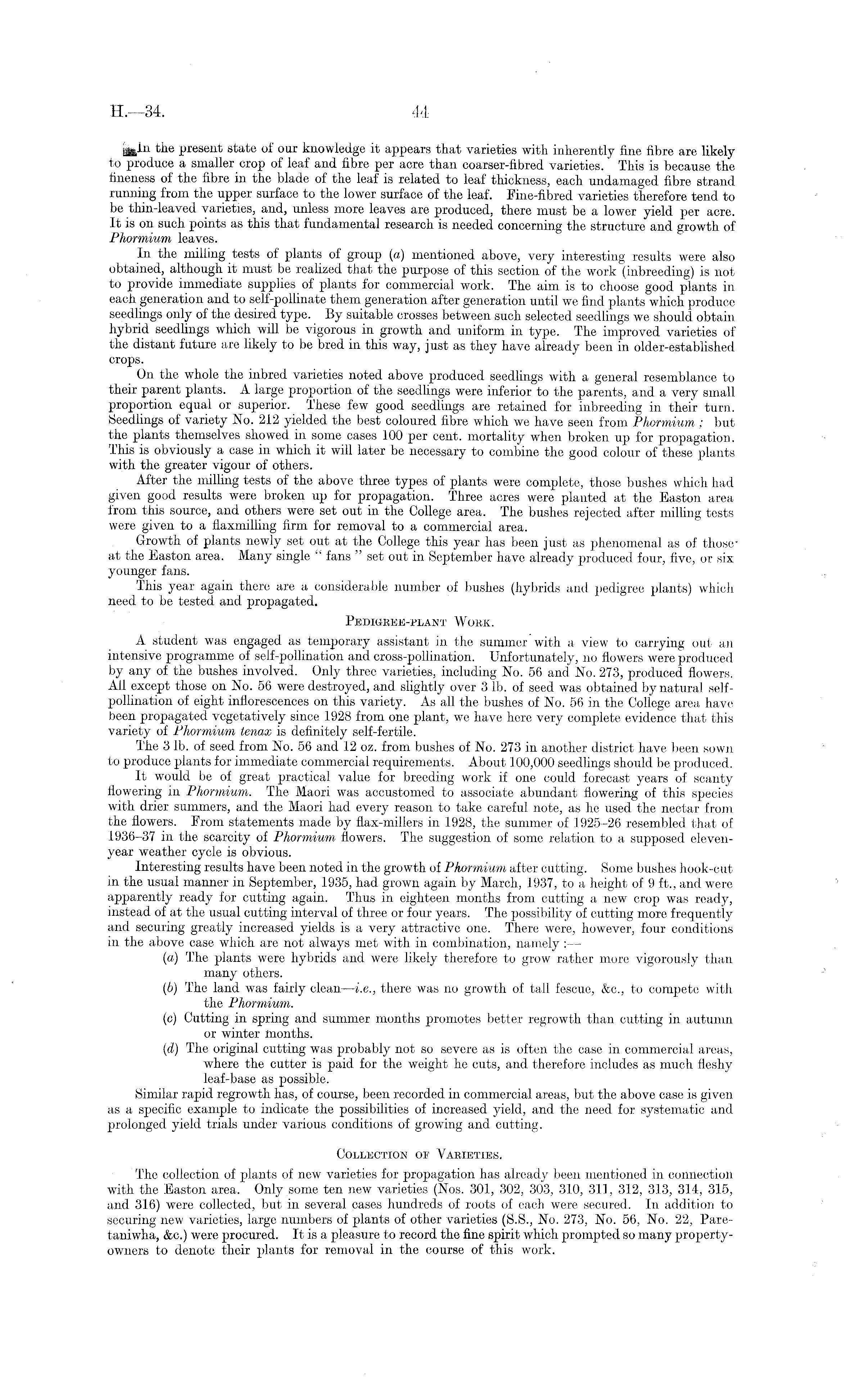 Bfciii present state of our knowledge it appears that varieties with inherently fine fibre are likely to produce a smaller crop of leaf and fibre per acre than coarser-fibred varieties. This is because the fineness of the fibre in the blade of the leaf is related to leaf thickness, each undamaged fibre strand running from the upper surface to the lower surface of the leaf. Fine-fibred varieties therefore tend to be thin-leaved varieties, and, unless more leaves are produced, there must be a lower yield per acre. It is on such points as this that fundamental research is needed concerning the structure and growth of Phormium leaves. In the milling tests of plants of group (a) mentioned above, very interesting results were also obtained, although it must be realized that the purpose of this section of the work (inbreeding) is not to provide immediate supplies of plants for commercial work. The aim is to choose good plants in each generation and to self-pollinate them generation after generation until we find plants which produce seedlings only of the desired type. By suitable crosses between such selected seedlings we should obtain hybrid seedlings which will be vigorous in growth and uniform in type. The improved varieties of the distant future are likely to be bred in this way, just as they have already been in older-established crops. On the whole the inbred varieties noted above produced seedlings with a general resemblance to their parent plants. A large proportion of the seedlings were inferior to the parents, and a very small proportion equal or superior. These few good seedlings are retained for inbreeding in their turn. Seedlings of variety No. 212 yielded the best coloured fibre which we have seen from Phormium ; but the plants themselves showed in some cases 100 per cent, mortality when broken up for propagation. This is obviously a case in which it will later be necessary to combine the good colour of these plants with the greater vigour of others. After the milling tests of the above three types of plants were complete, those bushes which had given good results were broken up for propagation. Three acres were planted at the Easton area from this source, and others were set out in the College area. The bushes rejected after milling tests were given to a flaxmilling firm for removal to a commercial area. Growth of plants newly set out at the College this year has been just as phenomenal as of thoseat the Easton area. Many single " fans " set out in September have already produced four, five, or six younger fans. This year again there are a considerable number of bushes (hybrids and pedigree plants) which need to be tested and propagated. Pedigree-plant Work. A student was engaged as temporary assistant in the summer with a view to carrying out an intensive programme of self-pollination and cross-pollination. Unfortunately, no flowers were produced by any of the bushes involved. Only three varieties, including No. 56 and No. 273, produced flowers. Ail except those on No. 56 were destroyed, and slightly over 3 lb. of seed was obtained by natural selfpollination of eight inflorescences on this variety. As all the bushes of No. 56 in the College area have been propagated vegetatively since 1928 from one plant, we have here very complete evidence that this variety of Phormium tenax is definitely self-fertile. The 3 lb. of seed from No. 56 and 12 oz. from bushes of No. 273 in another district have been sown to produce plants for immediate commercial requirements. About 100,000 seedlings should be produced. It would be of great practical value for breeding work if one could forecast years of scanty flowering in Phormium. The Maori was accustomed to associate abundant flowering of this species with drier summers, and the Maori had every reason to take careful note, as he used the nectar from, the flowers. From statements made by flax-millers in 1928, the summer of 1925-26 resembled that of 1936-37 in the scarcity of Phormium flowers. The suggestion of some relation to a supposed elevenyear weather cycle is obvious. Interesting results have been noted in the growth of Phormium after cutting. Some bushes hook-cut in the usual manner in September, 1935, had grown again by March, 1937, to a height of 9 ft., and were apparently ready for cutting again. Thus in eighteen months from cutting a new crop was ready, instead of at the usual cutting interval of three or four years. The possibility of cutting more frequently and securing greatly increased yields is a very attractive one. There were, however, four conditions in the above case which are not always met with in combination, namely : — (a) The plants were hybrids and were likely therefore to grow rather more vigorously than many others. (b) The land was fairly clean —i.e., there was no growth of tall fescue, &c., to compete with the Phormium. (c) Cutting in spring and summer months promotes better regrowth than cutting in autumn or winter months. (■d) The original cutting was probably not so severe as is often the case in commercial areas, where the cutter is paid for the weight he cuts, and therefore includes as much fleshy leaf-base as possible. Similar rapid regrowth has, of course, been recorded in commercial areas, but the above case is given as a specific example to indicate the possibilities of increased yield, and the need for systematic and prolonged yield trials under various conditions of growing and cutting. Collection oe Varieties. The collection of plants of new varieties for propagation has already been mentioned in connection with the Easton area. Only some ten new varieties (Nos. 301, 302, 303, 310, 311, 312, 313, 314, 315, and 316) were collected, but in several cases hundreds of roots of each were secured. In addition to securing new varieties, large numbers of plants of other varieties (S.S., No. 273, No. 56, No. 22, Paretaniwha, &c.) were procured. It is a pleasure to record the fine spirit which prompted so many