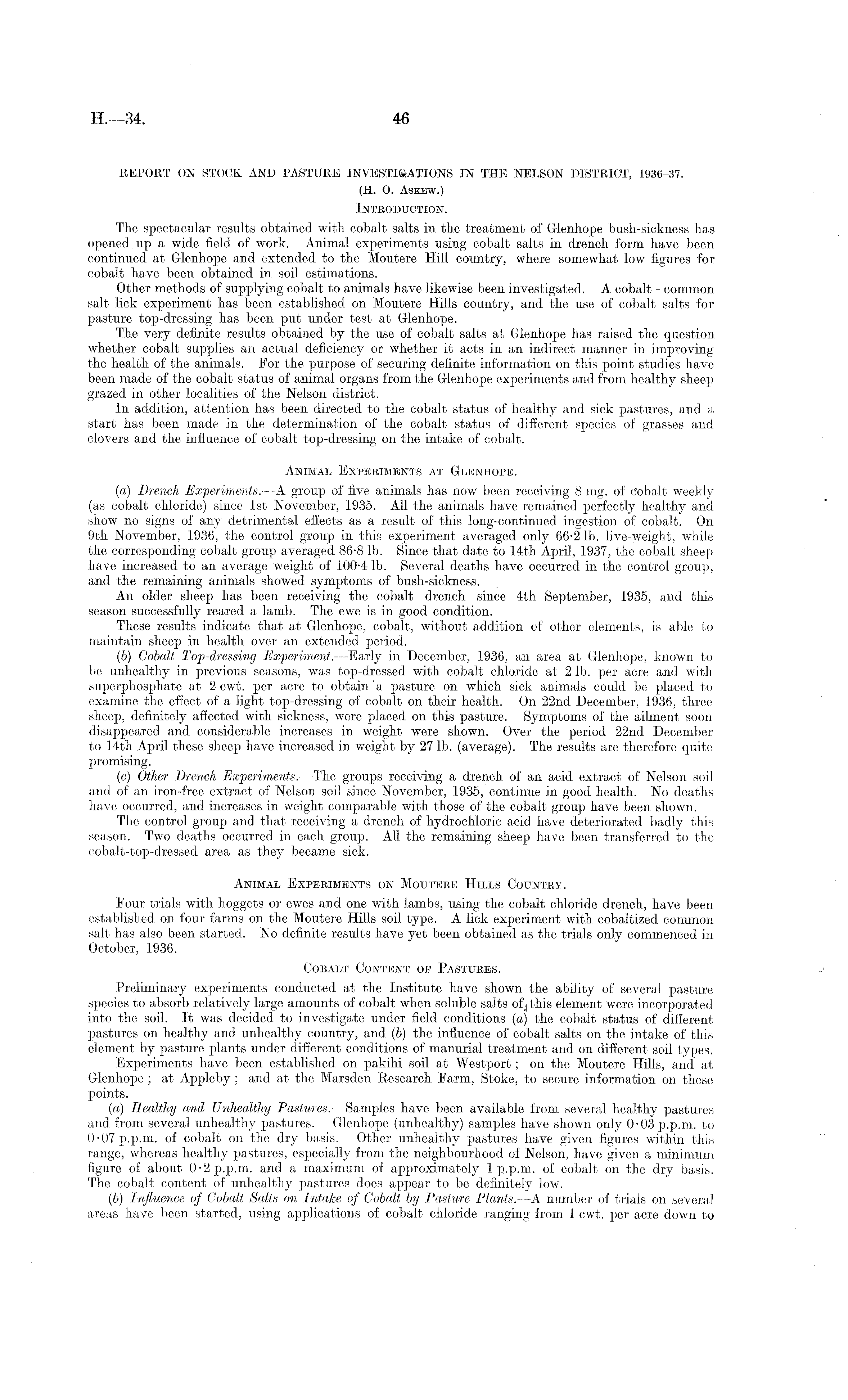 REPORT ON STOCK AND PASTURE INVESTIGATIONS IN THE NELSON DISTRICT, 1936-37. (H. 0. Askew.) Introduction. The spectacular results obtained with, cobalt salts in the treatment of G-lenliope bush-sickness has opened up a wide field of work. Animal experiments using cobalt salts in drench form have been continued at Glenhope and extended to the Moutere Hill country, where somewhat low figures for cobalt have been obtained in soil estimations. Other methods of supplying cobalt to animals have likewise been investigated. A cobalt - common salt lick experiment has been established on Moutere Hills country, and the use of cobalt salts for pasture top-dressing has been put under test at Glenhope. The very definite results obtained by the use of cobalt salts at Glenhope has raised the question whether cobalt supplies an actual deficiency or whether it acts in an indirect manner in improving the health of the animals. For the purpose of securing definite information on this point studies have been made of the cobalt status of animal organs from, the Glenhope experiments and from healthy sheep grazed in other localities of the Nelson district. In addition, attention has been directed to the cobalt status of healthy and sick pastures, and a start has been made in the determination of the cobalt status of different species of grasses and clovers and the influence of cobalt top-dressing on the intake of cobalt. Animal Experiments at Glenhope. (a) Drench Experiments. —A group of five animals has now been receiving 8 mg. of c'obalt weekly (as cobalt chloride) since Ist November, 1935. All the animals have remained perfectly healthy and show no signs of any detrimental effects as a result of this long-continued ingestion of cobalt. On 9th November, 1936, the control group in this experiment averaged only 66-2 lb. live-weight, while the corresponding cobalt group averaged 86-8 lb. Since that date to 14th April, 1937, the cobalt sheep have increased to an average weight of 100-4 lb. Several deaths have occurred in the control group, and the remaining animals showed symptoms of bush-sickness. . An older sheep has been receiving the cobalt drench since 4th September, 1935, and this season successfully reared a lamb. The ewe is in good condition. These results indicate that at Glenhope, cobalt, without addition of other elements, is able to maintain sheep in health over an extended period. (b) Cobalt Top-dressing Experiment. —Early in December, 1936, an area at Glenhope, known to be unhealthy in previous seasons, was top-dressed with cobalt chloride at 2 lb. per acre and with superphosphate at 2 cwt. per acre to obtain'a pasture on which sick animals could be placed to examine the effect of a light top-dressing of cobalt on their health. On 22nd December, 1936, three sheep, definitely affected with sickness, were placed on this pasture. Symptoms of the ailment soon disappeared and considerable increases in weight were shown. Over the period 22nd December to 14th April these sheep have increased in weight by 27 lb. (average). The results are therefore quite promising. (c) Other Drench Experiments. —The groups receiving a drench of an acid extract of Nelson soil and of an iron-free extract of Nelson soil since November, 1935, continue in good health. No deaths have occurred, and increases in weight comparable with those of the cobalt group have been shown. The control group and that receiving a drench of hydrochloric acid have deteriorated badly this season. Two deaths occurred in each group. All the remaining sheep have been transferred to the cobalt-top-dressed area as they became sick. Animal Experiments on Moutere Hills Country. Four trials with hoggets or ewes and one with lambs, using the cobalt chloride drench, have been established on four farms on the Moutere Hills soil type. A lick experiment with cobaltized common salt has also been started. No definite results have yet been obtained as the trials only commenced in October, 1936. Cobalt Content op Pastures. Preliminary experiments conducted at the Institute have shown the ability of .several pasture species to absorb relatively large amounts of cobalt when soluble salts this element were incorporated into the soil. It was decided to investigate under field conditions (a) the cobalt status of different pastures on healthy and unhealthy country, and (b) the influence of cobalt salts on the intake of this element by pasture plants under different conditions of manurial treatment and on different soil types. Experiments have been established on pakihi soil at Westport; on the Moutere Hills, and at Glenhope ; at Appleby ; and at the Marsden Research Farm, Stoke, to secure information on these points. (a) Healthy and Unhealthy Pastures. —Samples have been available from several healthy pastures and from several unhealthy pastures. Glenhope (unhealthy) samples have shown only 0-03 p.p.m. to 0-07 p.p.m. of cobalt on the dry basis. Other unhealthy pastures have given figures within this range, whereas healthy pastures, especially from the neighbourhood of Nelson, have given a minimum figure of about 0-2 p.p.m. and a maximum of approximately 1 p.p.m. of cobalt on the dry basis. The cobalt content of unhealthy pastures does appear to be definitely low. (b) Infl'uence of Cobalt Salts on Intake of Cobalt by Pasture Plants.—A number of trials on several areas have been started, using applications of cobalt chloride ranging from 1 cwt. per acre down to