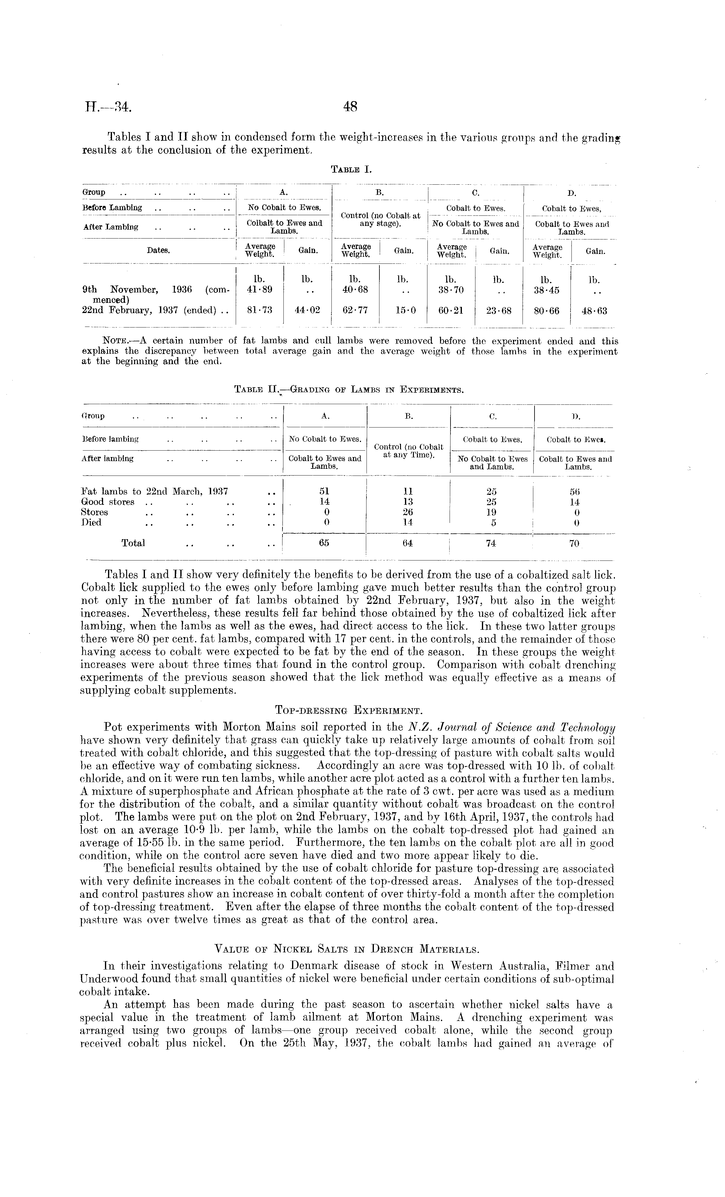 Tables I and II show very definitely tie benefits to be derived from the use of a cobaltized salt lick. Cobalt lick supplied to the ewes only before lambing gave much better results than the control group not only in the number of fat lambs obtained by 22nd February, 1937, but also in the weight increases. Nevertheless, these results fell far behind those obtained by the use of cobaltized lick after lambing, when the lambs as well as the ewes, had direct access to the lick. In these two latter groups there were 80 per cent, fat lambs, compared with 17 per cent, in the controls, and the remainder of those having access to cobalt were expected to be fat by the end of the season. In these groups the weight increases were about three times that found in the control group. Comparison with cobalt drenching experiments of the previous season showed that the lick method was equally effective as a means of supplying cobalt supplements. Top-dressing Experiment. Pot experiments with Morton Mains soil reported in the N.Z. Journal of Science and Technology have shown very definitely that grass can quickly take up relatively large amounts of cobalt from soil treated with cobalt chloride, and this suggested that the top-dressing of pasture with cobalt salts would be an effective way of combating sickness. Accordingly an acre was top-dressed with 10 lb. of cobalt chloride, and on it were run ten lambs, while another acre plot acted as a control with a further ten lambs. A mixture of superphosphate and African phosphate at the rate of 3 cwt. per acre was used as a medium for the distribution of the cobalt, and a similar quantity without cobalt was broadcast on the control plot. The lambs were put on the plot on 2nd February, 1937, and by 16th April, 1937, the controls had lost on an average 10-9 lb. per lamb, while the lambs on the cobalt top-dressed plot had gained an average of 15-55 lb. in the same period. Furthermore, the ten lambs on the cobalt plot are all in good condition, while on the control acre seven have died and two more appear likely to die. The beneficial results obtained by the use of cobalt chloride for pasture top-dressing are associated with very definite increases in the cobalt content of the top-dressed areas. Analyses of the top-dressed and control pastures show an increase in cobalt content of over thirty-fold a month after the completion of top-dressing treatment. Even after the elapse of three months the cobalt content of the top-dressed pasture was over twelve times as great as that of the control area. Value op Nickel Salts in Drench Materials. In their investigations relating to Denmark disease of stock in Western Australia, Filmer and Underwood found that small quantities of nickel were beneficial under certain conditions of sub-optimal cobalt intake. An attempt has been made during the past season to ascertain whether nickel salts have a special value in the treatment of lamb ailment at Morton Mains. A drenching experiment was arranged using two groups of lambs—one group received cobalt alone, while the second group received cobalt plus nickel. On the 25th May, 1937, the cobalt lambs had gained an average of