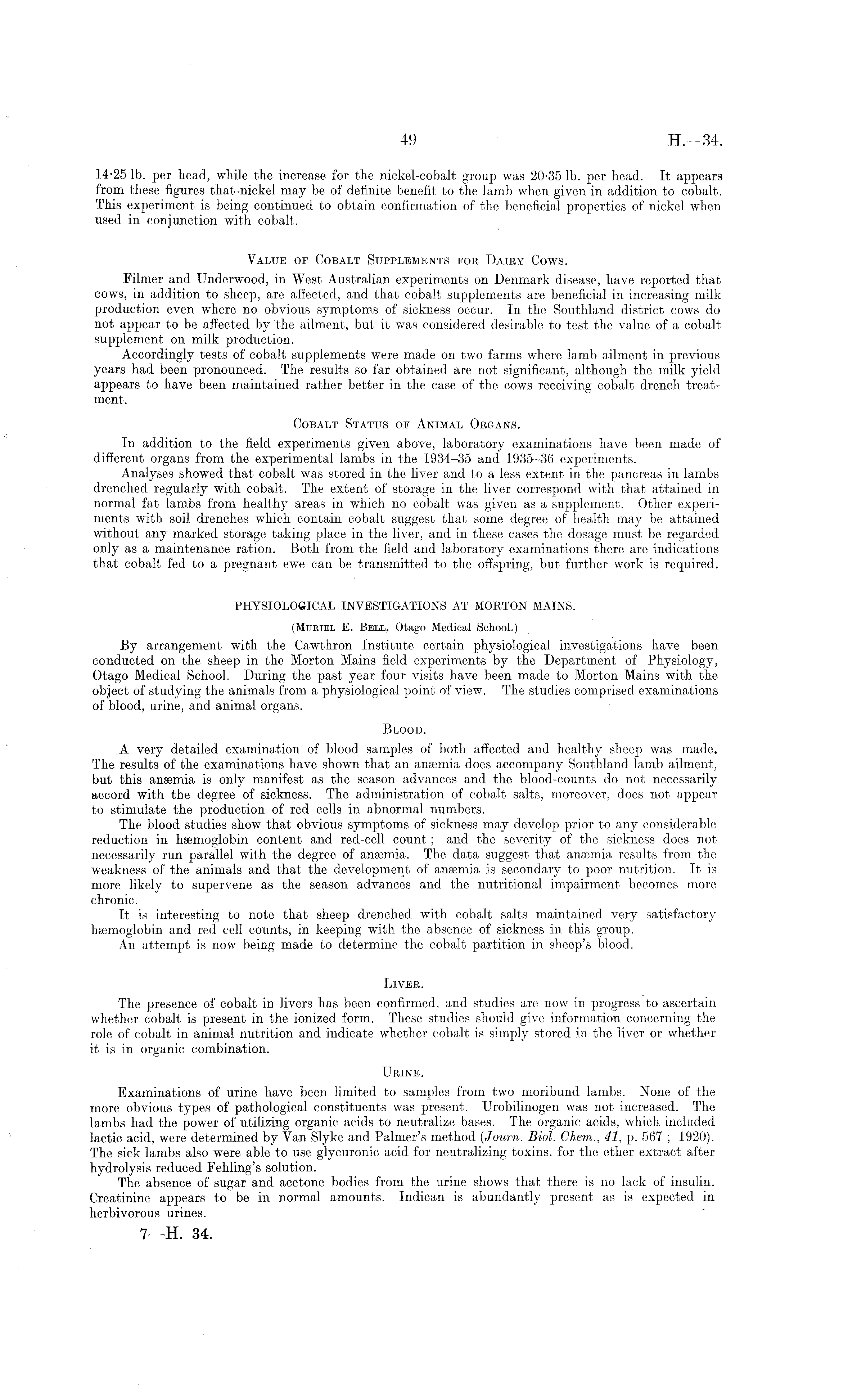14-25 lb. per head, while the increase for the nickel-cobalt group was 20-35 lb. per head. It appears from these figures that-nickel may be of definite benefit to the lamb when given in addition to cobalt. This experiment is being continued to obtain confirmation of the beneficial properties of nickel when used in conjunction with cobalt. Value of Cobalt Supplements for Dairy Cows. Filmer and Underwood, in West Australian experiments on Denmark disease, have reported that cows, in addition to sheep, are affected, and that cobalt supplements are beneficial in increasing milk production even where no obvious symptoms of sickness occur. In the Southland district cows do not appear to be affected by the ailment, but it was considered desirable to test the value of a cobalt supplement on milk production. Accordingly tests of cobalt supplements were made on two farms where lamb ailment in previous years had been pronounced. The results so far obtained are not significant, although the milk yield appears to have been maintained rather better in the case of the cows receiving cobalt drench treatment. Cobalt Status of Animal Organs. In addition to the field experiments given above, laboratory examinations have been made of different organs from the experimental lambs in the 1934-35 and 1935-36 experiments. Analyses showed that cobalt was stored in the liver and to a less extent in the pancreas in lambs drenched regularly with cobalt. The extent of storage in the liver correspond with that attained in normal fat lambs from healthy areas in which no cobalt was given as a supplement. Other experiments with soil drenches which contain cobalt suggest that some degree of health may be attained without any marked storage taking place in the liver, and in these cases the dosage must be regarded only as a maintenance ration. Both from the field and laboratory examinations there are indications that cobalt fed to a pregnant ewe can be transmitted to the offspring, but further work is required. PHYSIOLOGICAL INVESTIGATIONS AT MORTON MAINS. (Muriel E. Bell, Otago Medical School.) By arrangement with the Cawthron Institute certain physiological investigations have been conducted on the sheep in the Morton Mains field experiments by the Department of Physiology, Otago Medical School. During the past year four visits have been made to Morton Mains with the object of studying the animals from a physiological point of view. The studies comprised examinations of blood, urine, and animal organs. Blood. A very detailed examination of blood samples of both affected and healthy sheep was made. The results of the examinations have shown that an anaemia does accompany Southland lamb ailment, but this anaemia is only manifest as the season advances and the blood-counts do not necessarily accord with the degree of sickness. The administration of cobalt salts, moreover, does not appear to stimulate the production of red cells in abnormal numbers. The blood studies show that obvious symptoms of sickness may develop prior to any considerable reduction in haemoglobin content and red-cell count; and the severity of the sickness does not necessarily run parallel with the degree of anaemia. The data suggest that anaemia results from the weakness of the animals and that the development of anaemia is secondary to poor nutrition. It is more likely to supervene as the season advances and the nutritional impairment becomes more chronic. It is interesting to note that sheep drenched with cobalt salts maintained very satisfactory haemoglobin and red cell counts, in keeping with the absence of sickness in this group. An attempt is now being made to determine the cobalt partition in sheep's blood.. Liver. The presence of cobalt in livers has been confirmed, and studies are now in progress to ascertain whether cobalt is present in the ionized form. These studies should give information concerning the role of cobalt in animal nutrition and indicate whether cobalt is simply stored in the liver or whether it is in organic combination. Urine. Examinations of urine have been limited to samples from two moribund lambs. None of the more obvious types of pathological constituents was present. Urobilinogen was not increased. The lambs had the power of utilizing organic acids to neutralize bases. The organic acids, which included lactic acid, were determined by Van Slyke and Palmer's method (Journ. Biol. Chem., 41, p. 567 ; 1920). The sick lambs also were able to use glycuronic acid for neutralizing toxins, for the ether extract after hydrolysis reduced Fehling's solution. The absence of sugar and acetone bodies from the urine shows that there is no lack of insulin. Creatinine appears to be in normal amounts. Indican is abundantly present as is expected in herbivorous urines.