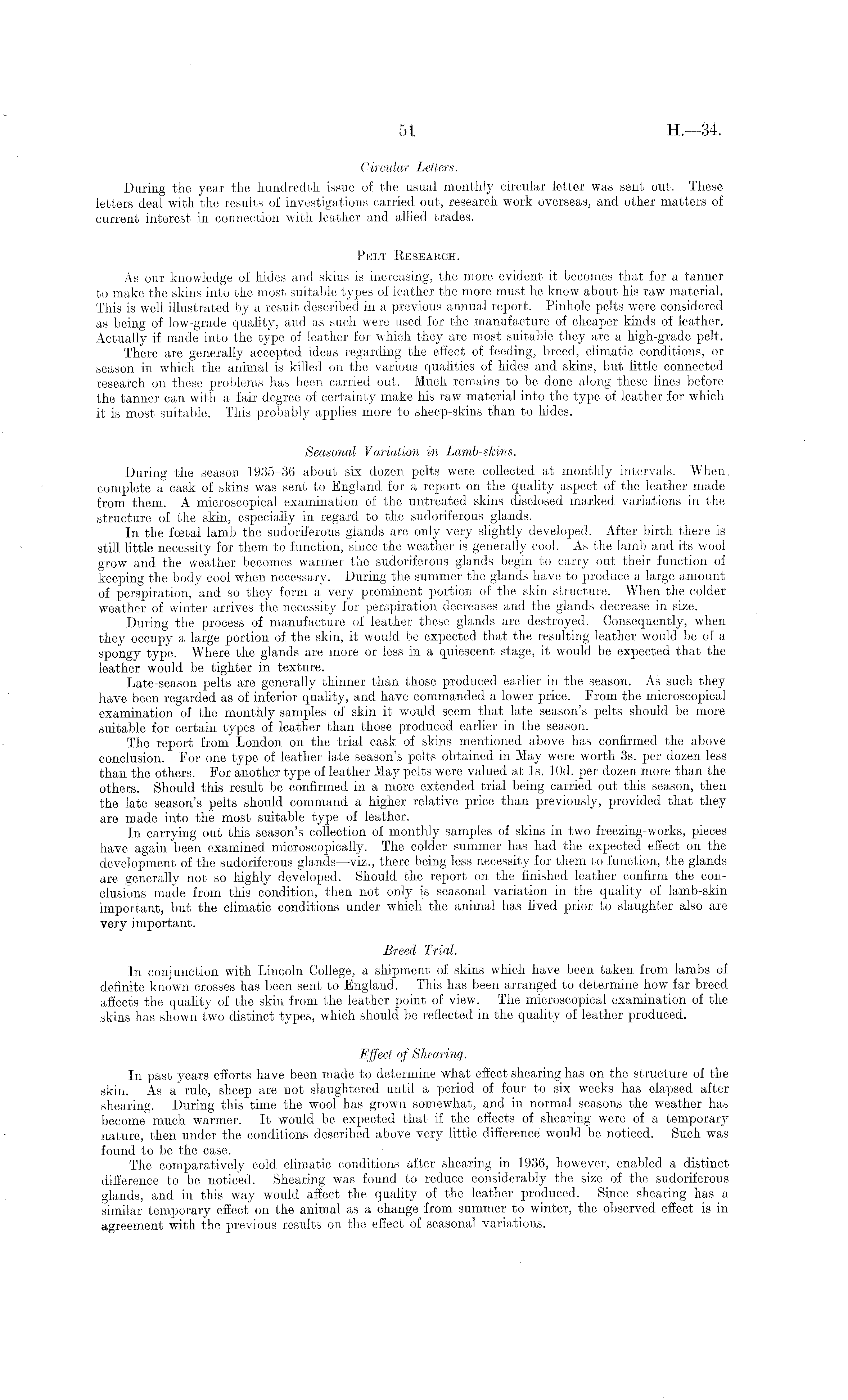 Circular Letters. During the year the hundredth issue of the usual monthly circular letter was sent out. These letters deal with the results of investigations carried out, research work overseas, and other matters of current interest in connection with leather and allied trades. Pelt Research. As our knowledge of hides and skins is increasing, the more evident it becomes that for a tanner to make the skins into the most suitable types of leather the more must he know about his raw material. This is well illustrated by a result described in a previous annual report. Pinhole pelts were considered as being of low-grade quality, and as such were used for the manufacture of cheaper kinds of leather. Actually if made into the type of leather for which they are most suitable they are a high-grade pelt. There are generally accepted ideas regarding the effect of feeding, breed, climatic conditions, or season in which the animal is killed on the various qualities of hides and skins, but little connected research on these problems has been carried out. Much remains to be done along these lines before the tanner can with a fair degree of certainty make his raw material into the type of leather for which it is most suitable. This probably applies more to sheep-skins than to hides. Seasonal Variation in Lamb-skins. During the season 1935-36 about six dozen pelts were collected at monthly intervals. When, complete a cask of skins was sent to England for a report on the quality aspect of the leather made from them. A microscopical examination of the untreated skins disclosed marked variations in the structure of the skin, especially in regard to the sudoriferous glands. In the foetal lamb the sudoriferous glands are only very slightly developed. After birth there is still little necessity for them to function, since the weather is generally cool. As the lamb and its wool grow and the weather becomes warmer the sudoriferous glands begin to carry out their function of keeping the body cool when necessary. During the summer the glands have to produce a large amount of perspiration, and so they form a very prominent portion of the skin structure. When the colder weather of winter arrives the necessity for perspiration decreases and the glands decrease in size. During the process of manufacture of leather these glands are destroyed. Consequently, when they occupy a large portion of the skin, it would be expected that the resulting leather would be of a spongy type. Where the glands are more or less in a quiescent stage, it would be expected that the leather would be tighter in texture. Late-season pelts are generally thinner than those produced earlier in the season. As such they have been regarded as of inferior quality, and have commanded a lower price. From the microscopical examination of the monthly samples of skin it would seem that late season's pelts should be more suitable for certain types of leather than those produced earlier in the season. The report from London on the trial cask of skins mentioned above has confirmed the above conclusion. For one type of leather late season's pelts obtained in May were worth 3s. per dozen less than the others. For another type of leather May pelts were valued at Is. lOd. per dozen more than the others. Should this result be confirmed in a more extended trial being carried out this season, then the late season's pelts should command a higher relative price than previously, provided that they are made into the most suitable type of leather. In carrying out this season's collection of monthly samples of skins in two freezing-works, pieces have again been examined microscopically. The colder summer has had the expected effect on the development of the sudoriferous glands—viz., there being less necessity for them to function, the glands are generally not so highly developed. Should the report on the finished leather confirm the conclusions made from this condition, then not only js seasonal variation in the quality of lamb-skin important, but the climatic conditions under which the animal has lived prior to slaughter also are very important. Breed Trial. In conjunction with Lincoln College, a shipment of skins which have been taken from lambs of definite known crosses has been sent to England. This has been arranged to determine how far breed affects the quality of the skin from the leather point of view. The microscopical examination of the skins has shown two distinct types, which should be reflected in the quality of leather produced. Effect of Shearing. In past years efforts have been made to determine what effect shearing has on the structure of the skin. As a rule, sheep are not slaughtered until a period of four to six weeks has elapsed after shearing. During this time the wool has grown somewhat, and in normal seasons the weather has become much warmer. It would be expected that if the effects of shearing were of a temporary nature, then under the conditions described above very little difference would be noticed. Such was found to be the case. The comparatively cold climatic conditions after shearing in 1936, however, enabled a distinct difference to be noticed. Shearing was found to reduce considerably the size of the sudoriferous glands, and in this way would affect the quality of the leather produced. Since shearing has a similar temporary effect on the animal as a change from summer to winter, the observed effect is in agreement with the previous results on the effect of seasonal variations.