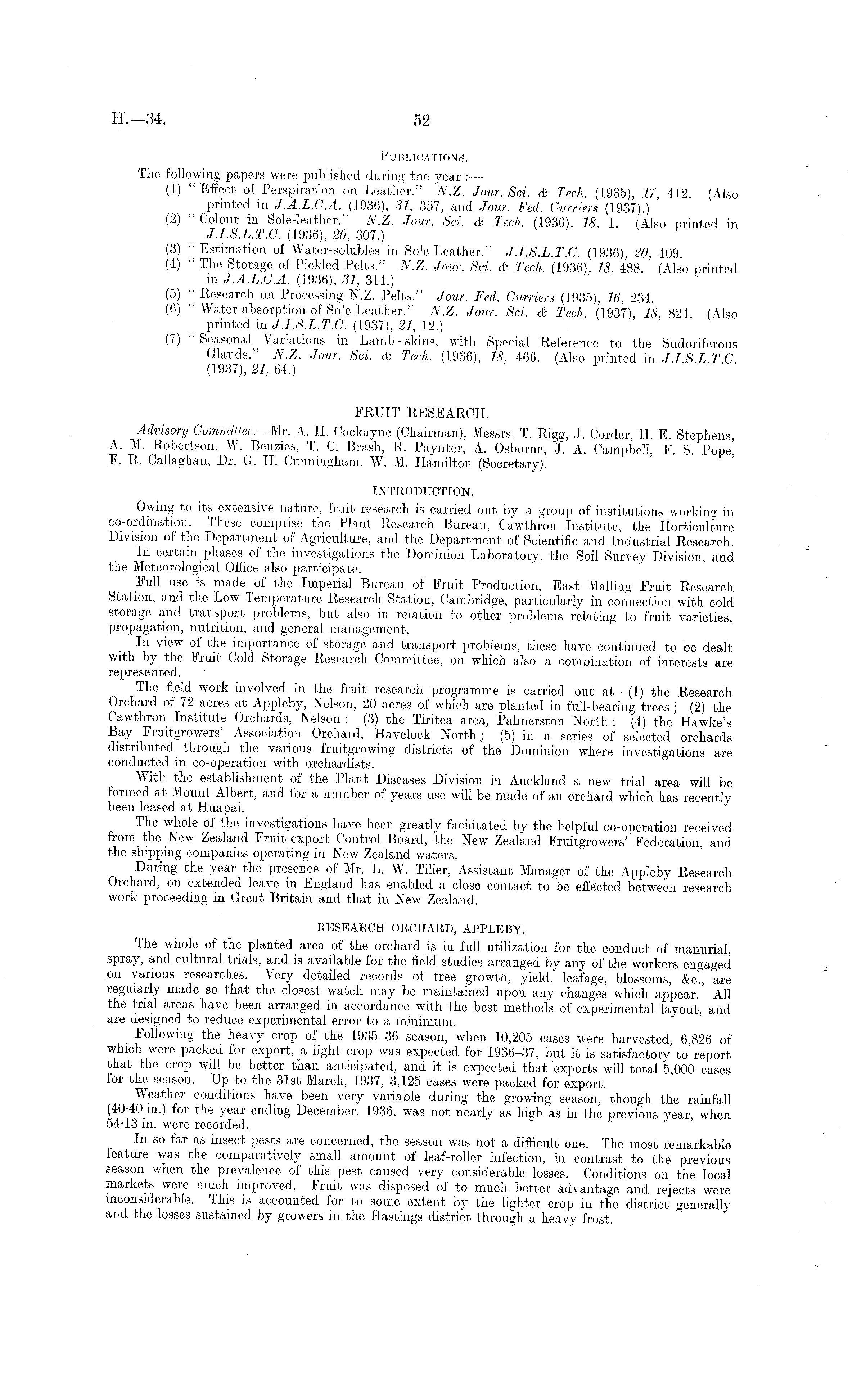 Publications. The following papers were published during the year :—• (1) " Effect of Perspiration on Leather." N.Z. Jour. Sci. & Tech. (1935), 17, 412. (Also printed in J.A.L.C.A. (1936), 31, 357, and Jour. Fed. Curriers (1937).) (2) " Colour in Sole-leather." N.Z. Jour. Sci. & Tecli. (1936), 18, 1. (Also printed in J.I.S.L.T.C. (1936), 20, 307.) (3) " Estimation of Water-solubles in Sole Leather." J.I.S.L.T.C. (1936), 20, 409. (4) " The Storage of Pickled Pelts." N.Z. Jour. Sci. & Tech. (1936), 18, 488. (Also printed in J.A.L.C.A. (1936), 31, 314.) (5) " Research on Processing N.Z. Pelts." Jour. Fed. Curriers (1935), 16, 234. (6) " Water-absorption of Sole Leather." N.Z. Jour. Sci. & Tech. (1937), 18, 824. (Also printed in J.I.S.L.T.C. (1937), 21, 12.) (/) Seasonal Variations in Lamb-skins, with Special Reference to the Sudoriferous Glands." N.Z. Jour. Sci. & Tech. (1936), 18, 466. (Also printed in J.I.S.L.T.C. (1937), 21, 64.) FRUIT RESEARCH. Advisory Committee.—Mr. A. H. Cockayne (Chairman), Messrs. T. Rigg, J. Corder, H. E. Stephens, A. M. Robertson, W. Benzies, T. C. Brash, R. Paynter, A. Osborne, J. A. Campbell, P. S. Pope', F. R. Callaghan, Dr. G. H. Cunningham, W. M. Hamilton (Secretary). INTRODUCTION. Owing to its extensive nature, fruit research is carried out by a group of institutions working in co-ordination. These comprise the Plant Research Bureau, Cawthron Institute, the Horticulture Division of the Department of Agriculture, and the Department of Scientific and Industrial Research. In certain phases of the investigations the Dominion Laboratory, the Soil Survey Division, and the Meteorological Office also participate. Full use is made of the Imperial Bureau of Fruit Production, East Mailing Fruit Research Station, and the Low Temperature Research Station, Cambridge, particularly in connection with cold storage and transport problems, but also in relation to other problems relating to fruit varieties, propagation, nutrition, and general management. In view of the importance of storage and transport problems, these have continued to be dealt with by the Fruit Cold Storage Research Committee, on which also a combination of interests are represented. The field work involved in the fruit research programme is carried out at—(l) the Research Orchard of 72 acres at Appleby, Nelson, 20 acres of which are planted in full-bearing trees ; (2) the Cawthron Institute Orchards, Nelson ; (3) the Tiritea area, Palmerston North ; (4) the Hawke's Bay Fruitgrowers' Association Orchard, Havelock North ; (5) in a series of selected orchards distributed through the various fruitgrowing districts of the Dominion where investigations are conducted in co-operation with orchardists. With the establishment of the Plant Diseases Division in Auckland a new trial area will be formed at Mount Albert, and for a number of years use will be made of an orchard which has recently been leased at Huapai. The whole of the investigations have been greatly facilitated by the helpful co-operation received from the New Zealand Fruit-export Control Board, the New Zealand Fruitgrowers' Federation, and the shipping companies operating in New Zealand waters. During the year the presence of Mr. L. W. Tiller, Assistant Manager of the Appleby Research Orchard, on extended leave in England has enabled a close contact to be effected between research work proceeding in Great Britain and that in New Zealand. RESEARCH ORCHARD, APPLEBY. The whole of the planted area of the orchard is in full utilization for the conduct of manurial, spray, and cultural trials, and is available for the field studies arranged by any of the workers engaged on various researches. Very detailed records of tree growth, yield, leafage, blossoms, &c., are regularly made so that the closest watch may be maintained upon any changes which appear. All the trial areas have been arranged in accordance with the best methods of experimental layout, and are designed to reduce experimental error to a minimum. Following the heavy crop of the 1935-36 season, when 10,205 cases were harvested, 6,826 of which were packed for export, a light crop was expected for 1936-37, but it is satisfactory to report that the crop will be better than anticipated, and it is expected that exports will total 5,000 cases for the season. Up to the 31st March, 1937, 3,125 cases were packed for export. Weather conditions have been very variable during the growing season, though the rainfall (40 40 in.) for the year ending December, 1936, was not nearly as high as in the previous year, when 54-13 in. were recorded. In so far as insect pests are concerned, the season was not a difficult one. The most remarkable feature was the comparatively small amount of leaf-roller infection, in contrast to the previous season when the prevalence of this pest caused very considerable losses. Conditions on the local markets were much improved. Fruit was disposed of to much better advantage and rejects were inconsiderable. This is accounted for to some extent by the lighter crop in the district generally and the losses sustained by growers in the Hastings district through a heavy frost.