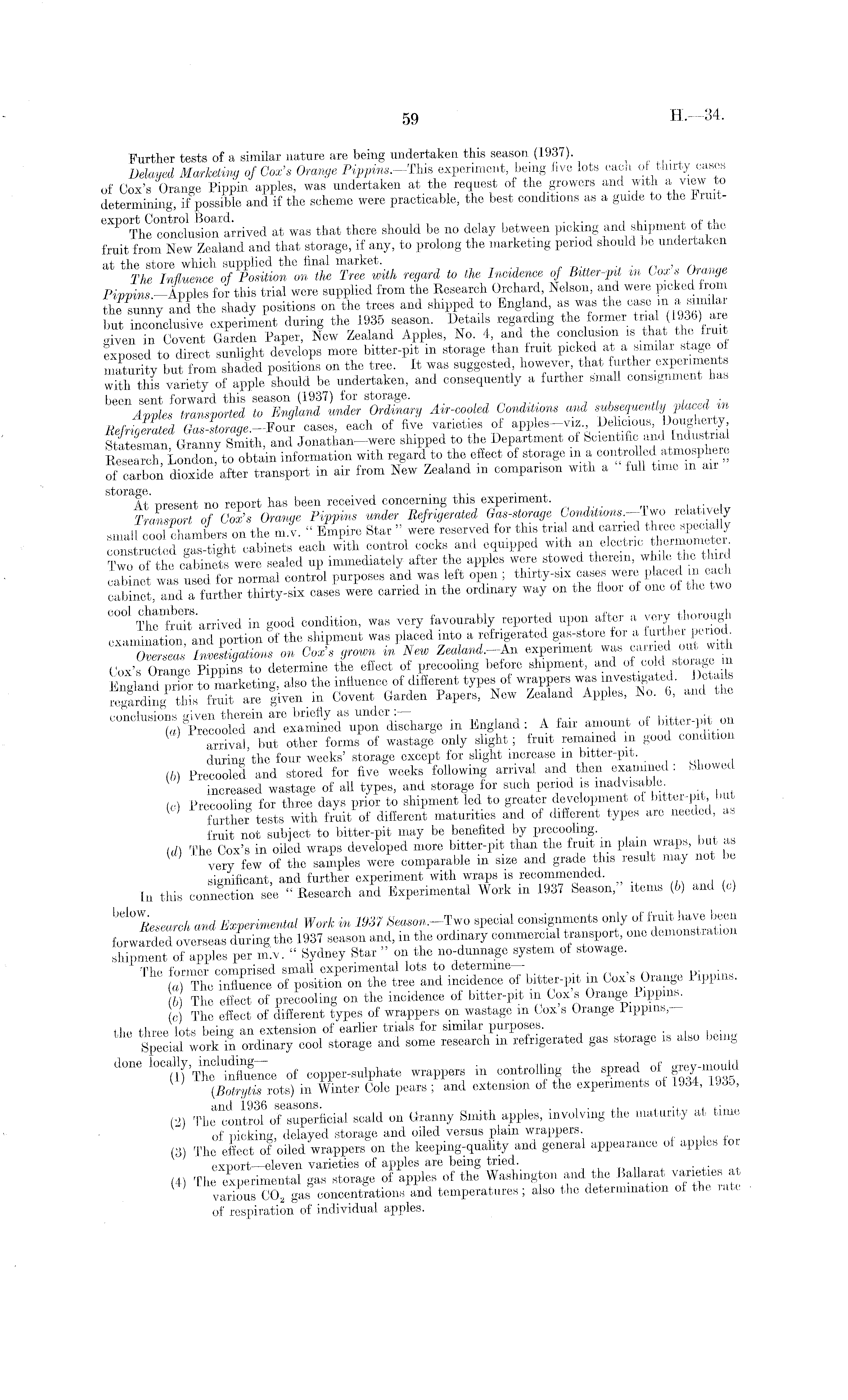 Further tests of a similar nature are being undertaken this season (1937). _ Delayed Marketing of Cox's Orange Pippins.—This experiment, being five lots each of thirty oases of Cox's Orange Pippin apples, was undertaken at the request of the growers and with a view to determining, if possible and if the scheme were practicable, the best conditions as a guide to the 1 ruiteXP°The°concluSon r irived at was that there should be no delay between picking and shipment of the fruit from New Zealand and that storage, if any, to prolong the marketing period should be undertaken at the store which supplied the final market. , ; The Influence of Position on the Tree with regard to the Incidence of Bitter-pit in Cox s Orange Pippins —Apples for this trial were supplied from the Research Orchard, Nelson, and were picked from the sunny and the shady positions on the trees and shipped to England, as was the case.id a- similar but inconclusive experiment during the 1935 season. Details regarding the f o rmer tnaJ f (19M) «e given in Covent Garden Paper, New Zealand Apples No. 4 and the conclusion is .tha the f int exposed to direct sunlight develops more bitter-pit m storage than fruit picked at a similar stage oi maturity but from shaded positions on the tree. It was suggested however, that further experiments with this variety of apple should be undertaken, and consequently a further small consignment has been sent forward, this season. (1937) for storage. . Apples transported to England under Ordinary Air-cooled Conditions and subsequently placed m Refrigerated Gas-storage.-Four cases, each of five varieties of apples-viz Statesman Granny Smith, and Jonathan—were shipped to the Department of Scientific and Industrial Research, London, to obtain information with regard to the effect of storage m a a ® „ of carbon dioxide after transport in air from New Zealand m comparison with a full time m air &toia f!' t no report has been received concerning this experiment. Transport of Cox's Orange Pippins under Refrigerated Gas-storage Conditions— Two relatively J3lt. 0» a, m'v. - Empire St», » re»„™d for «ti. M»d constructed gas-tight cabinets each with control cocks and equipped with an eleotnc ™m°metec. Two of the cabinets were sealed up immediately after the apples were stowed therein, while thes third cabinet was used for normal control purposes and was left open ; thirty-six cases were placed in each cabinet, and a further thirty-six cases were carried in the ordinary way on the floor of one of the two cool chambers.^ rr^ed condition, was very favourably reported upon after a very thorough examination and portion of the shipment was placed into a refrigerated gas-store for a further period Overseas Investigations on Cox's grown in New Zealand,—An experiment was carried out wi Cox's Orange Pippins to determine the effect of precoolmg before shipment, and ofcold Bto ™8? . Endand prior to marketing, also the influence of different types of wrappers was investigated. Details regardmg P thL fruit are liven in Covent Garden Papers, New Zealand Apples, No. 6, and the * »*«' A of arrival, but other forms of wastage only slight; fruit remained in good condition during the four weeks' storage except for slight increase in bitter-pit. (b) Precooled and stored for five weeks following arrival and then examine . > iowe increased wastage of all types, and storage for such period is inadvisable ic) Precooling for three days prior to shipment led to greater development of bitter-pit, Dut further tests with fruit of different maturities and of different types are needed, as fruit not subject to bitter-pit may be benefited by precoolmg. (d) The Cox's in oiled wraps developed more bitter-pit than the fruit in plain wraps, )u < s very few of the samples were comparable in size and grade this result may not be significant, and further experiment with wraps is recommended. In this connection see " Research and Experimental Work m 1937 Season, items (b) and (c) hdoW ßesemch and Experimental Work in 1937 Season.-Two special consignments only of fruit have been forwarded overseas during the 1937 season and, in the ordinary commercial transport, one demonstrat shipment of apples per miv* " Sydney Star " on the no-dunnage system of stowage. The former comprised small experimental lots to determine . (a) The influence of position on the tree and incidence of bitter-pit m Cox s Orange Pippins. lb) The effect of precooling on the incidence of bitter-pit in Cox s Orange 1 lppnis. (c) The effect of different types of wrappers on wastage m Cox s Orange Pippins, the three lots an extension of earlier trials for similar purposes. Special work in ordinary cool storage and some research ill refrigerated gas storage is also bei g done rf coppe „», p l» to wrapper, in controlling the »pr,»d of fry-mould (Botrytis rots) in Winter Cole pears ; and extension of the experiments of 1934, 193j, (2) The'controf oTsuperficial scald on Granny Smith apples, involving the maturity at time of picking, delayed storage and oiled versus plain wrappers. (3) The effect of oiled wrappers on the keeping-quality and general appearance of apples fo export—eleven varieties of apples are being tried. (4) The experimental gas storage of apples of the Washington and the Ballarat varieties at various C0 2 gas concentrations and temperatures; also the determination of the rate of respiration of individual apples.