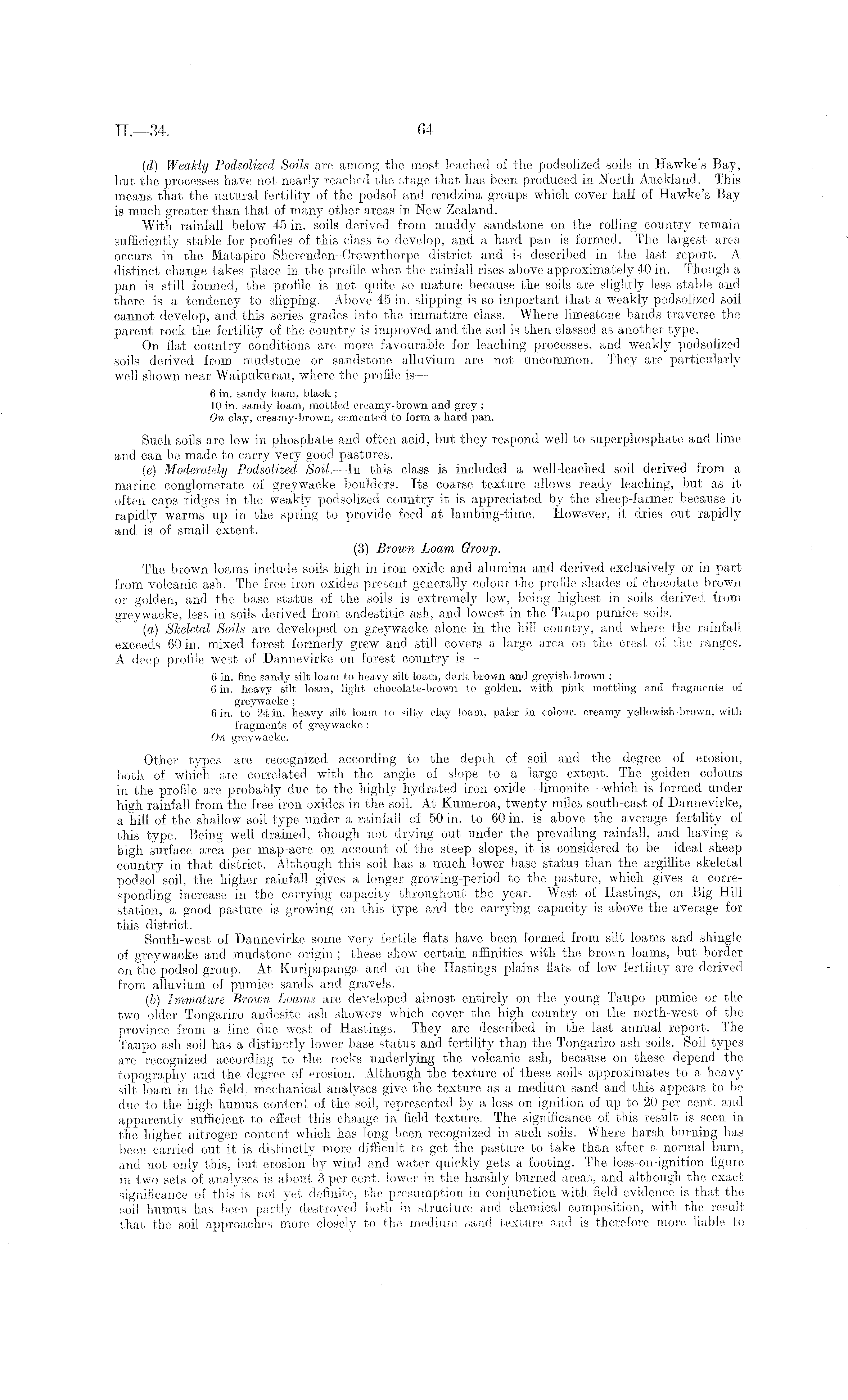 (d) Weakly Podsolized Soils are among the most leached of the podsolized soils in Hawke's Bay, but the processes have not nearly reached the stage that has been produced in North Auckland. This means that the natural fertility of the podsol and. rendzina groups which cover half of Hawke's Bay is much greater than that of many other areas in New Zealand. With rainfall beloW 45 in. soils derived from muddy sandstone on the rolling country remain sufficiently stable for profiles of this class to develop, and a hard pan is formed. The largest area occurs in the Matapiro-Sherenden-Crownthorpe district and is described in the last report. A distinct change takes place in the profile when the rainfall rises above approximately 40 in. Though a pan is still formed, the profile is not quite so mature because the soils are slightly less stable and there is a tendency to slipping. Above 45 in. slipping is so important that a weakly podsolized soil cannot develop, and this series grades into the immature class. Where limestone bands traverse the parent rook the fertility of the country is improved and the soil is then classed as another type. On flat country conditions are more favourable for leaching processes, and weakly podsolized soils derived from mudstone or sandstone alluvium are not uncommon. They are particularly well shown near Waipukurau, where the profile is— 6 in. sandy loam, black ; 10 in. sandy loam, mottled creamy-brown and grey ; On clay, creamy-brown, cemented to form a hard pan. Such soils are low in phosphate and often acid, but they respond well to superphosphate and lime and can be made to carry very good pastures. (e) Moderately Podsolized Soil. —In this class is included a well-leached soil derived from a marine conglomerate of greywacke boulders. Its coarse texture allows ready leaching, but as it often caps ridges in the weakly podsolized country it is appreciated by the sheep-farmer because it rapidly warms up in the spring to provide feed at lambing-time. However, it dries out rapidly and is of small extent. (3) Brown Loam Group. The brown loams include soils high in iron oxide and alumina and derived exclusively or in part from volcanic ash. The free iron oxides present generally colour the profile shades of chocolate brown or golden, and the base status of the soils is extremely low, being highest in soils derived from greywacke, less in soils derived from andestitic ash, and lowest in the Taupo pumice soils. (a) Skeletal Soils are developed on greywacke alone in the hill country, and where the rainfall exceeds 60 in. mixed forest formerly grew and still covers a large area on the crest of the ranges. A deep profile west of Dannevirke on forest country is— 6 in. fine sandy silt loam to heavy silt loam, dark brown and greyish-brown ; 6 in. heavy silt loam, light chocolate-brown to golden, with pink mottling and fragments of greywacke; 6 in. to 24 in. heavy silt loam to silty clay loam, paler in colour, creamy yellowish-brown, with fragments of greywacke ; On greywacke. Other types are recognized according to the depth of soil and the degree of erosion, both of which are correlated with the angle of slope to a large extent. The golden colours in the profile are probably due to the highly hydrated iron oxide —limonite —which is formed under high rainfall from the free iron oxides in the soil. At Kumeroa, twenty miles south-east of Dannevirke, a hill of the shallow soil type under a rainfall of 50 in. to 60 in. is above the average fertility of this type. Being well drained, though not drying out under the prevailing rainfall, and having a high surface area per map-acre on account of the steep slopes, it is considered to be ideal sheep country in that district. Although this soil has a much lower base status than the argillite skeletal podsol soil, the higher rainfall gives a longer growing-period to the pasture, which gives a corresponding increase in the carrying capacity throughout the year. West of Hastings, on Big Hill station, a good pasture is growing on this type and the carrying capacity is above the average for this district. South-west of Dannevirke some very fertile flats have been formed from silt loams and shingle of greywacke a"nd mudstone origin ; these show certain affinities with the brown loams, but border on the podsol group. At Kuripapanga and on the Hastings plains flats of low fertility are derived from alluvium of pumice sands and gravels. (b) Immature Brown Loams are developed almost entirely on the young Taupo pumice or the two older Tongariro andesite ash showers which cover the high country on the north-west of the province from a line due west of Hastings. They are described in the last annual report. The Taupo ash soil has a distinctly lower base status and fertility than the Tongariro ash soils. Soil types are recognized according to the rocks underlying the volcanic ash, because on these depend the topography and the degree of erosion. Although the texture of these soils approximates to a heavy silt loam in the field, mechanical analyses give the texture as a medium sand and this appears to be due to the high humus content of the soil, represented by a loss on ignition of up to 20 per cent, and apparently sufficient to effect this change in field texture. The significance of this result is seen in the higher nitrogen content which has long been recognized in such soils. Where harsh burning has been carried out it is distinctly more difficult to get the pasture to take than after a normal burn, and not only this, but erosion by wind and water quickly gets a footing. The loss-on-ignition figure in two sets of analyses is about 3 per cent, lower in the harshly burned areas, and although the exact significance of this is not yet definite, the presumption in conjunction with field evidence is that the soil humus has been partly destroyed both in structure and chemical composition, with the resultthat the soil approaches more closely to th