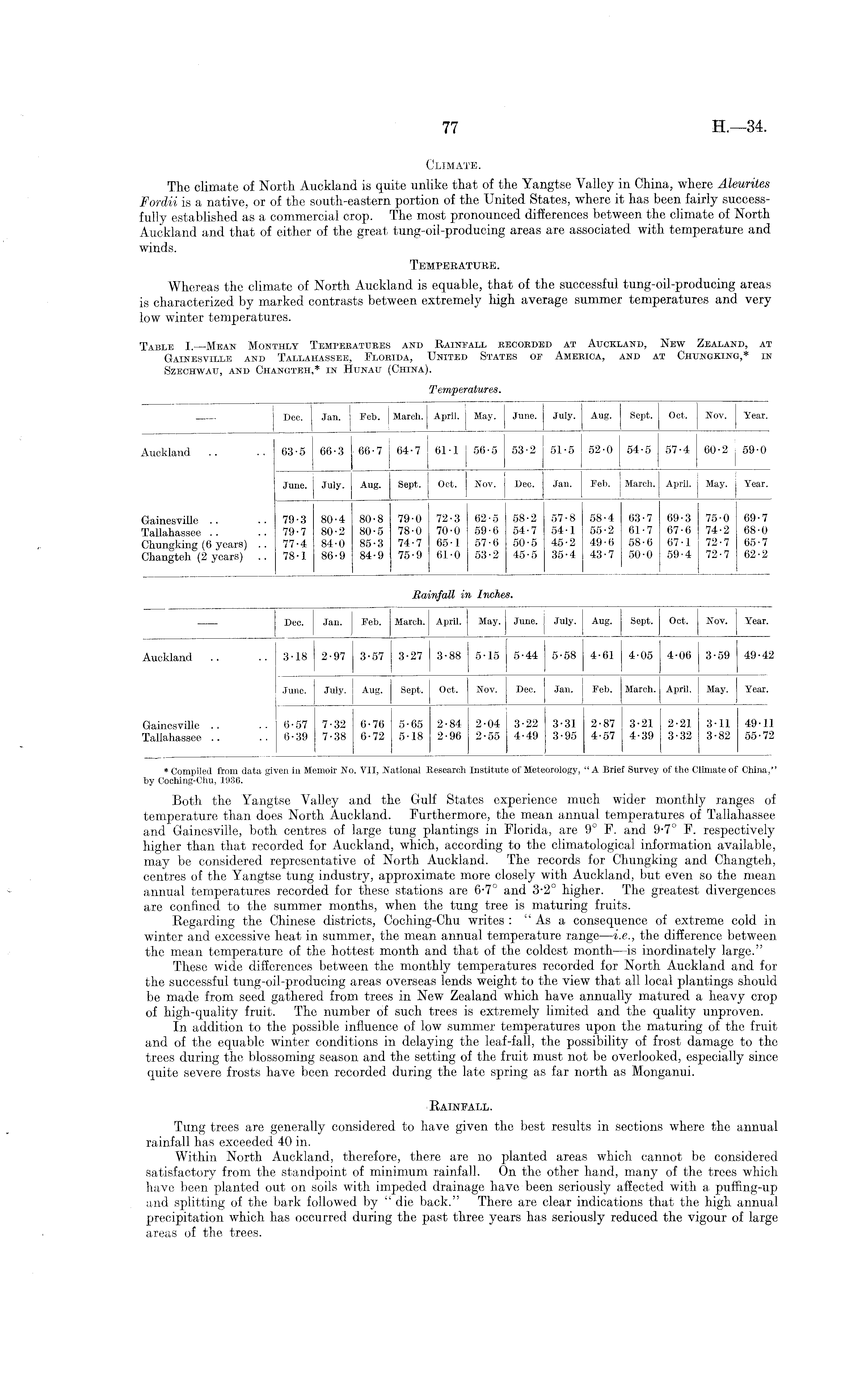 Climate. The climate of North Auckland is quite unlike that of the Yangtse Valley in China, where Aleurites Fordii is a native, or of the south-eastern portion of the United States, where it has been fairly successfully established as a commercial crop. The most pronounced differences between the climate of North Auckland and that of either of the great tung-oil-producing areas are associated with temperature and winds. Temperature. Whereas the climate of North Auckland is equable, that of the successful tung-oil-producing areas is characterized by marked contrasts between extremely high average summer temperatures and very low winter temperatures.