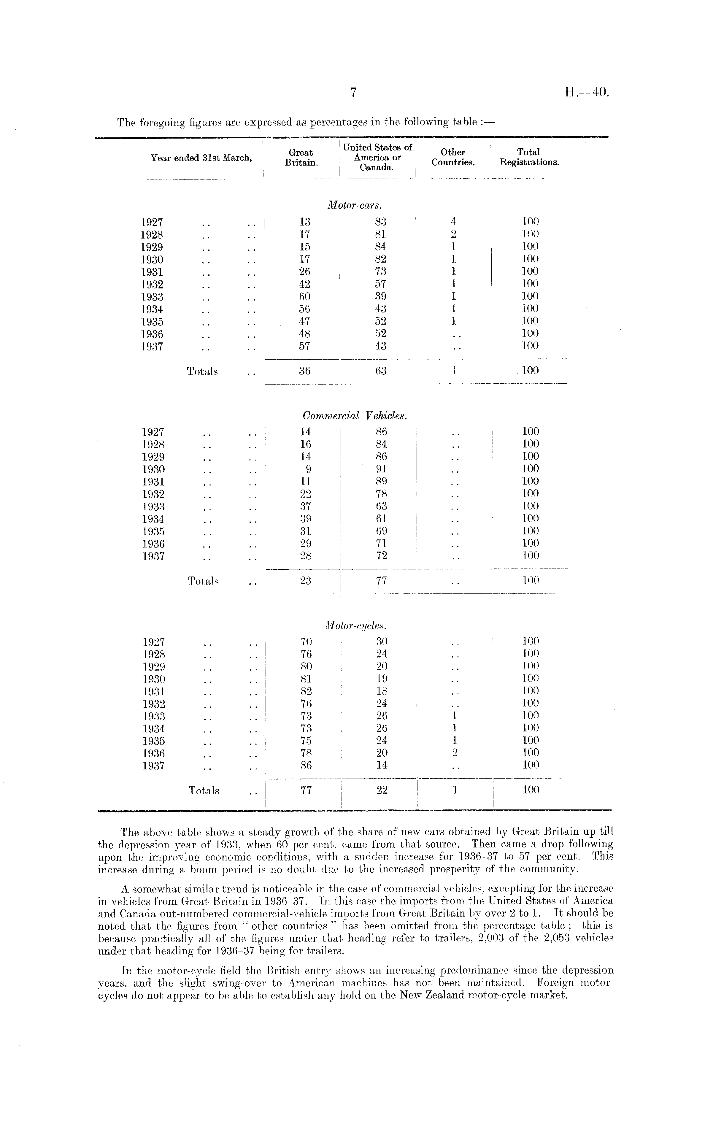 p , United States of n ,, _ T , „, Year ended 31st March, I Br [ tain Countries. Registrations. Motor-cars. 1927 .. ..13 83 4 100 1928 .... 17 81 2 100 1929 .... 15 84 1 100 1930 .... 17 82 1 100 1931 .... 26 73 1 100 1932 .... 42 57 1 100 1933 .... 60 39 1 100 1934 .. ..56 43 1 100 1935 .... 47 52 1 100 1936 .. .. 48 52 .. 100 1937 .... 57 43 .. 100 Totals .. 36 63 1 100 Commercial Vehicles. 1927 .. .. j 14 86 .. 100 1928 .. .. 1 16 84 .. 100 1929 .. .. 14 86 100 1930 .. .. 9 91 .. 100 1931 .. .. 11 89 .. 100 1932 .... 22 78 .. 100 1933 .. ..37 63 .. 100 1934 .. .. 39 61 .. 100 1935 .. .. 31 69 .. 100 1936 .. .. 29 71 .. 100 1937 .... 28 72 .. 100 Totals .. 23 77 .. 100 Motor-cycles. 1927 .. .. 70 30 .. ' 100 1928 .. .. 76 24 .. 100 1929 .. .. 80 20 .. 100 1930 .. .. 81 19 .. 100 1931 .. .. 82 ! 18 .. 100 1932 .. .. 76 24 .. 100 1933 .... 73 26 1 100 1934 .... 73 26 1 100 1935 .... 75 24 1 100 1936 .... 78 20 2 100 1937 .. .. 86 14 .. 100 Totals 77 22 1 100